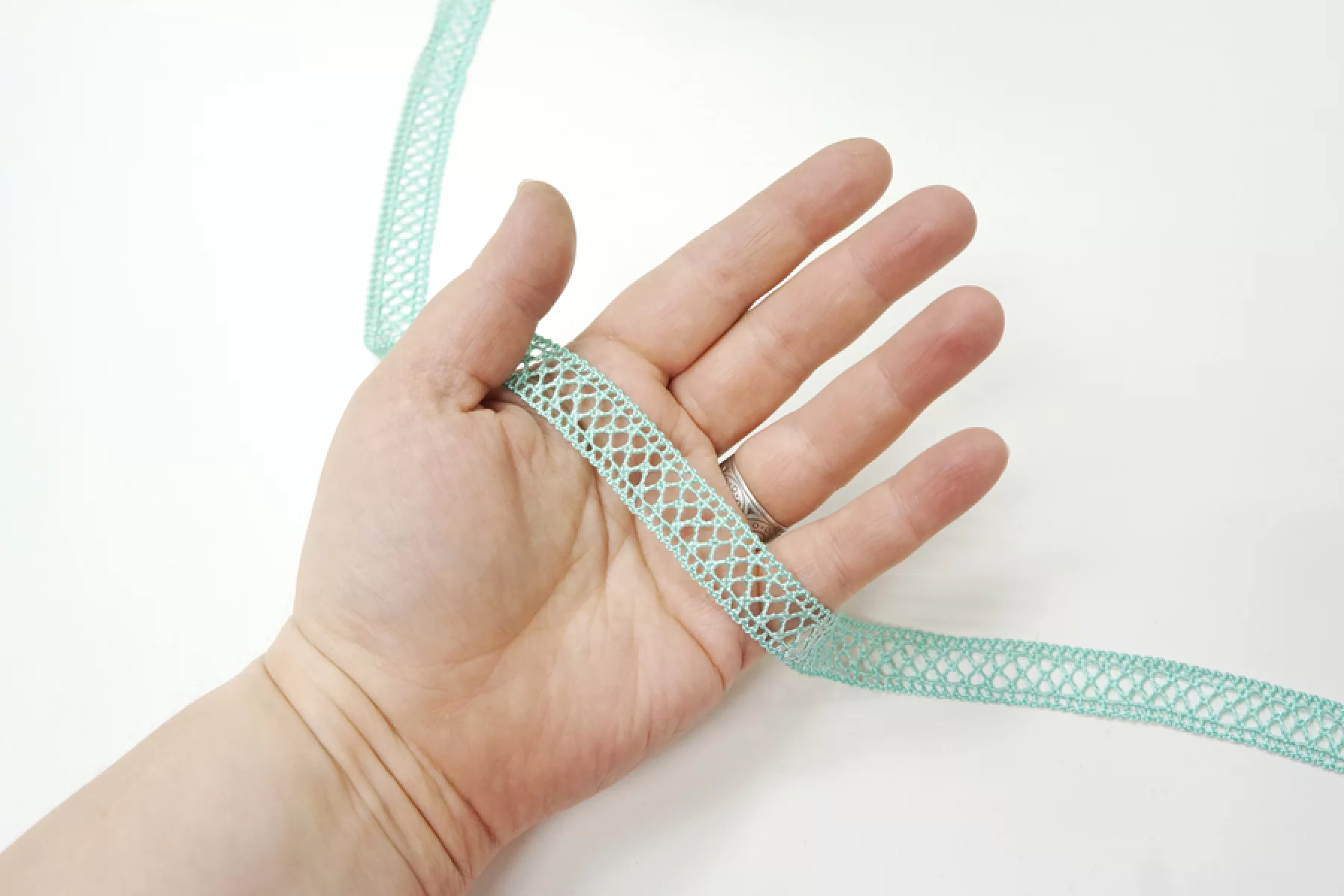 Итальянское кружево мятного цвета. Мягкое, пластичное.. Отлично подойдет для пошива нижнего белья, отделки одежды и аксессуаров.