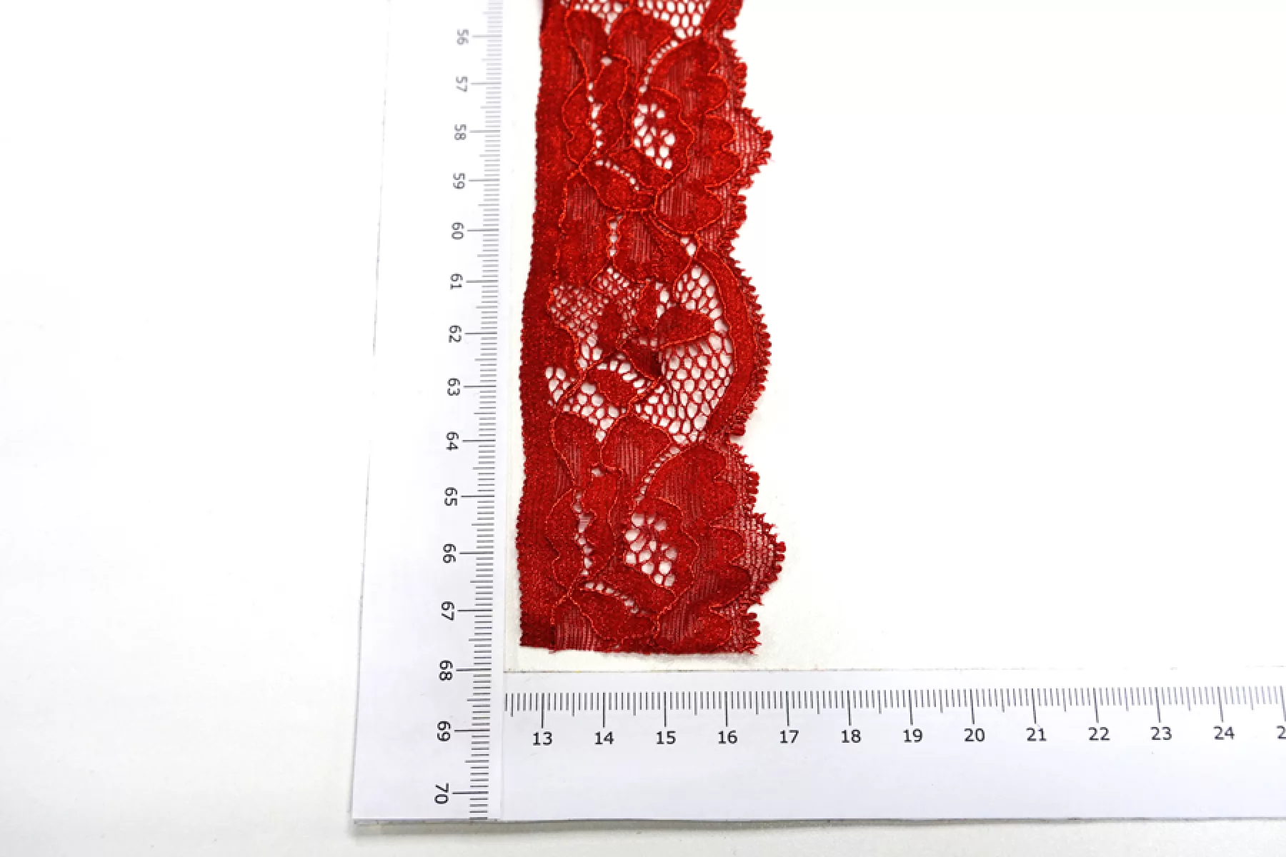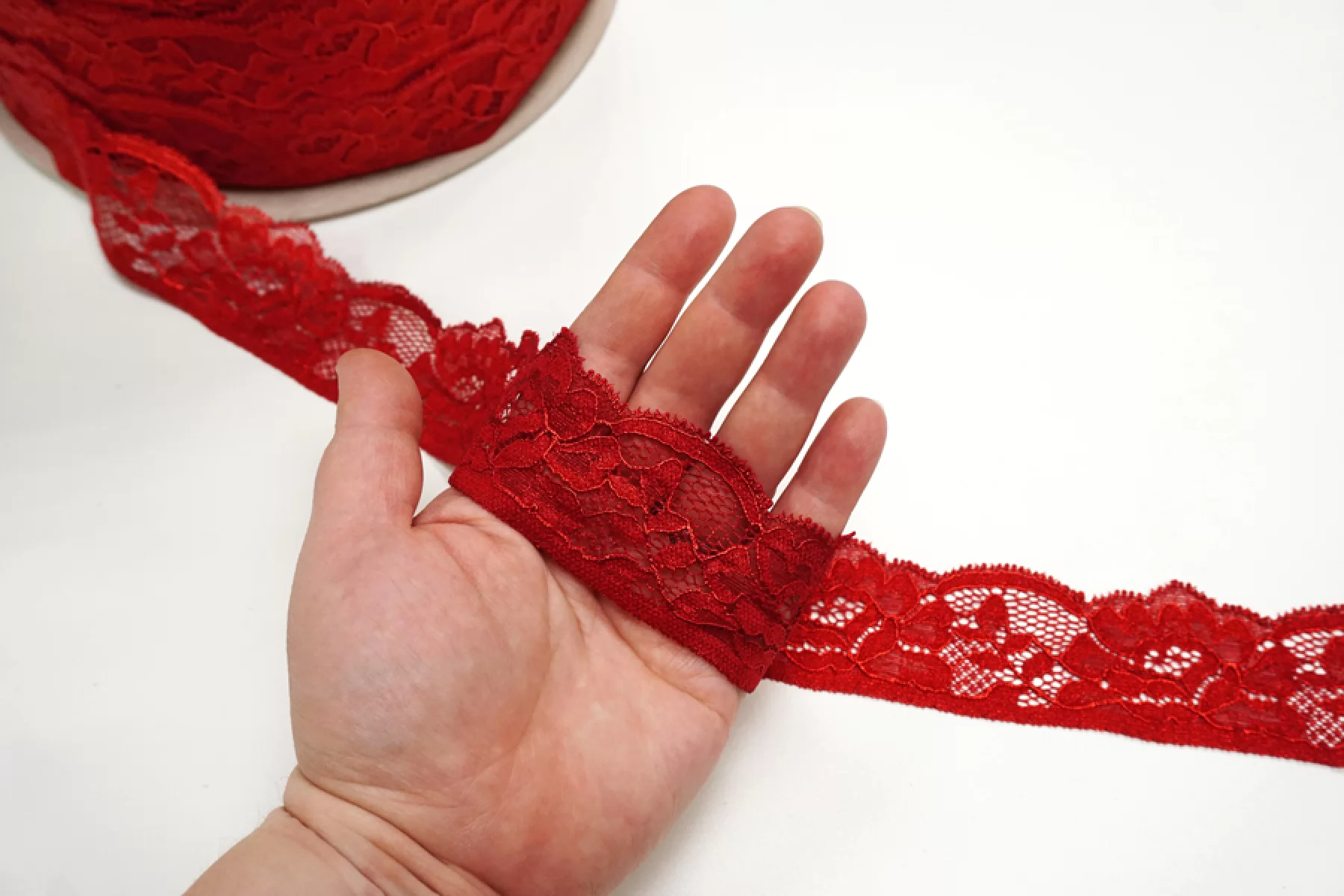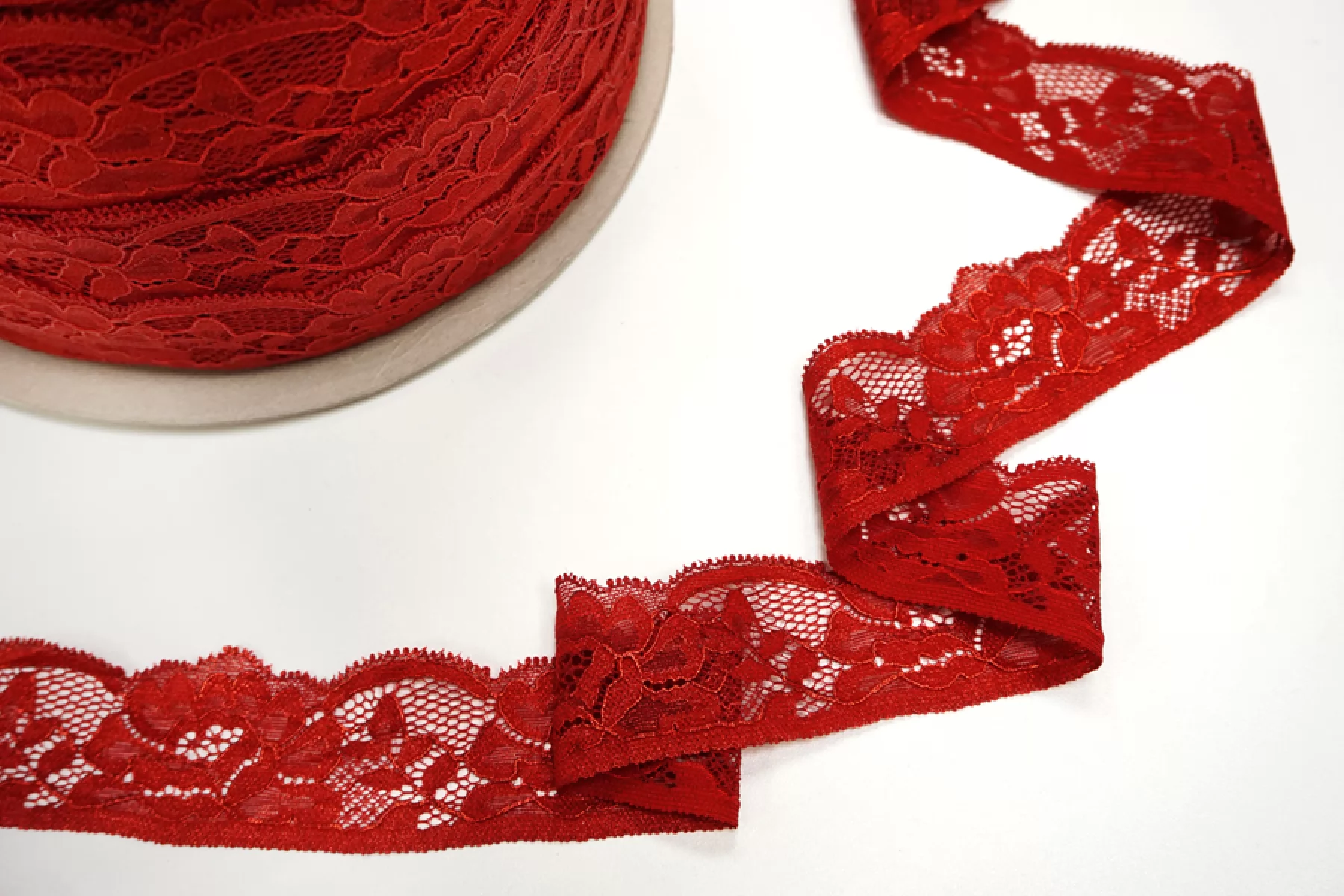 Итальянское кружево красного цвета с блеском. Жестковатое, но пластичное, неплохо держит форму. Отлично подойдет для пошива нижнего белья, отделки одежды и аксессуаров.
