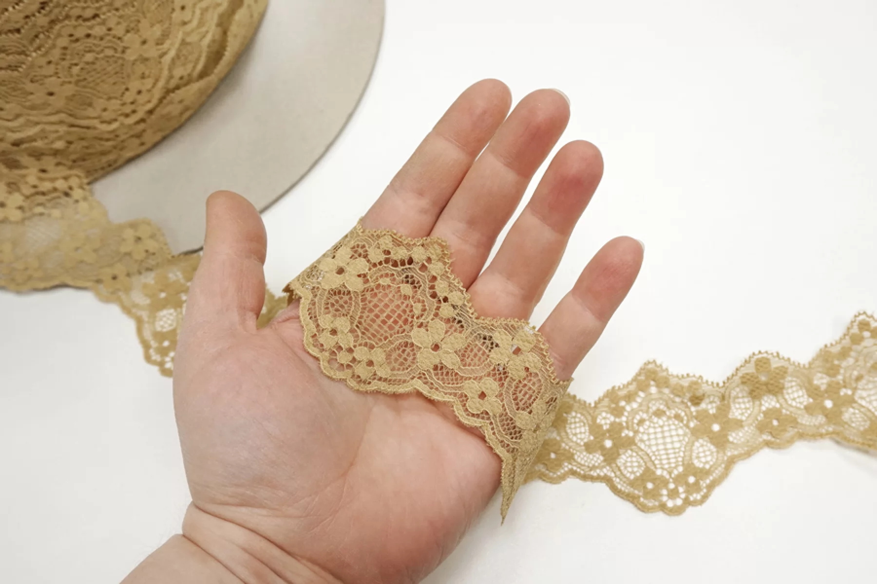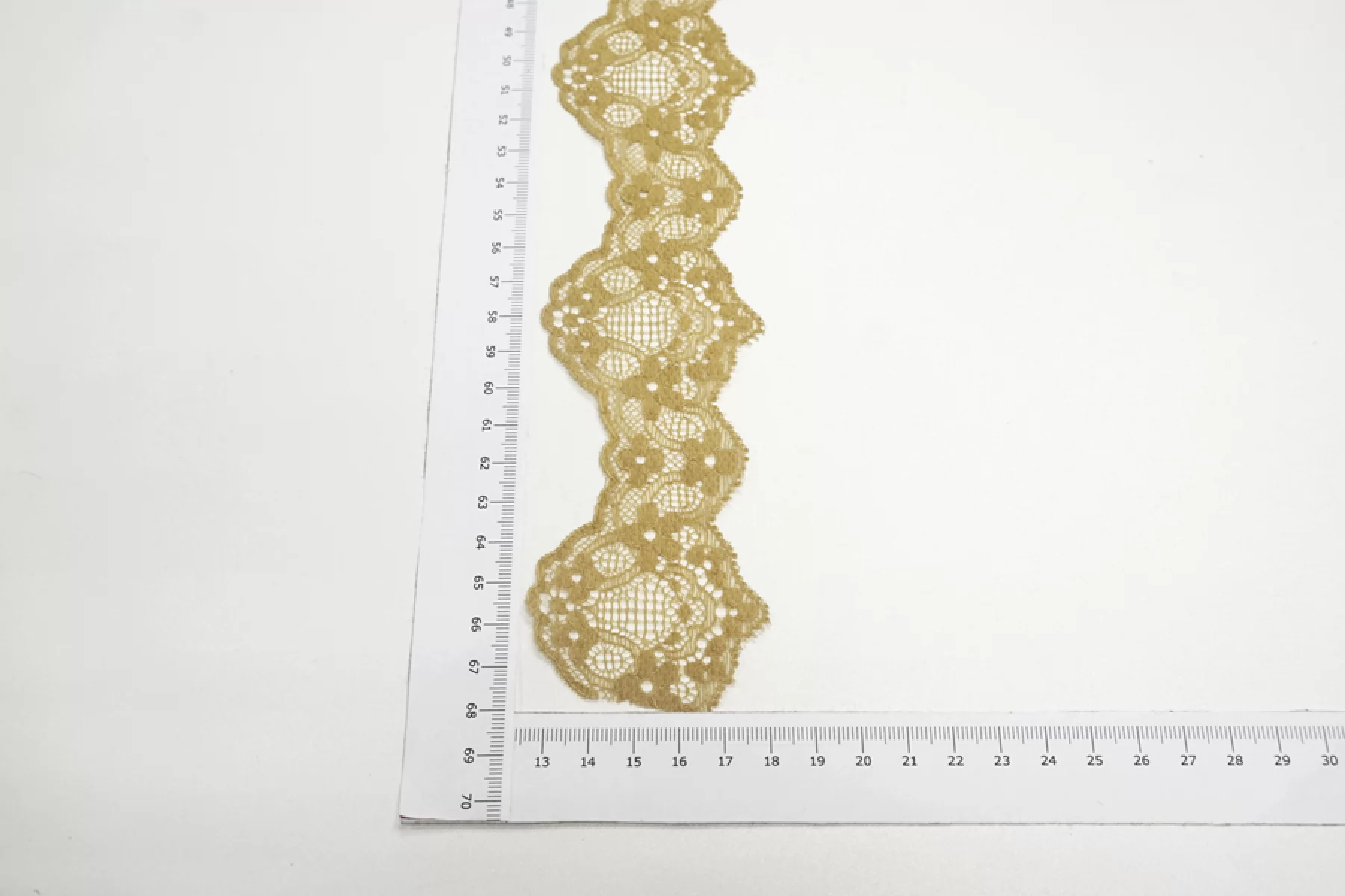 Итальянское кружево цвета крем-брюле с легкой зеленцой. немного жесткое, но пластичное. Отлично подойдет для пошива нижнего белья, отделки одежды и аксессуаров.