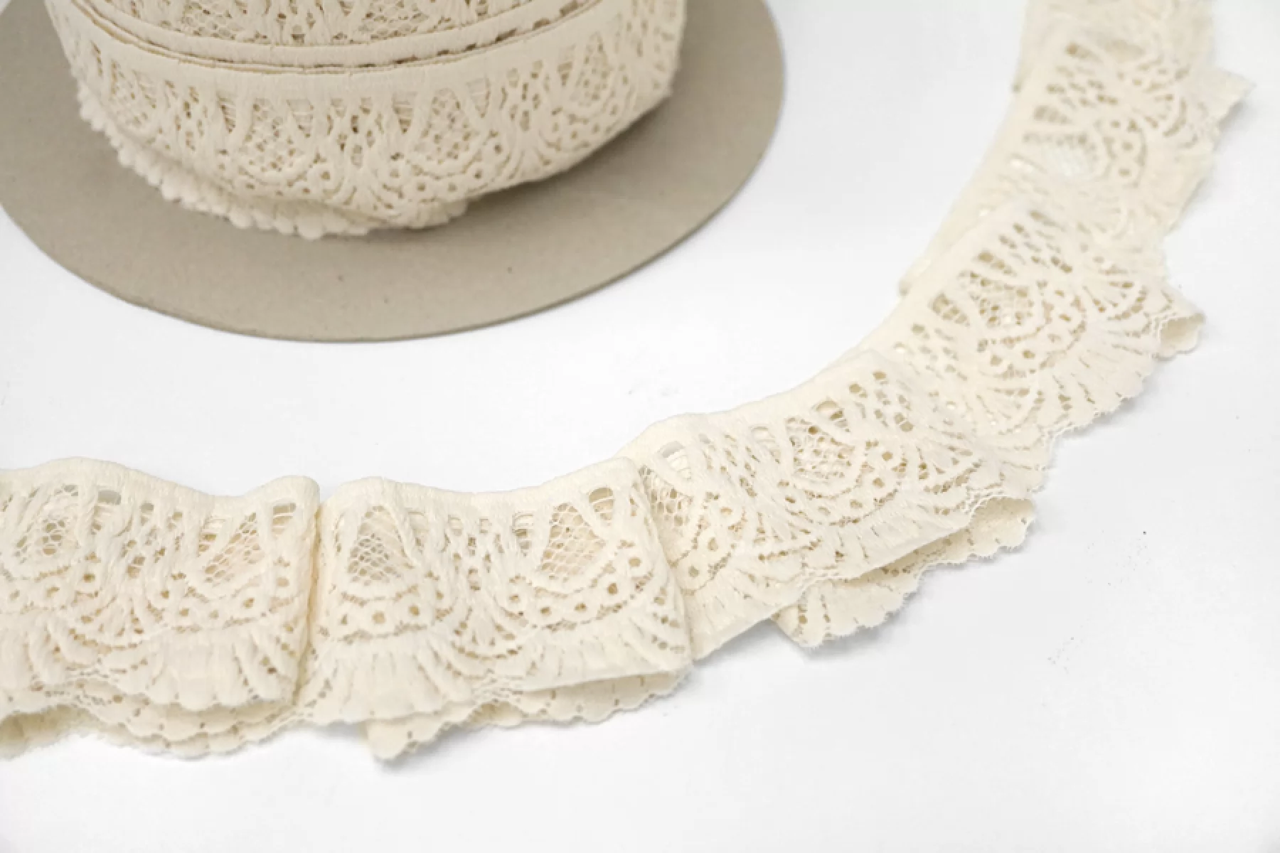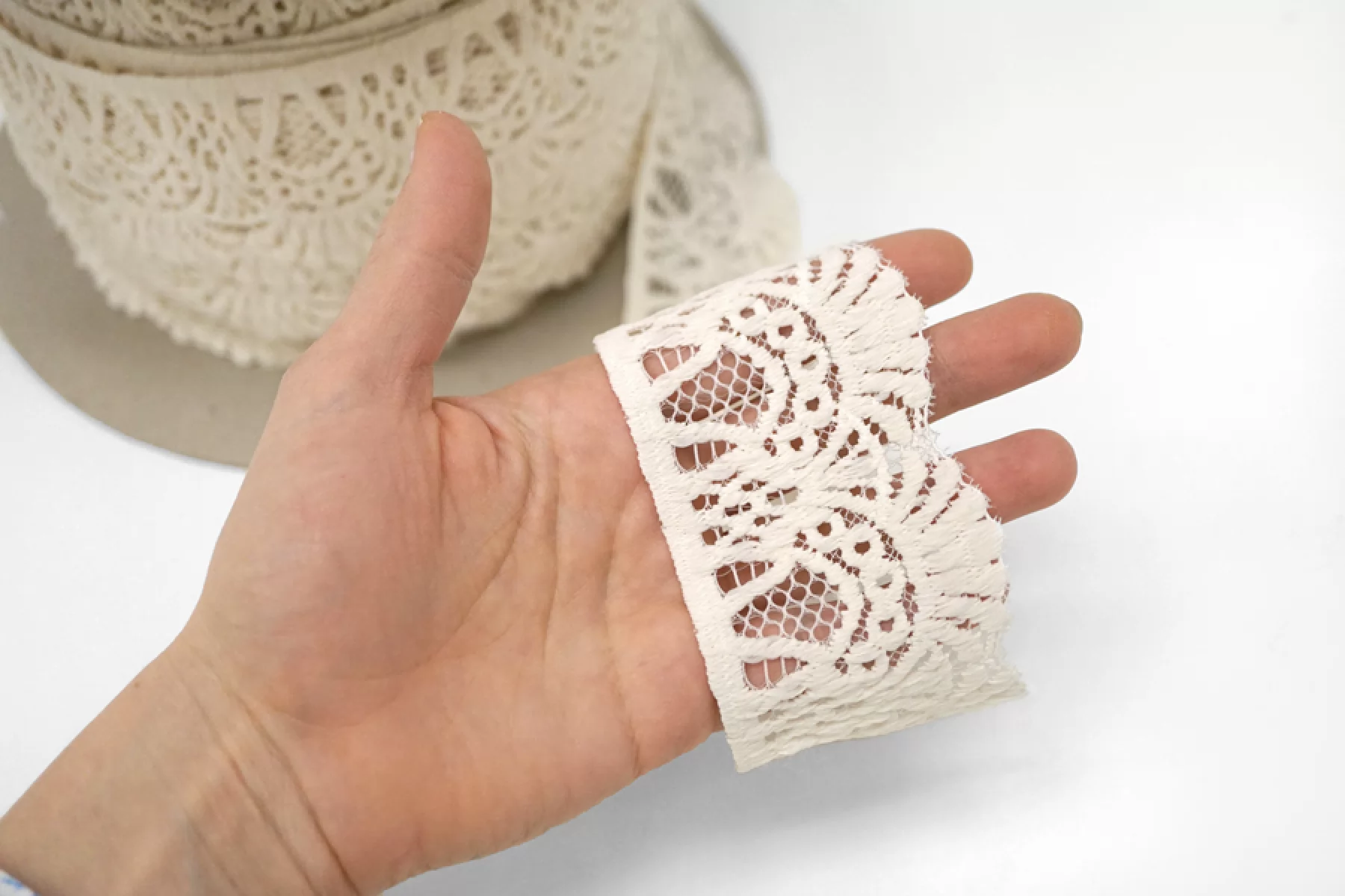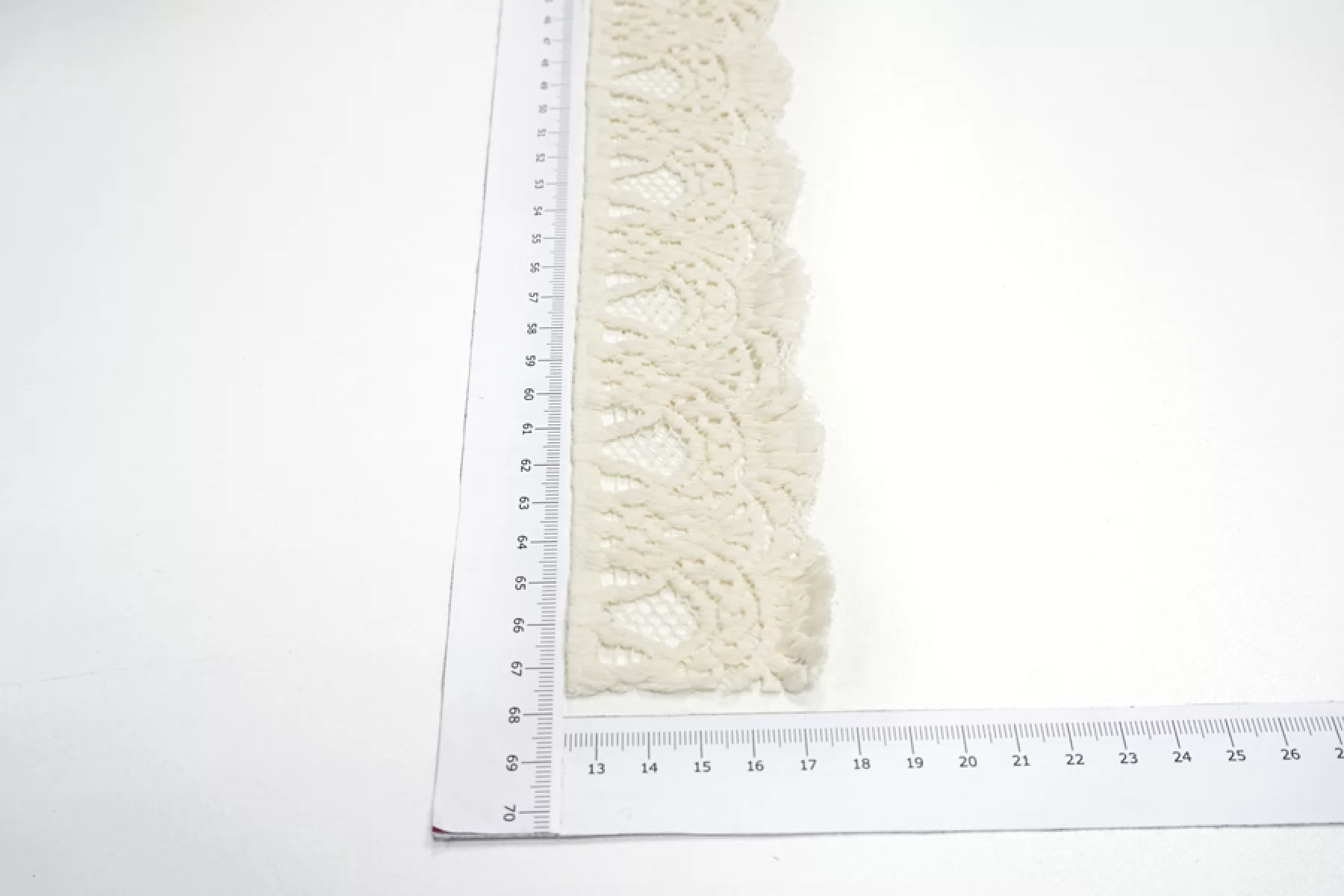 Итальянское кружево кремового цвета. Мягкое, пластичное. Отлично подойдет для пошива нижнего белья, отделки одежды и аксессуаров.