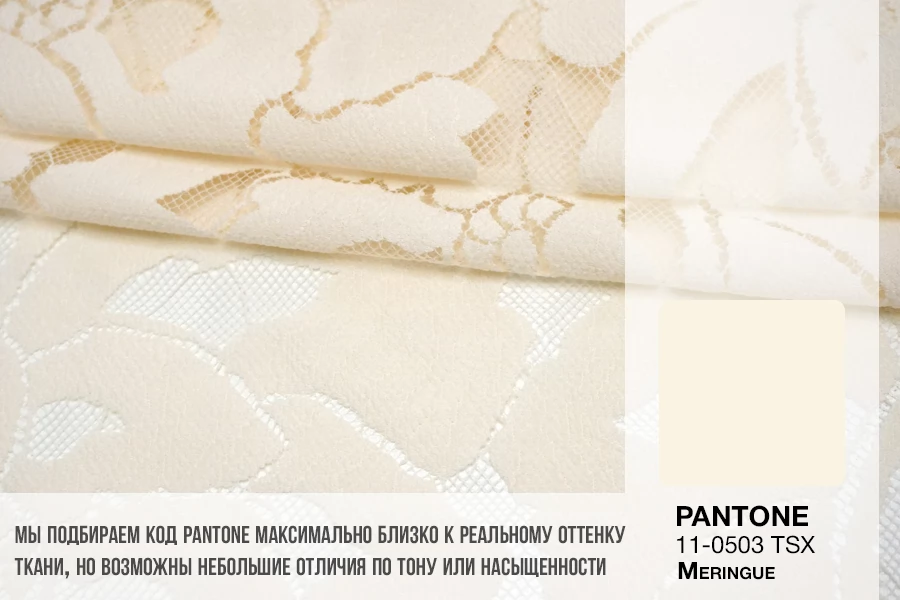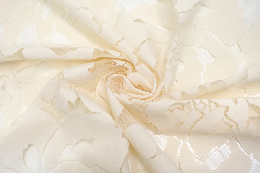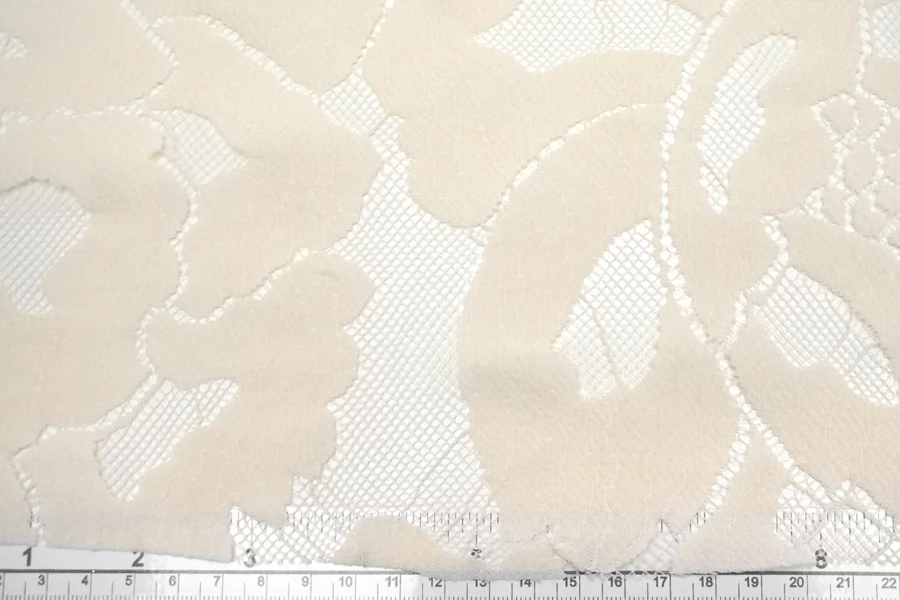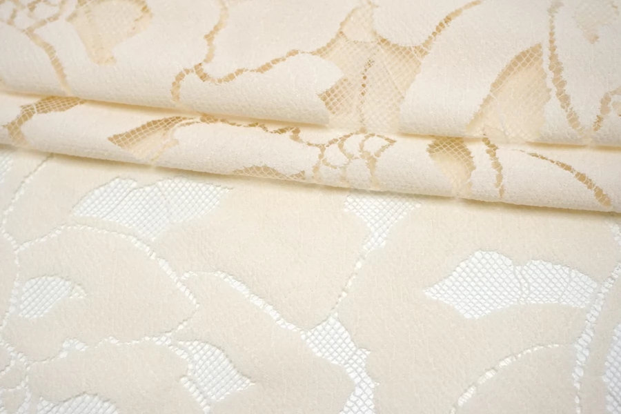 Прекрасное итальянское кружево в молочном цвете, с узором в виде крупных цветов. Мягкое, тактильно слегка суховато, прозрачное. Не мнется, форму не держит, хорошо драпируется. Отлично подойдет для пошива самостоятельного изделия (на подкладе), или отделки отдельных элементов одежды и аксессуаров.