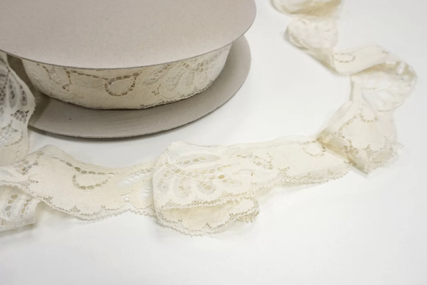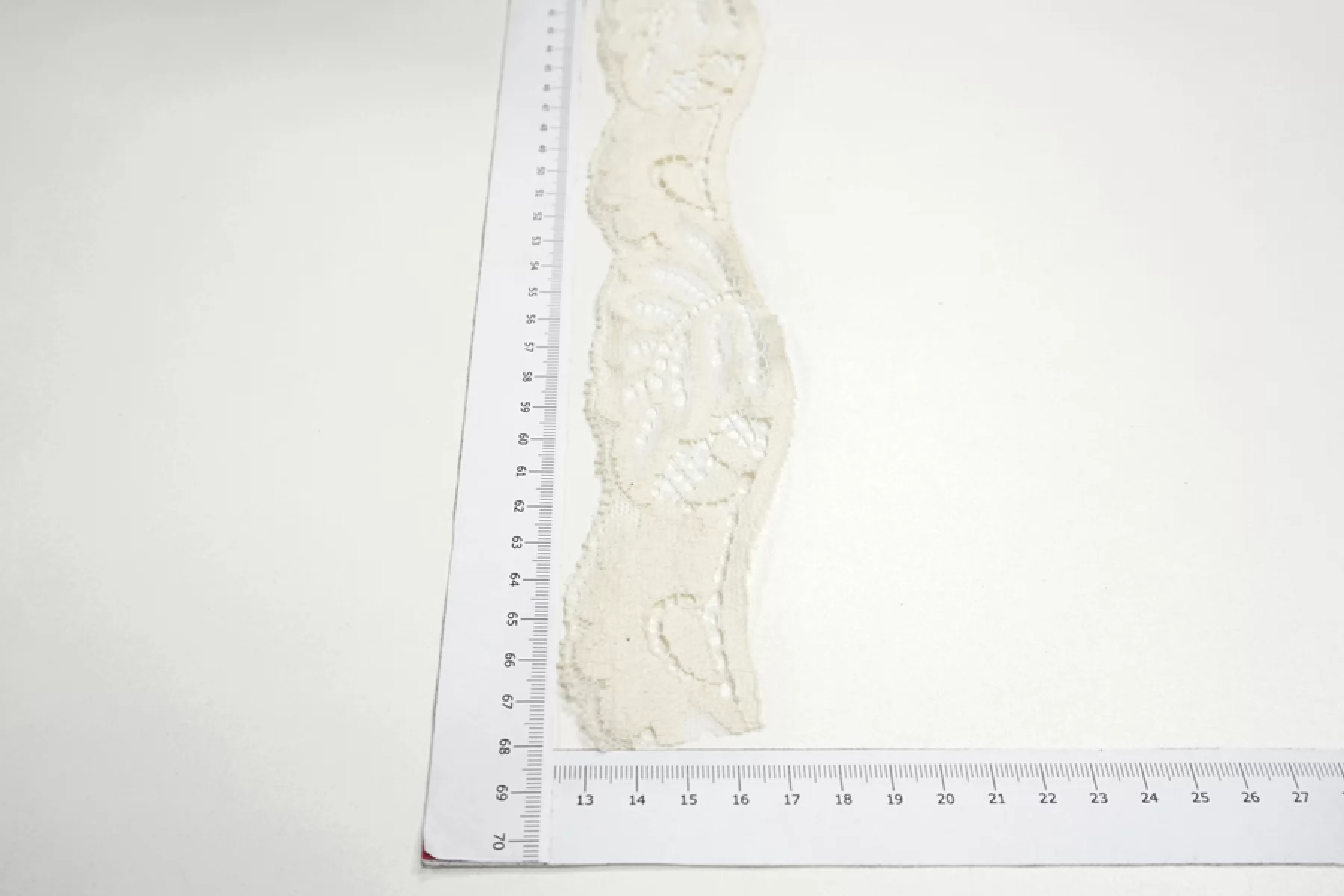 Итальянское кружево с нитями молочного и белого цвета. Слегка жесткое, пластичное. Отлично подойдет для пошива нижнего белья, отделки одежды и аксессуаров.