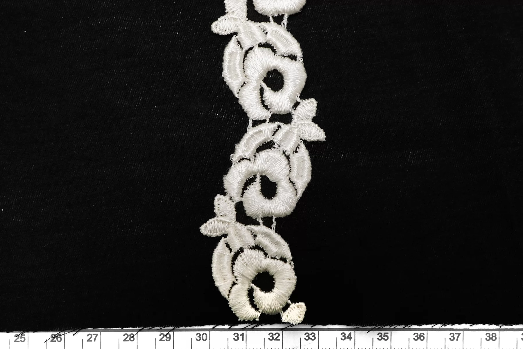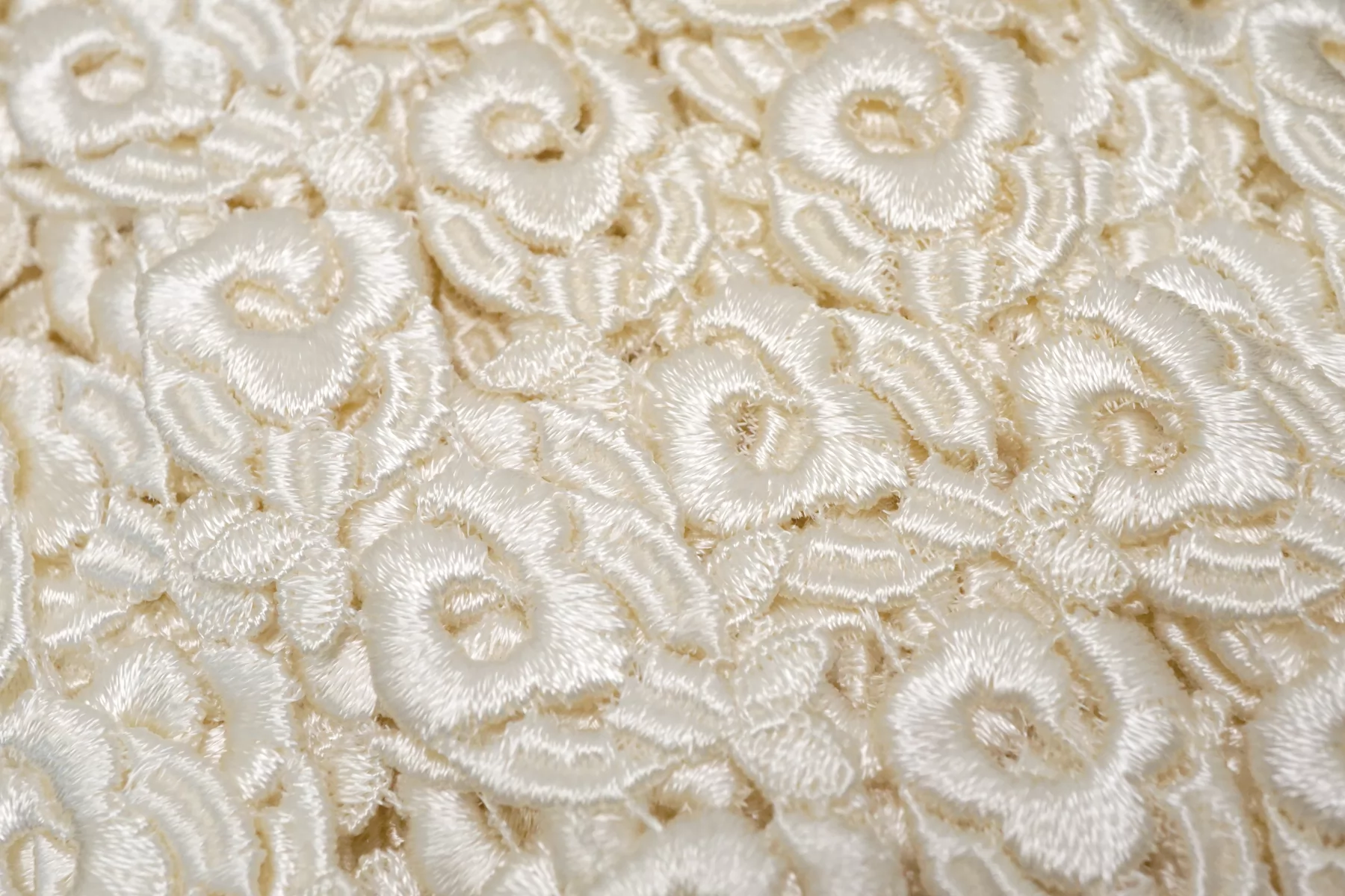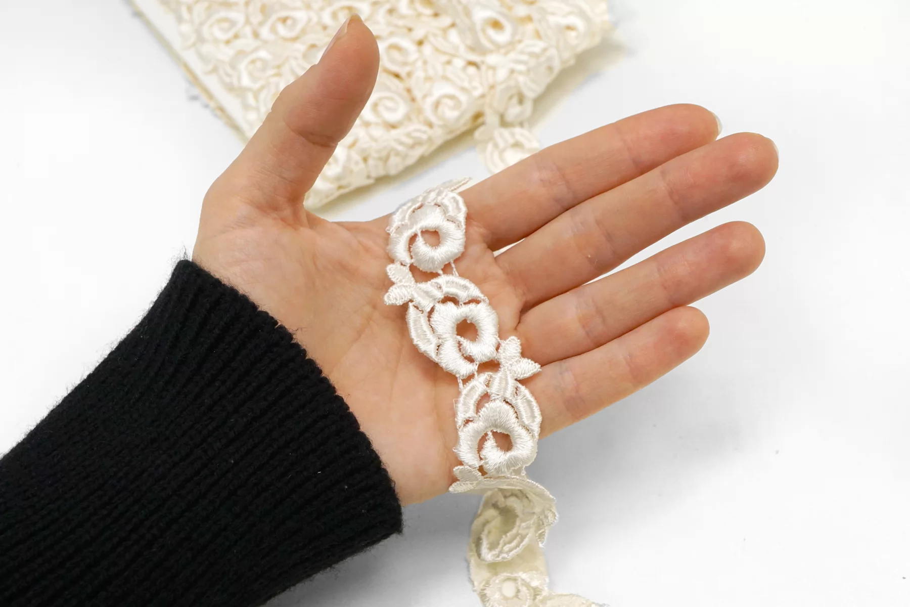 Итальянское кружево молочного цвета из хлопка. Умеренной пластичности. Не тянется. Отлично подойдет для отделки одежды и аксессуаров.