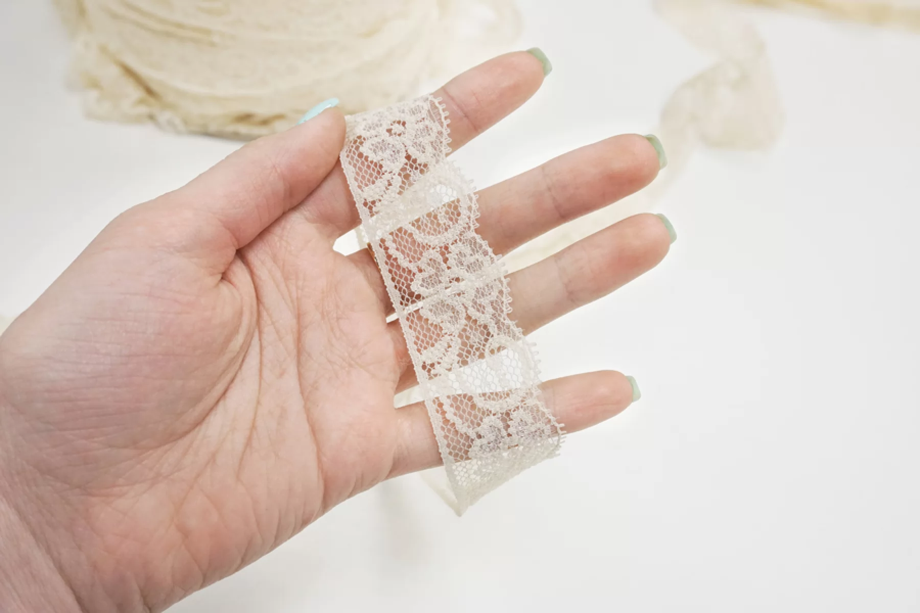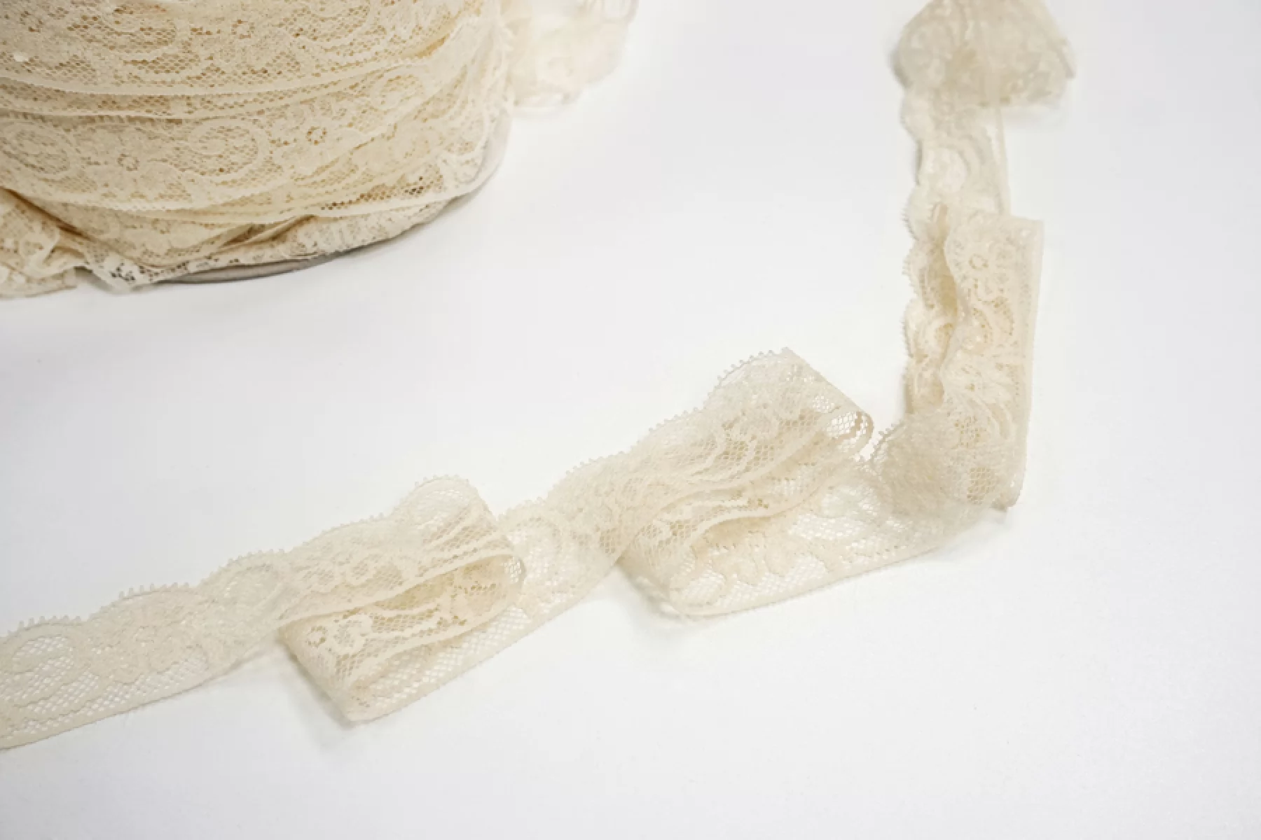 Итальянское кружево молочного цвета. Мягкое, пластичное. Отлично подойдет для пошива нижнего белья, отделки одежды и аксессуаров.
