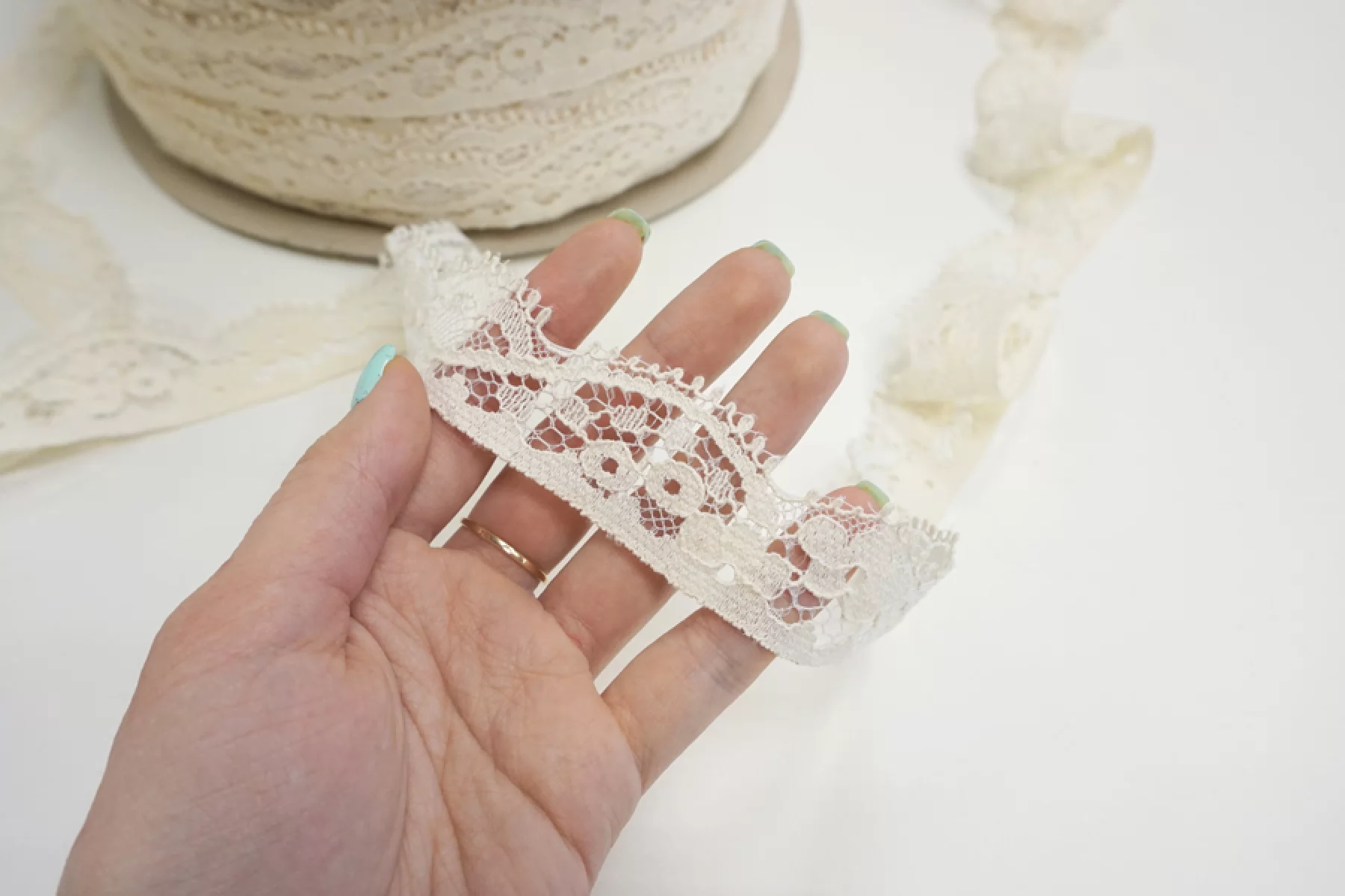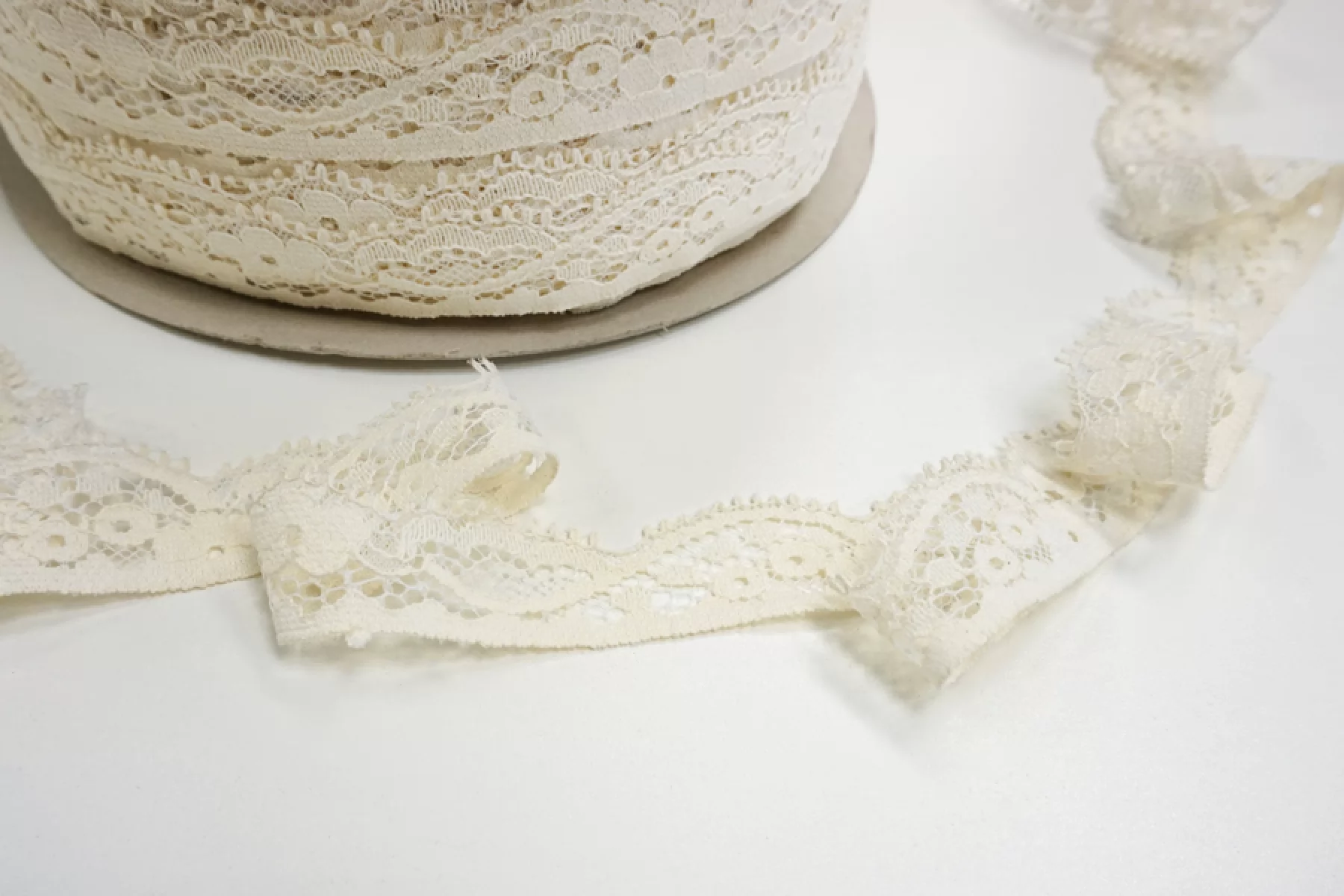 Итальянское кружево молочного цвета. Мягкое, пластичное. Отлично подойдет для пошива нижнего белья, отделки одежды и аксессуаров.