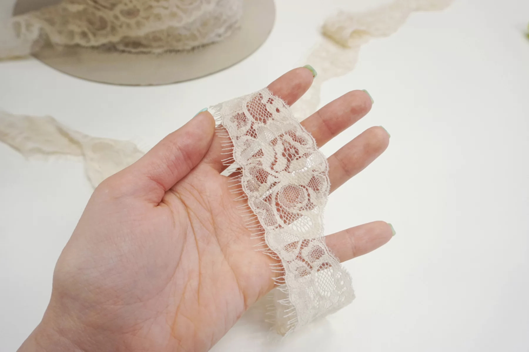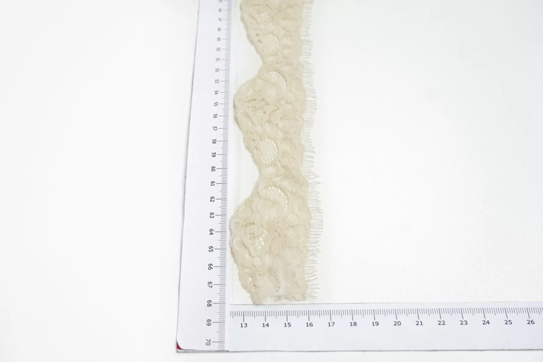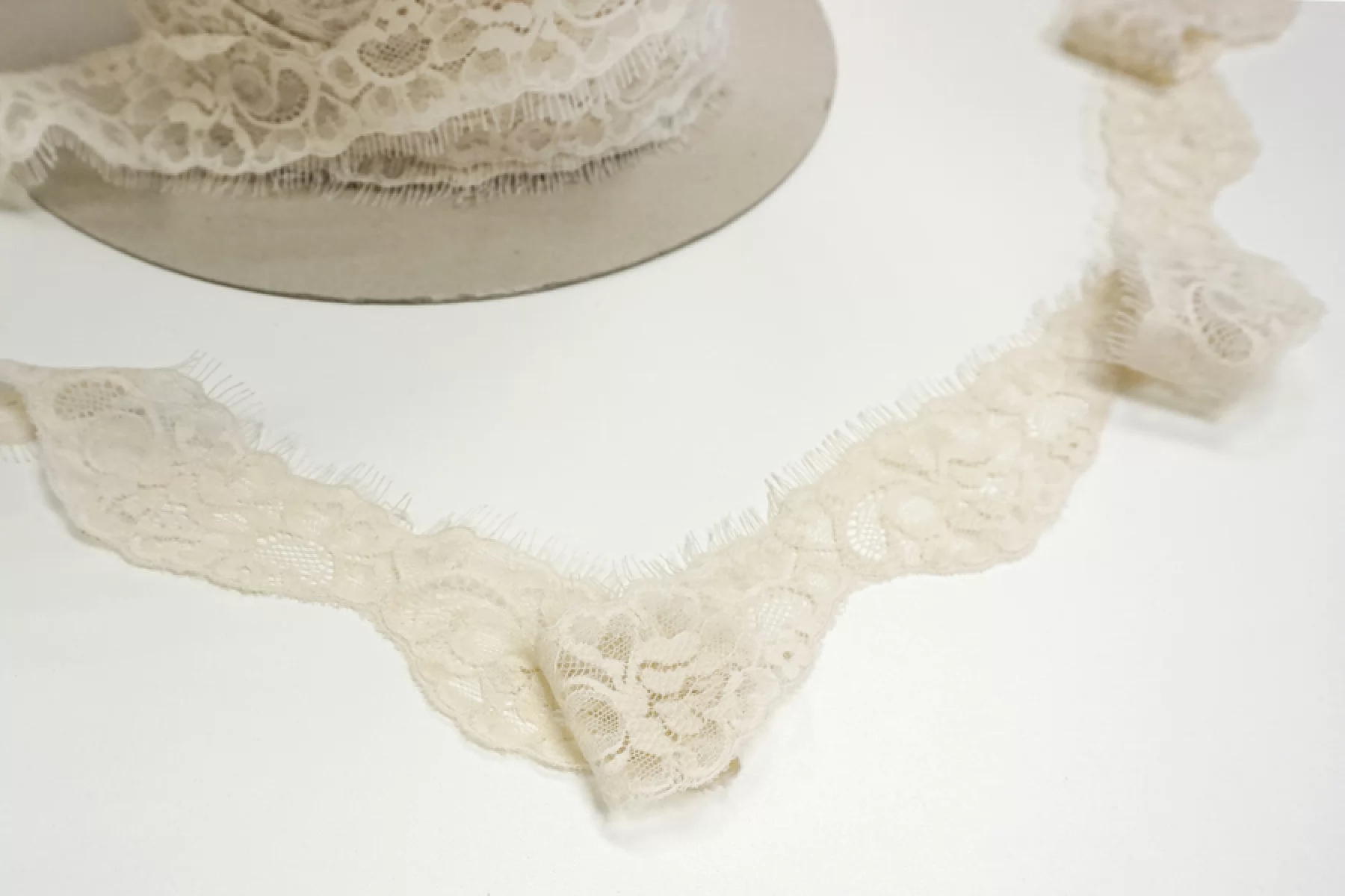 Итальянское кружево молочного цвета. Мягкое, пластичное, с жесткими "ресничками" по краю. Отлично подойдет для пошива нижнего белья, отделки одежды и аксессуаров.