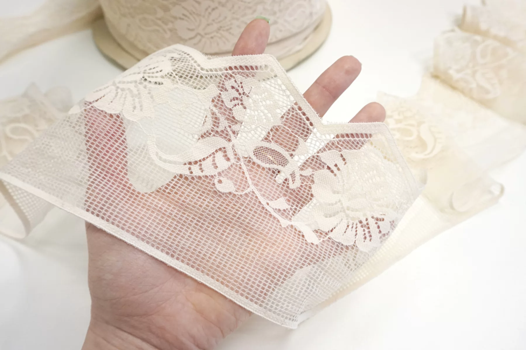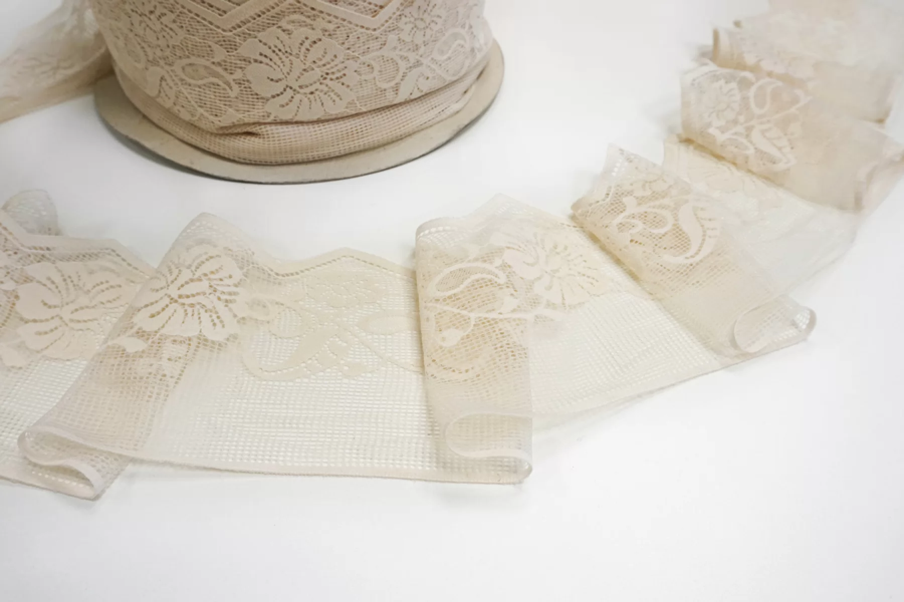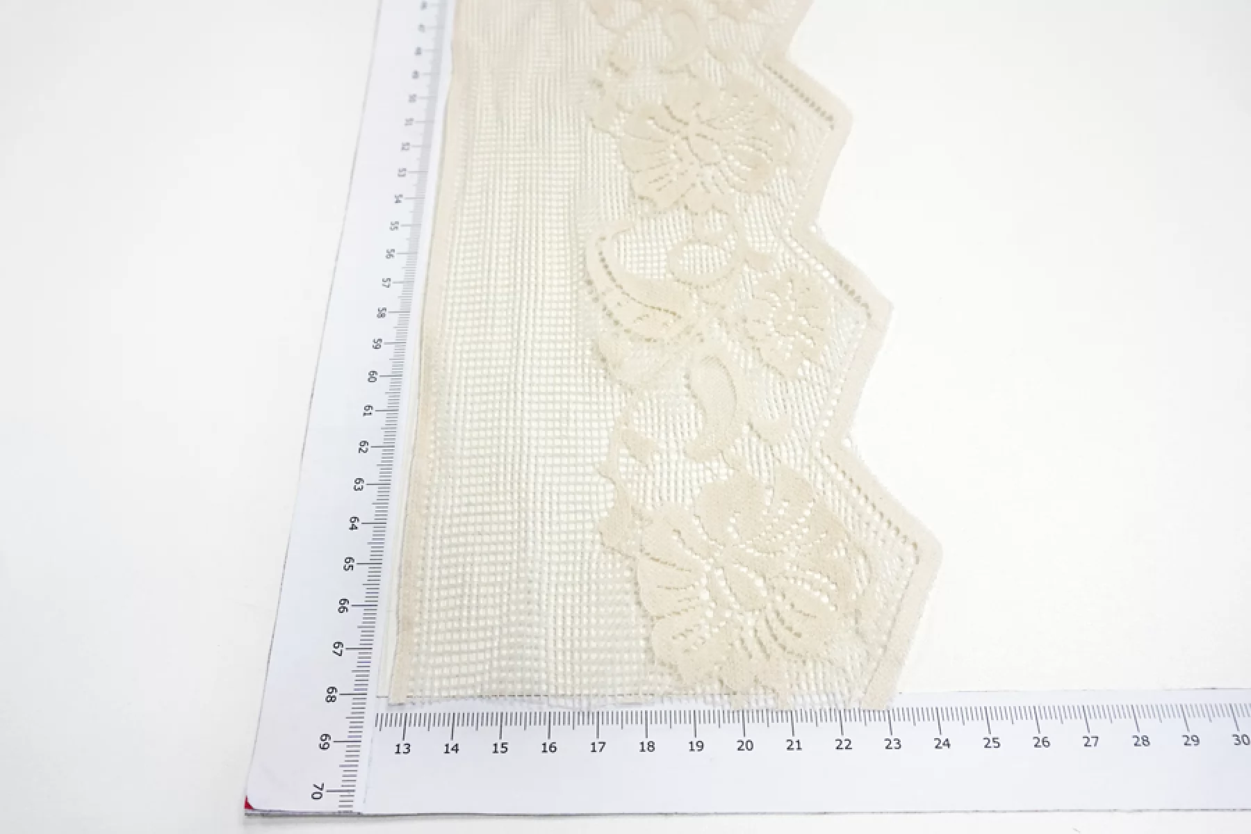 Итальянское кружево молочного цвета. Мягкое, пластичное, хорошо держит форму. Отлично подойдет для пошива нижнего белья, отделки одежды и аксессуаров.