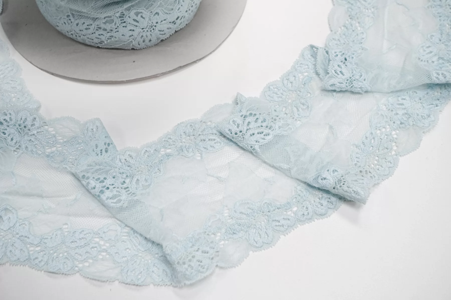 Итальянское кружево нежно-голубого цвета. Мягкое, пластичное. Отлично подойдет для пошива нижнего белья, отделки одежды и аксессуаров.