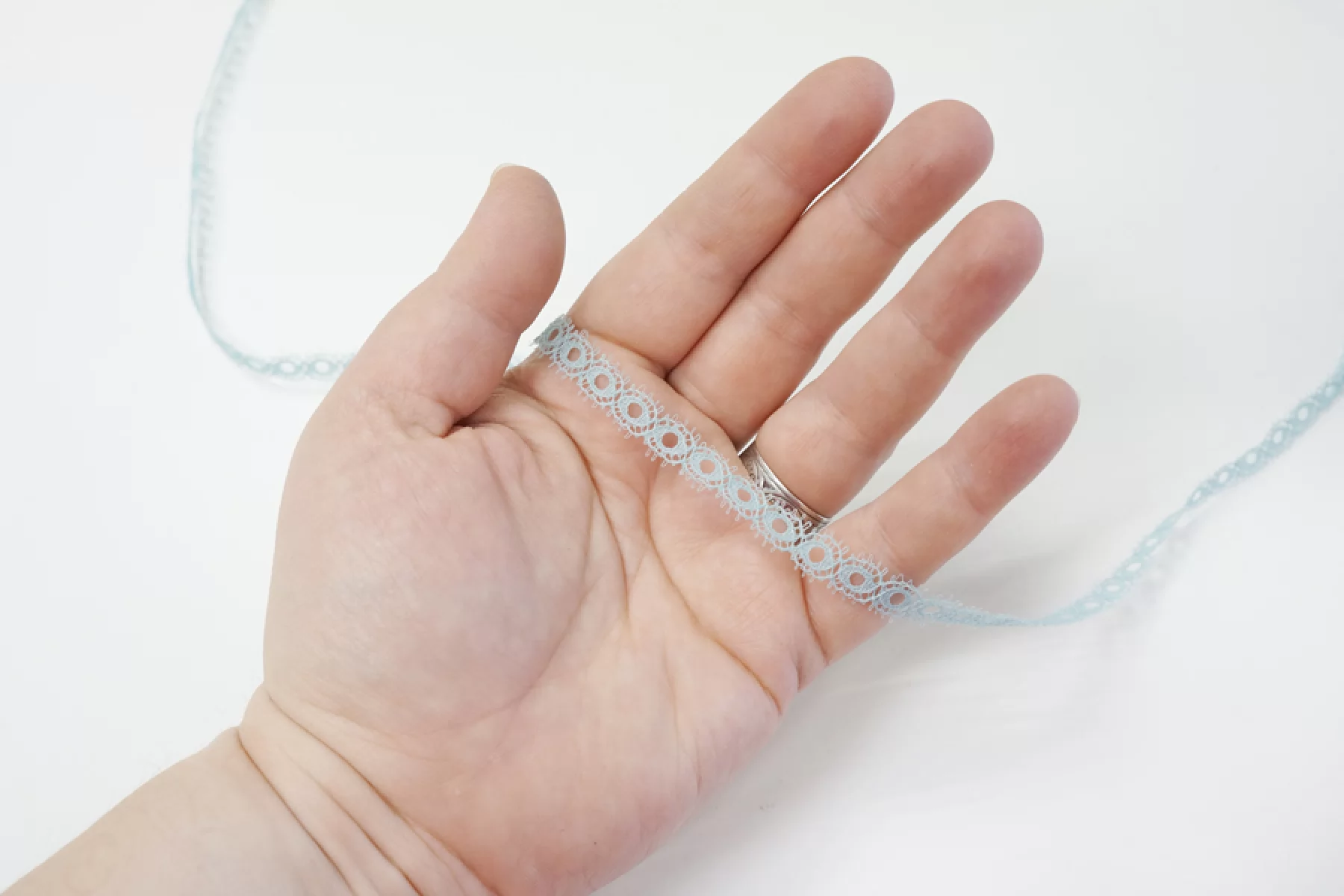 Итальянское кружево голубого цвета с зеленоватым подтоном цвета. Жестковатое, пластичное. Отлично подойдет для пошива нижнего белья, отделки одежды и аксессуаров.