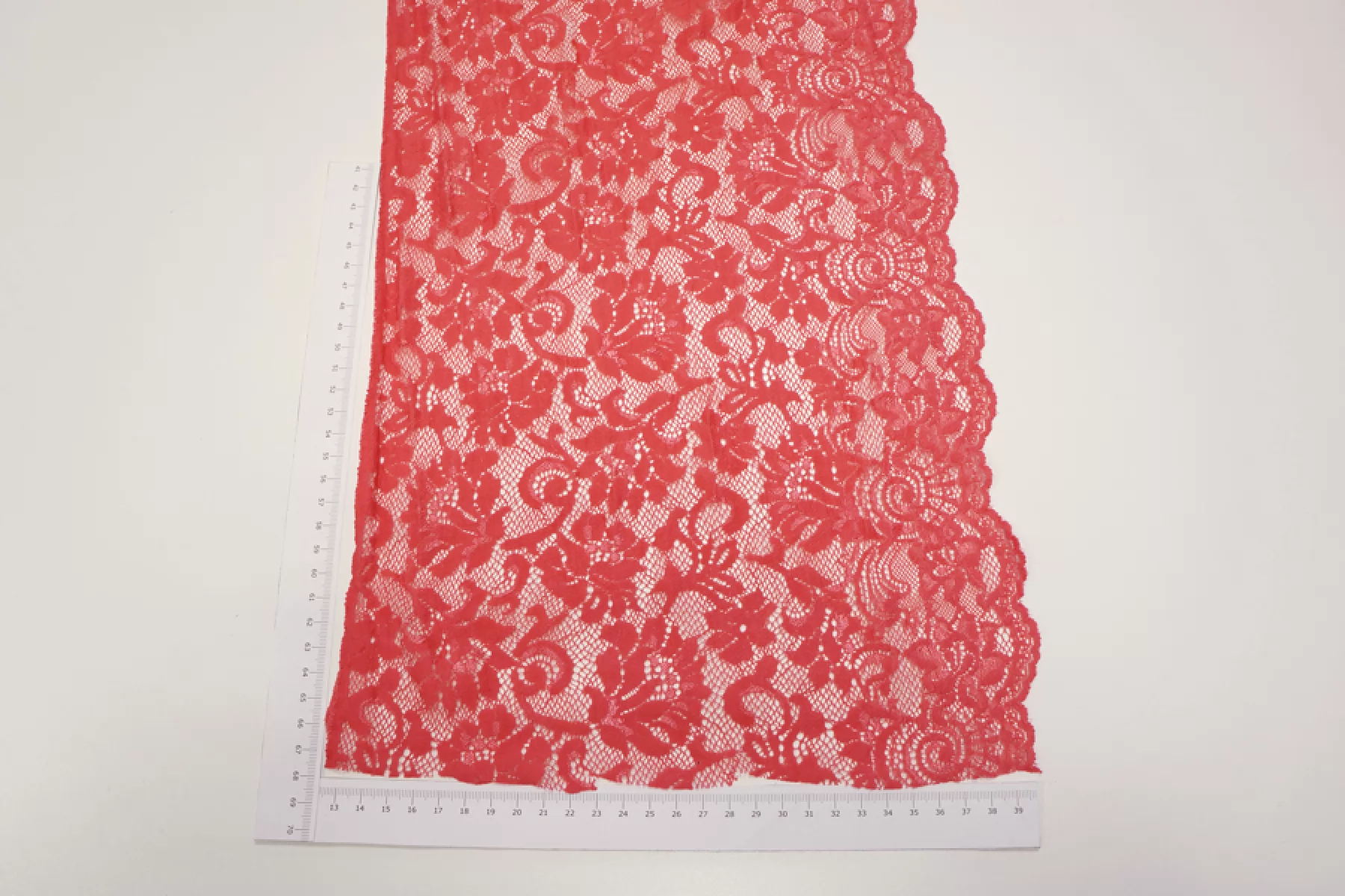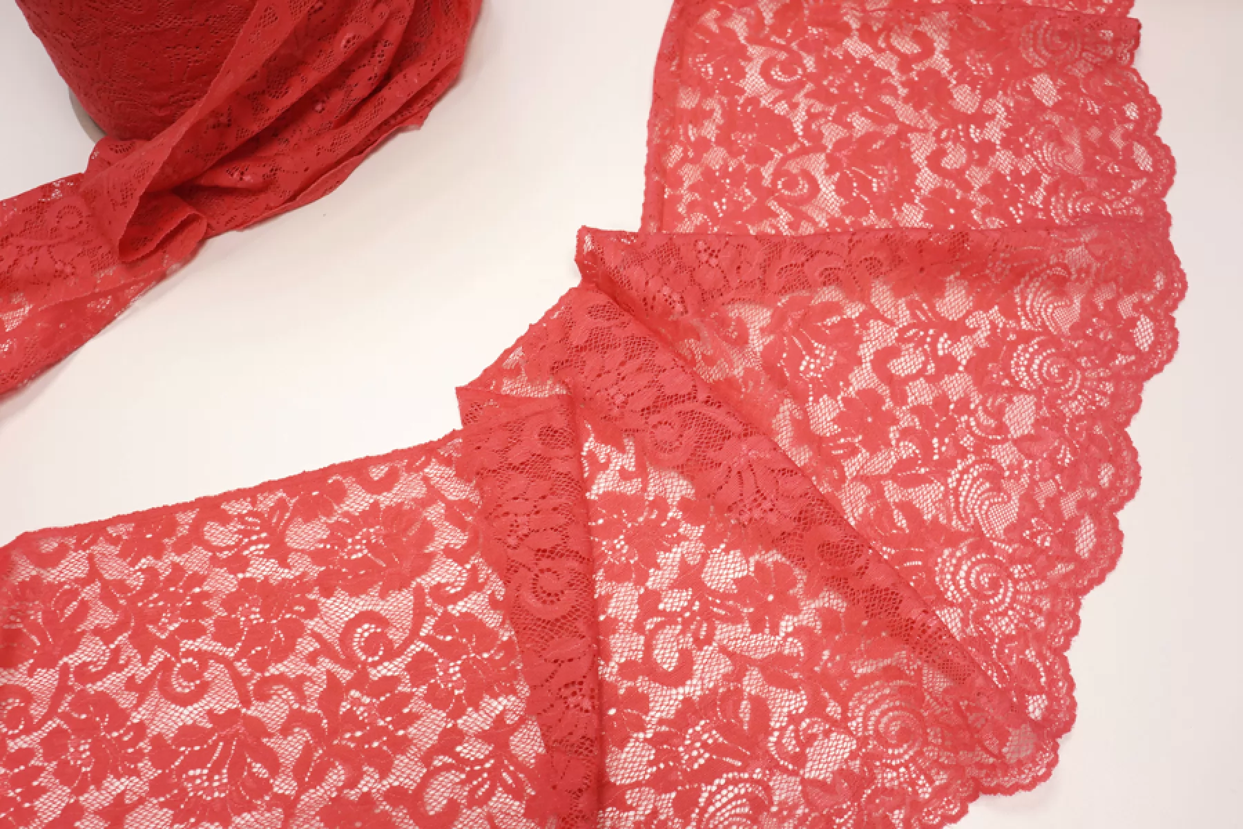 Итальянское кружево насыщенного ягодно-кораллового цвета с блеском. Мягкое, пластичное. Отлично подойдет для пошива нижнего белья, отделки одежды и аксессуаров.