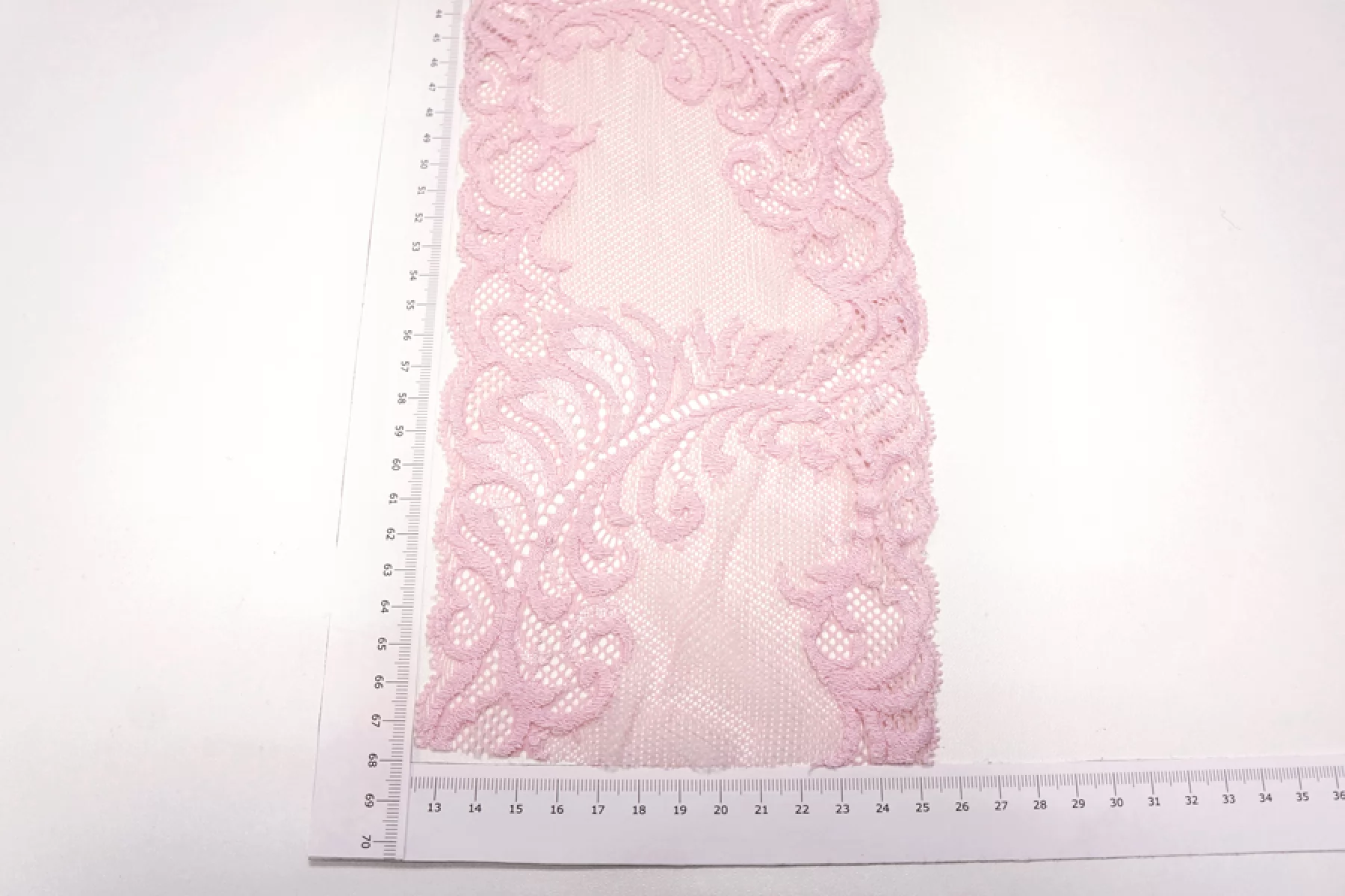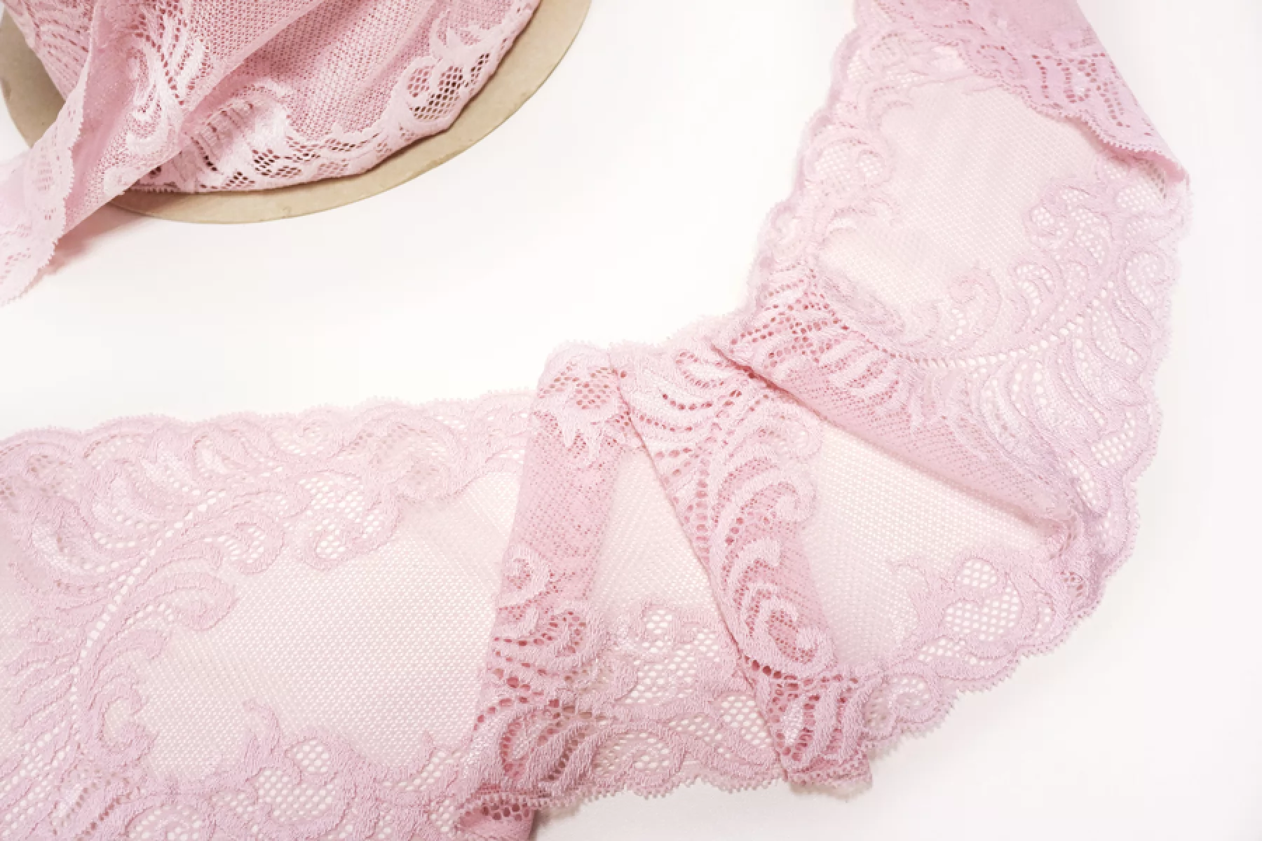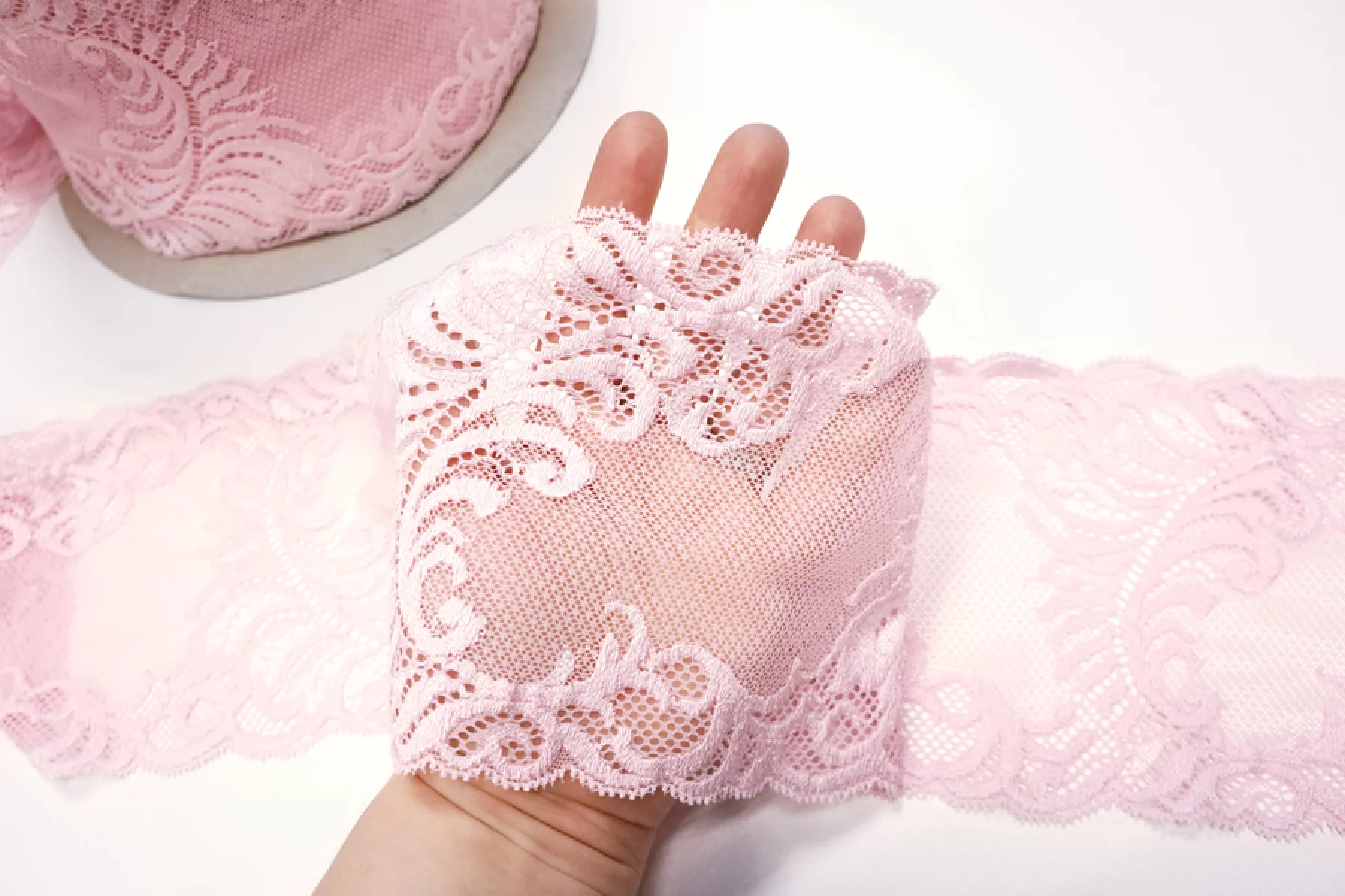 Итальянское кружево нежно-розового цвета с блеском. Мягкое, пластичное. Отлично подойдет для пошива нижнего белья, отделки одежды и аксессуаров.