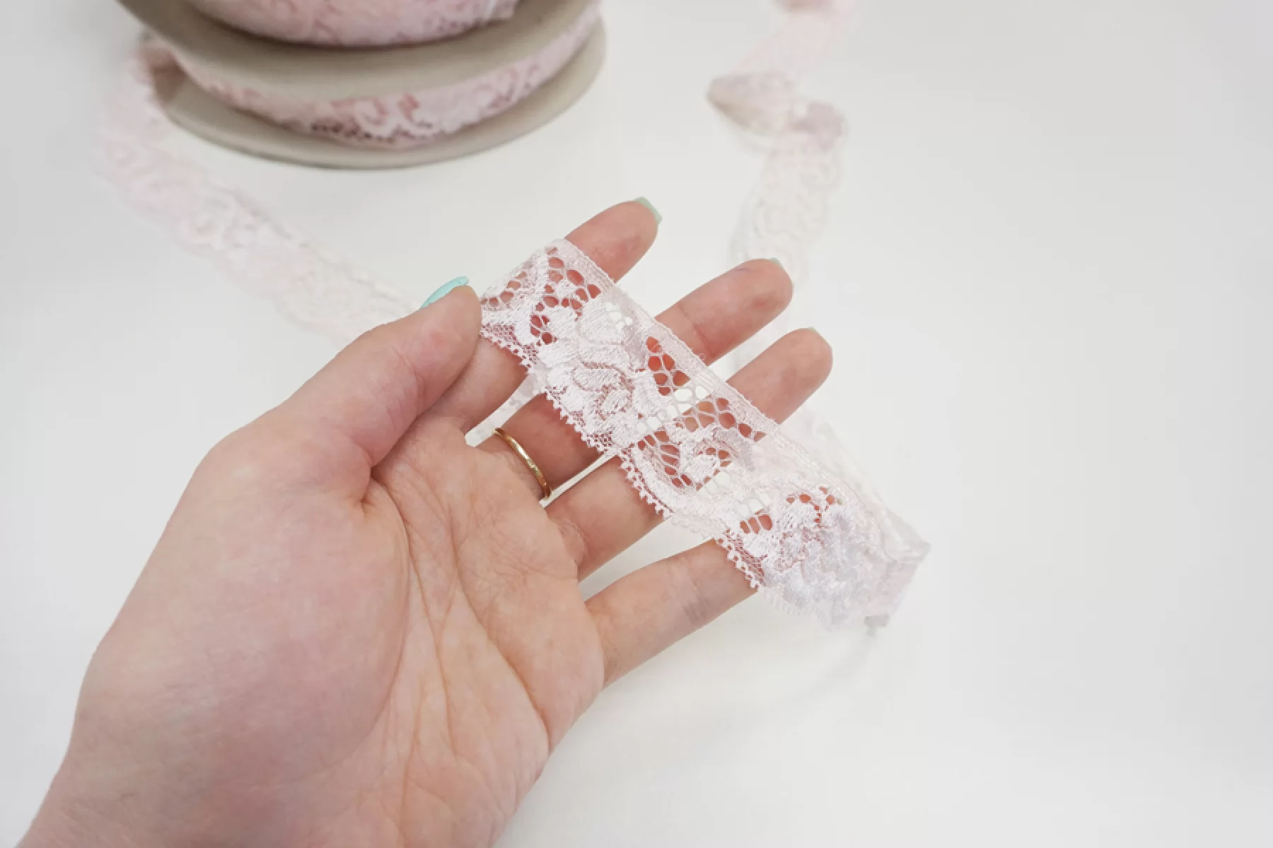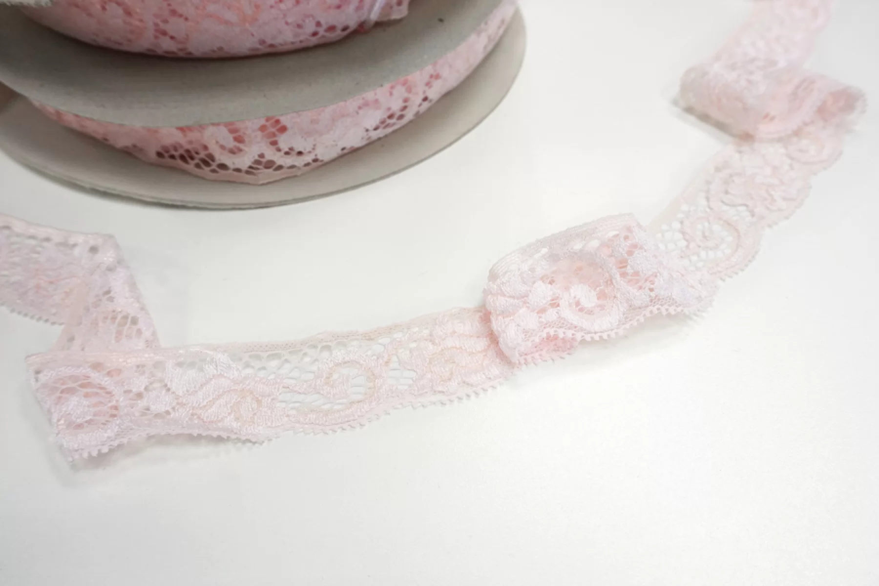 Итальянское кружево нежно-розового цвета. Мягкое, пластичное. Отлично подойдет для пошива нижнего белья, отделки одежды и аксессуаров.