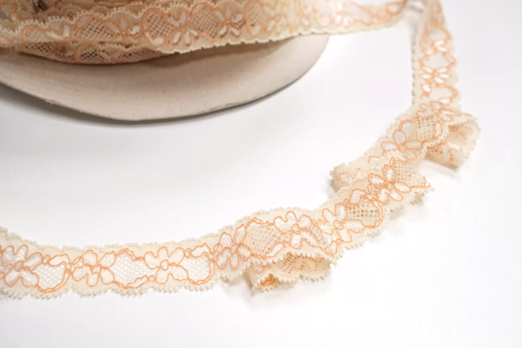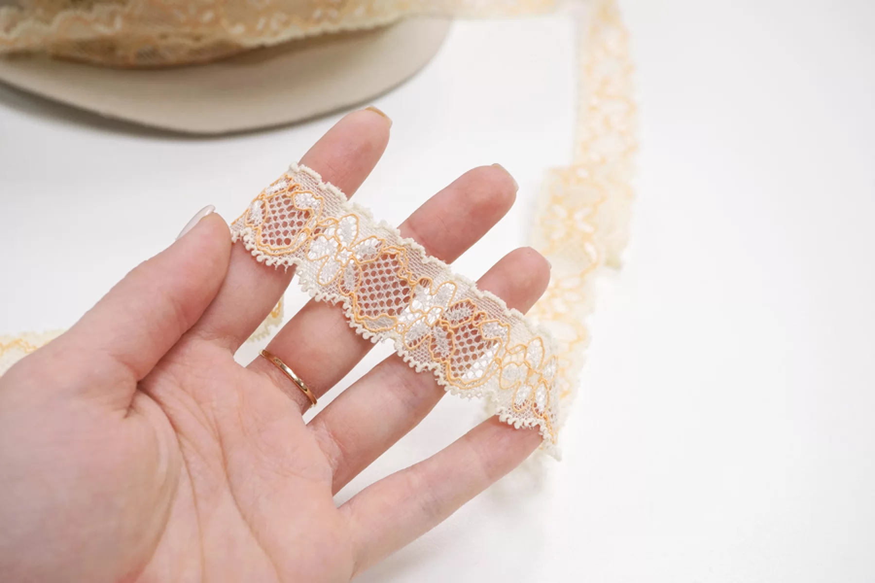 Итальянское кружево молочного цвета. Мягкое, пластичное. Отлично подойдет для пошива нижнего белья, отделки одежды и аксессуаров.