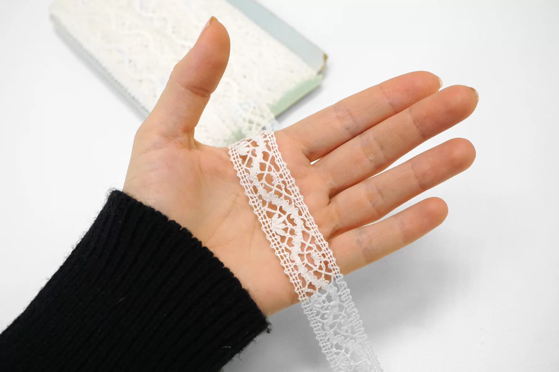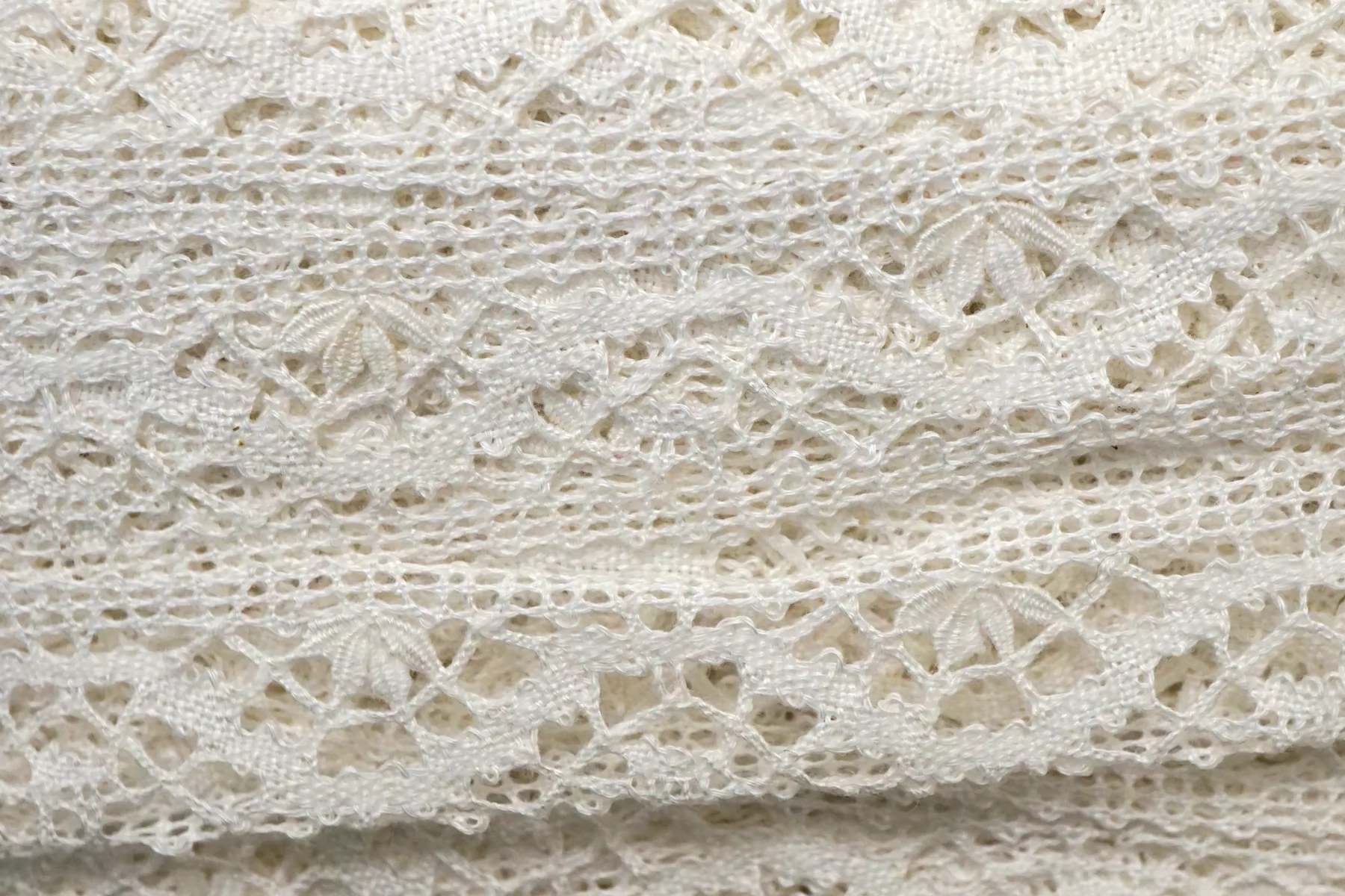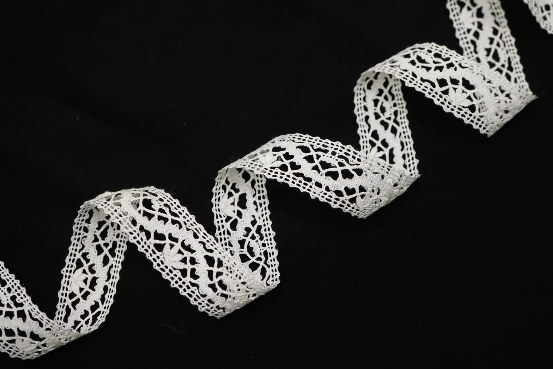 Итальянское отделочное кружево-тесьма белого цвета из хлопка. Мягкое, пластичное. Не тянется. Отлично подойдет для отделки одежды и аксессуаров.