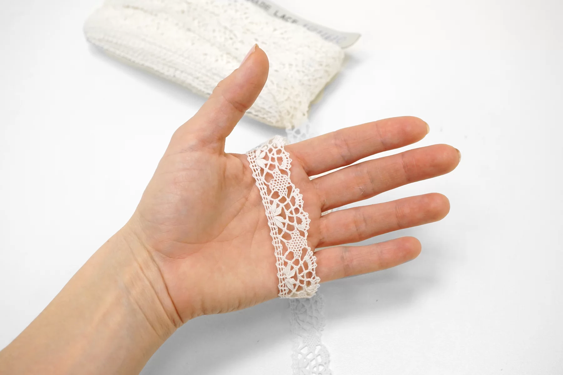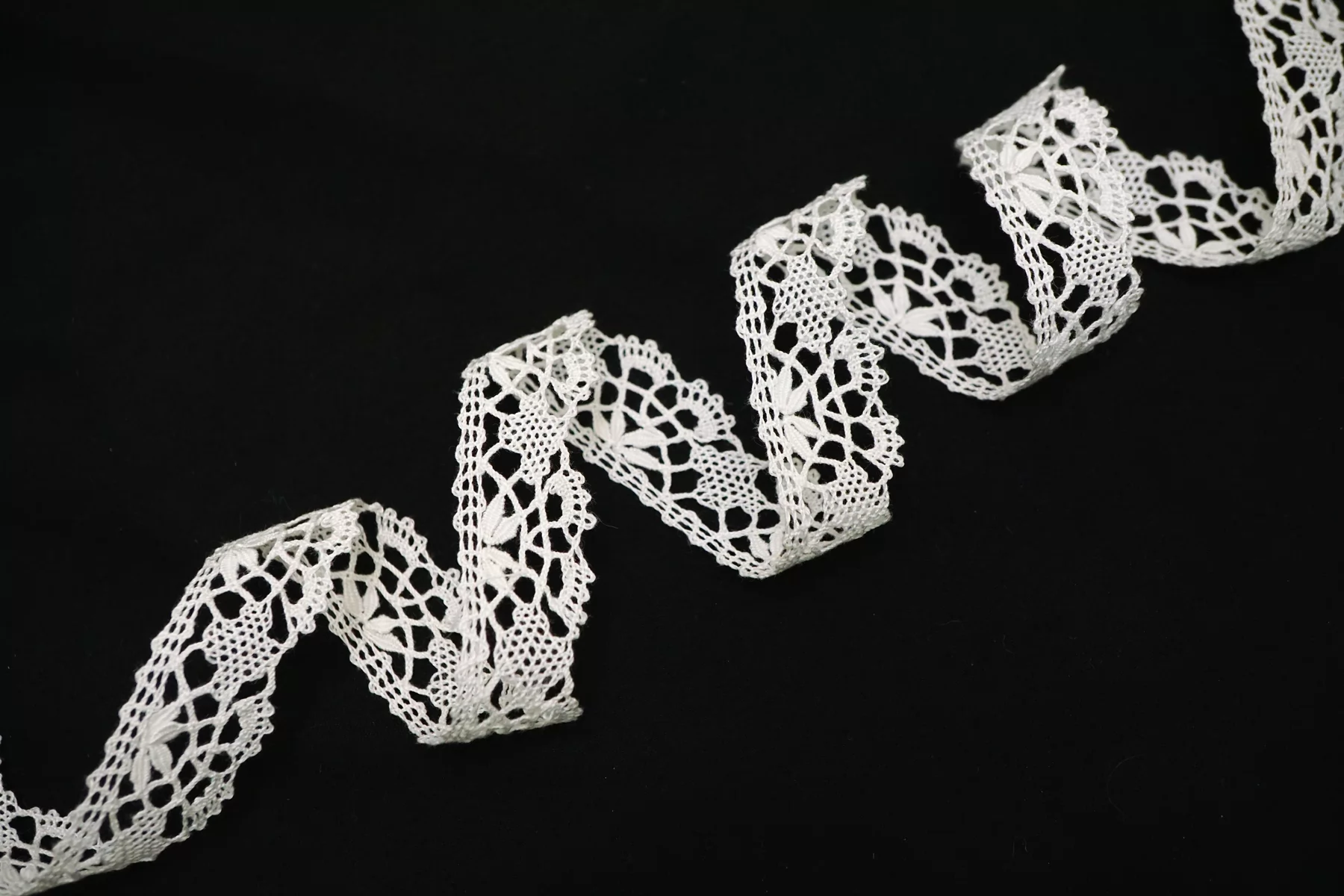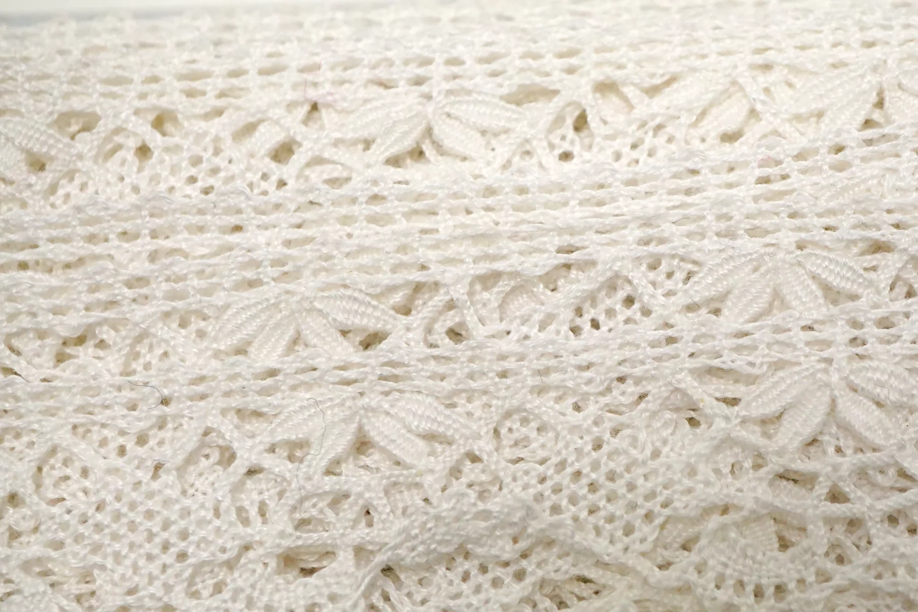 Итальянское отделочное кружево-тесьма молочно-белого цвета из хлопка. Мягкое, пластичное. Не тянется. Отлично подойдет для отделки одежды и аксессуаров.