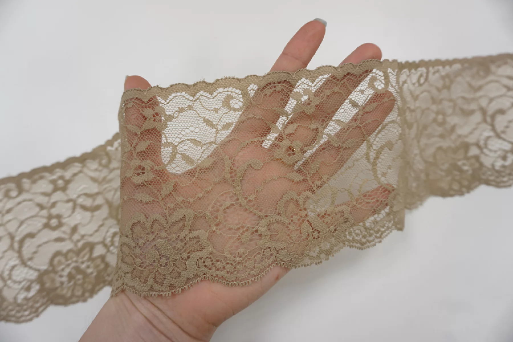 Итальянское кружево в темно-бежевом цвете (слегка с зеленоватым подтоном). Мягкое, пластичное. Отлично подойдет для отделки.