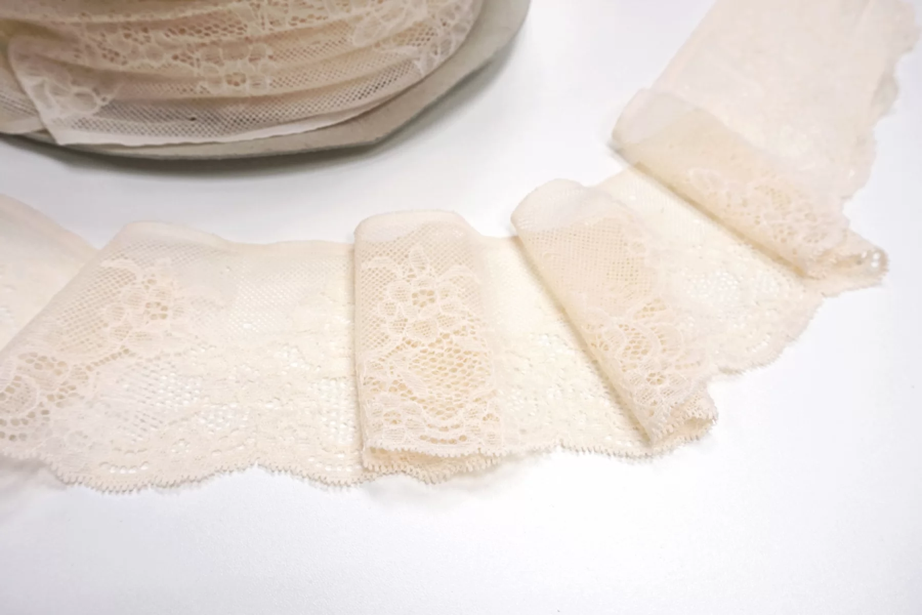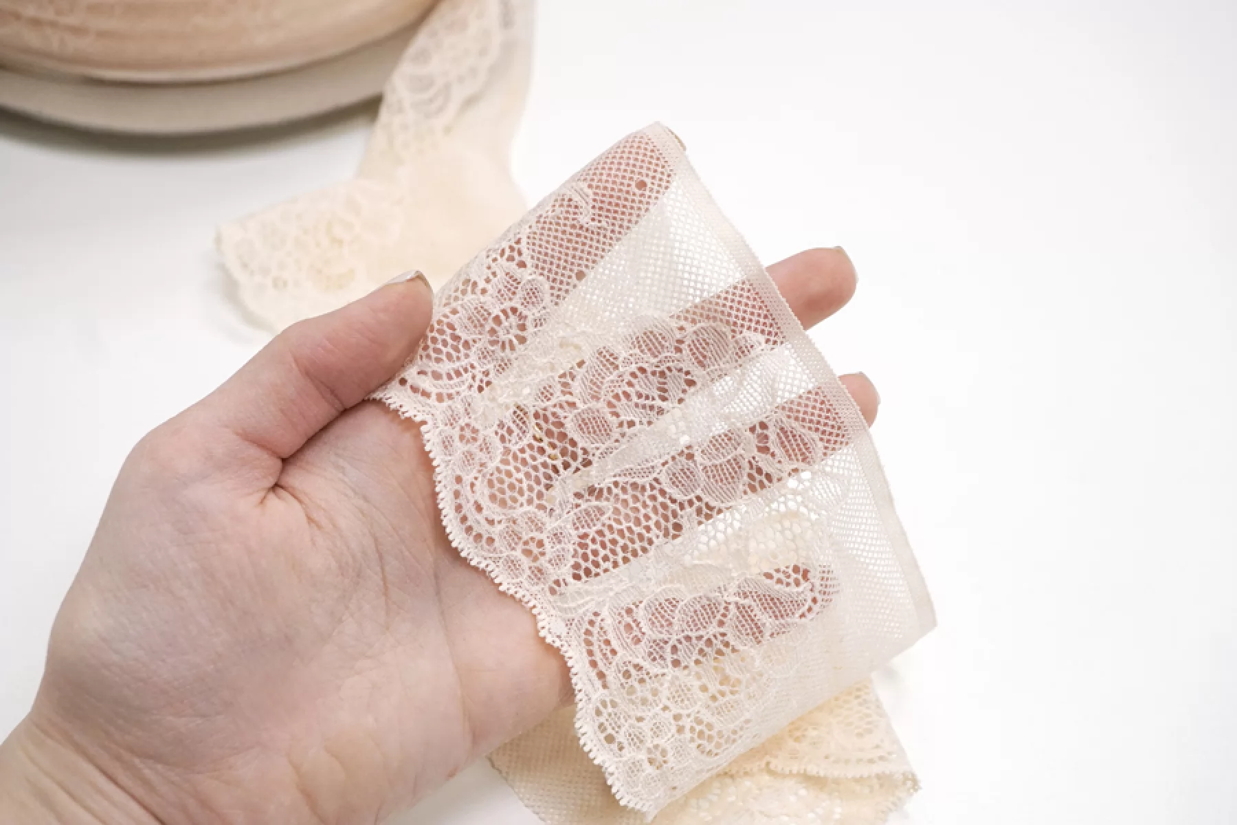 Итальянское кружево персикового цвета. Мягкое, пластичное. Отлично подойдет для пошива нижнего белья, отделки одежды и аксессуаров.