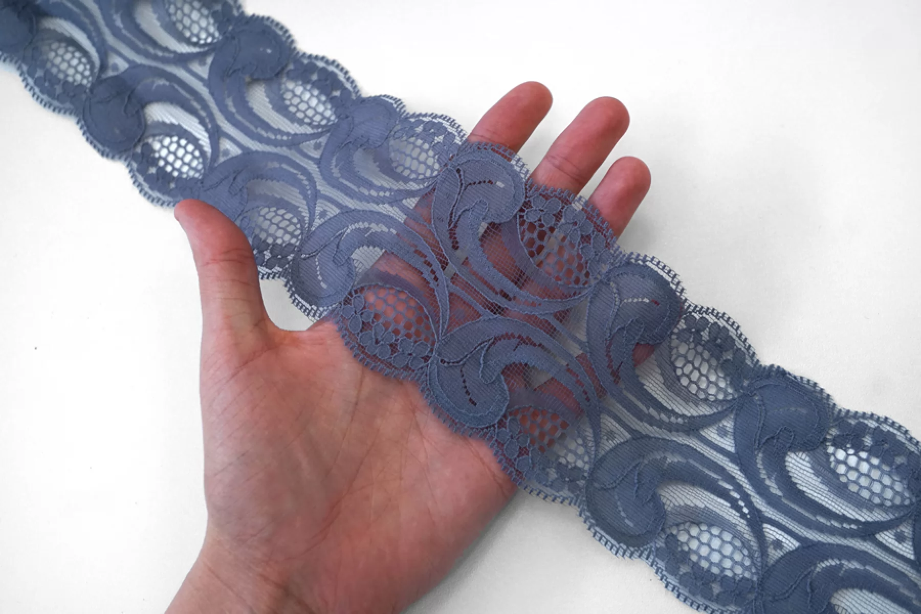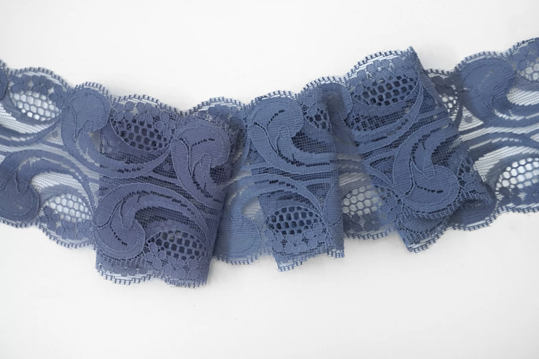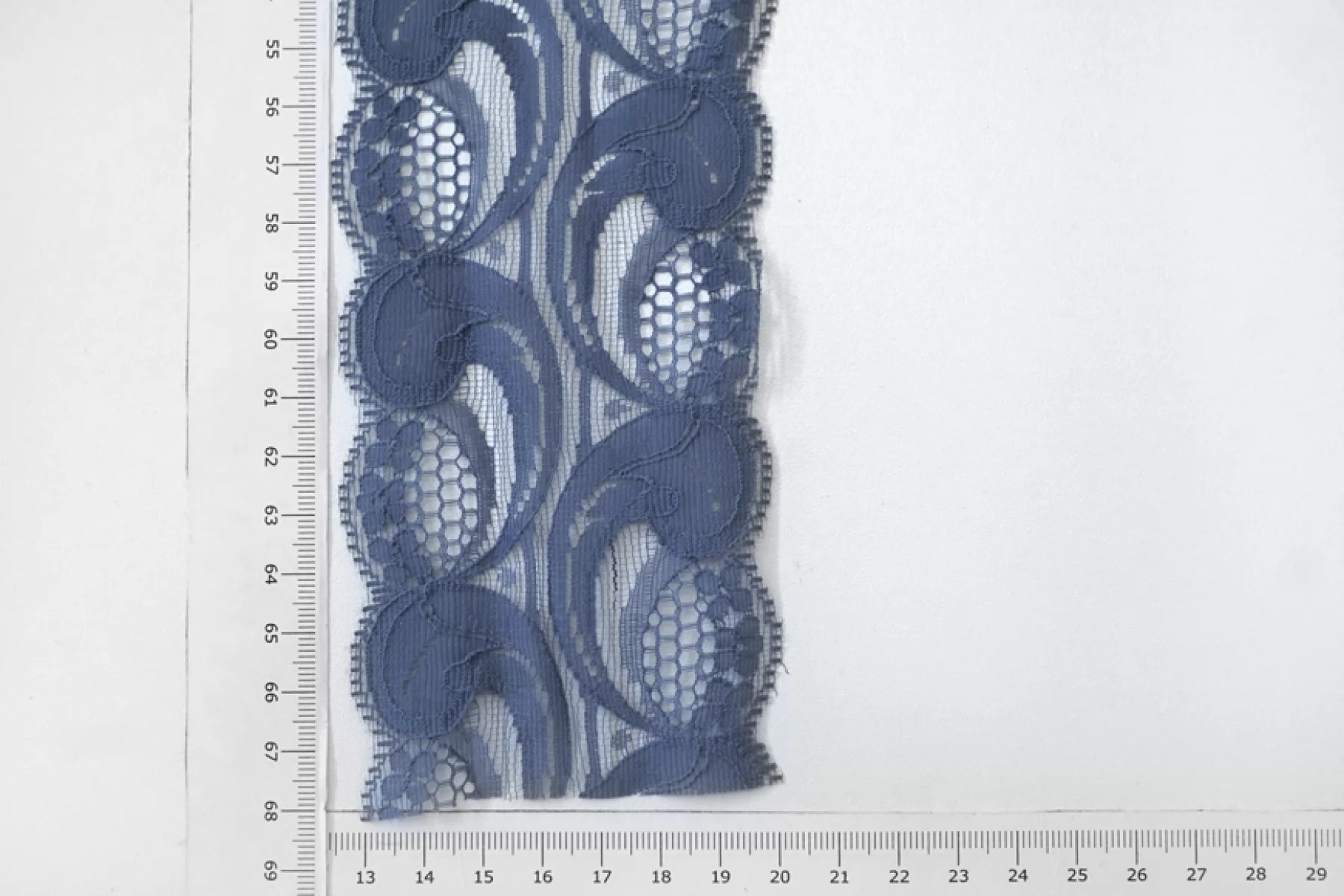 Итальянское кружево приглушенно-синего цвета. Мягкое, пластичное. Отлично подойдет для пошива нижнего белья, отделки одежды и аксессуаров.