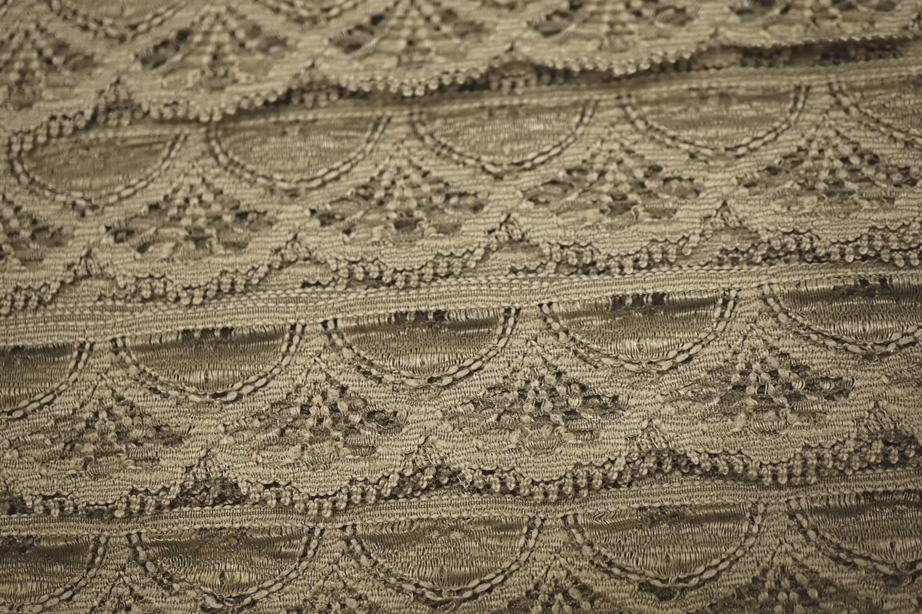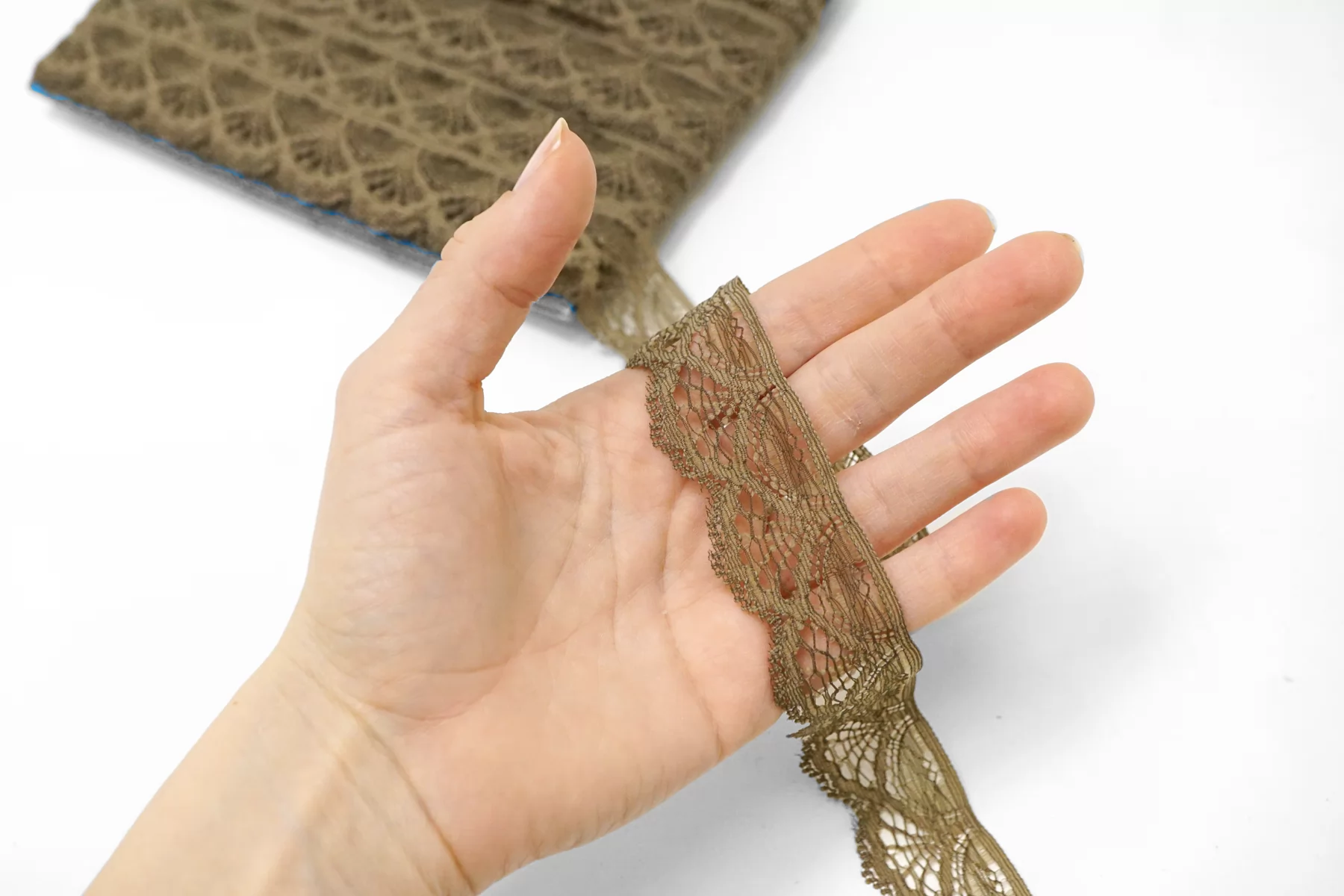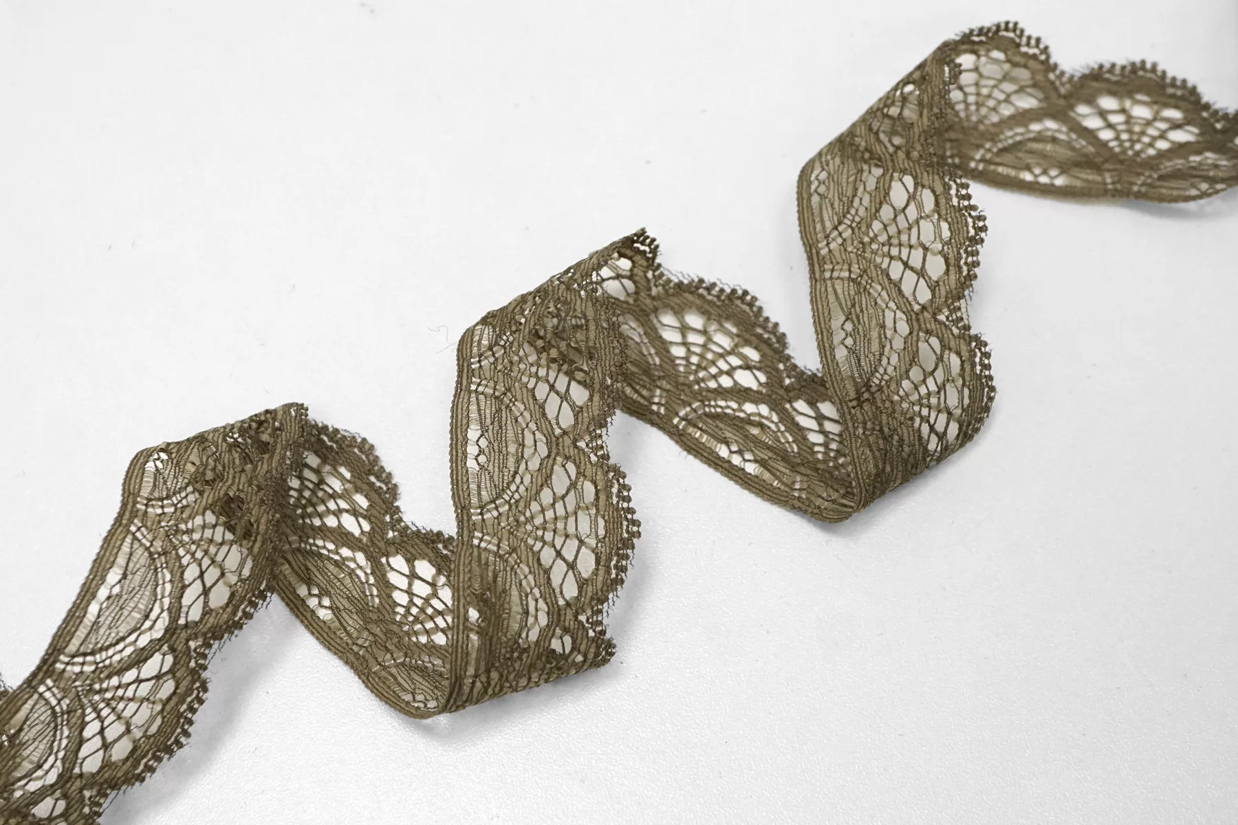 Итальянское кружево припылённо-оливкового цвета. Слегка шероховатое, пластичное. Не тянется. Отлично подойдет для пошива нижнего белья, отделки одежды и аксессуаров.