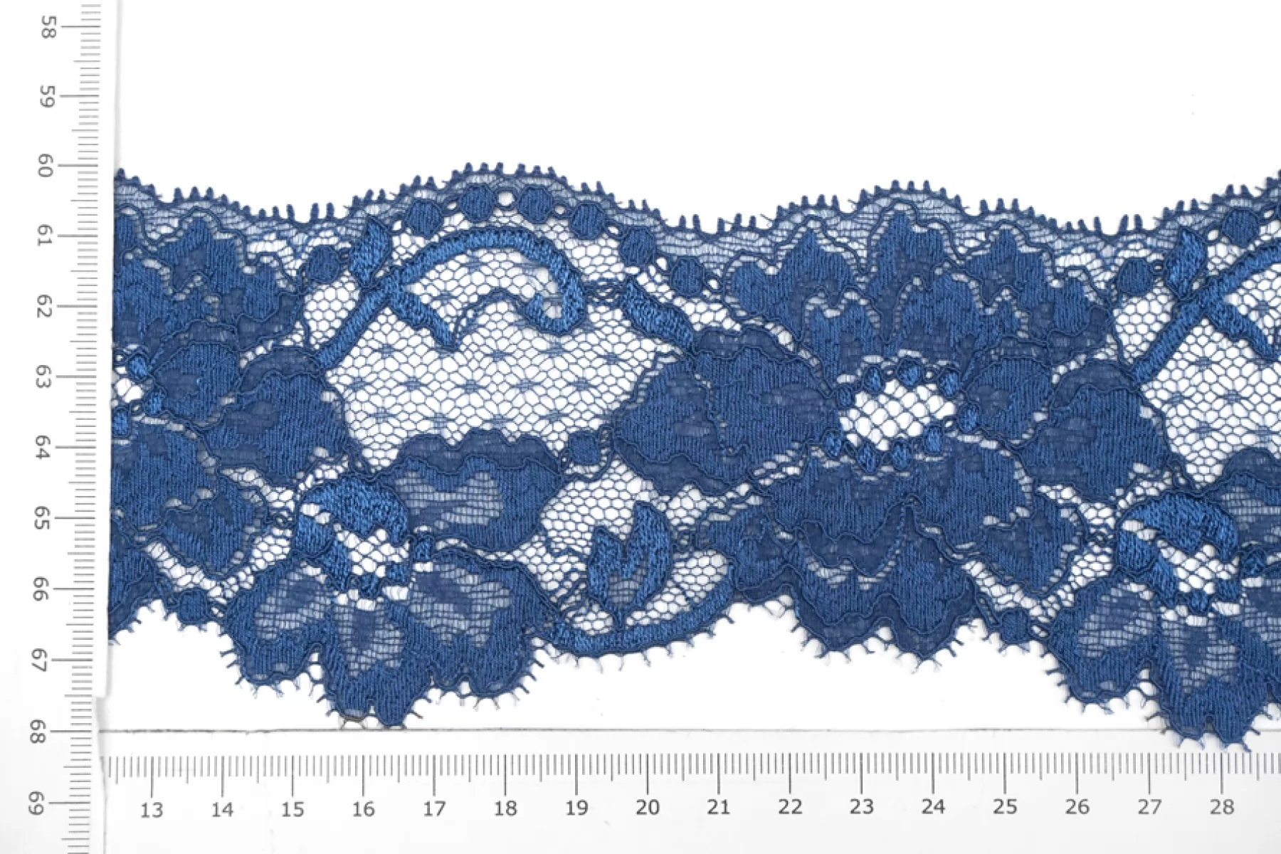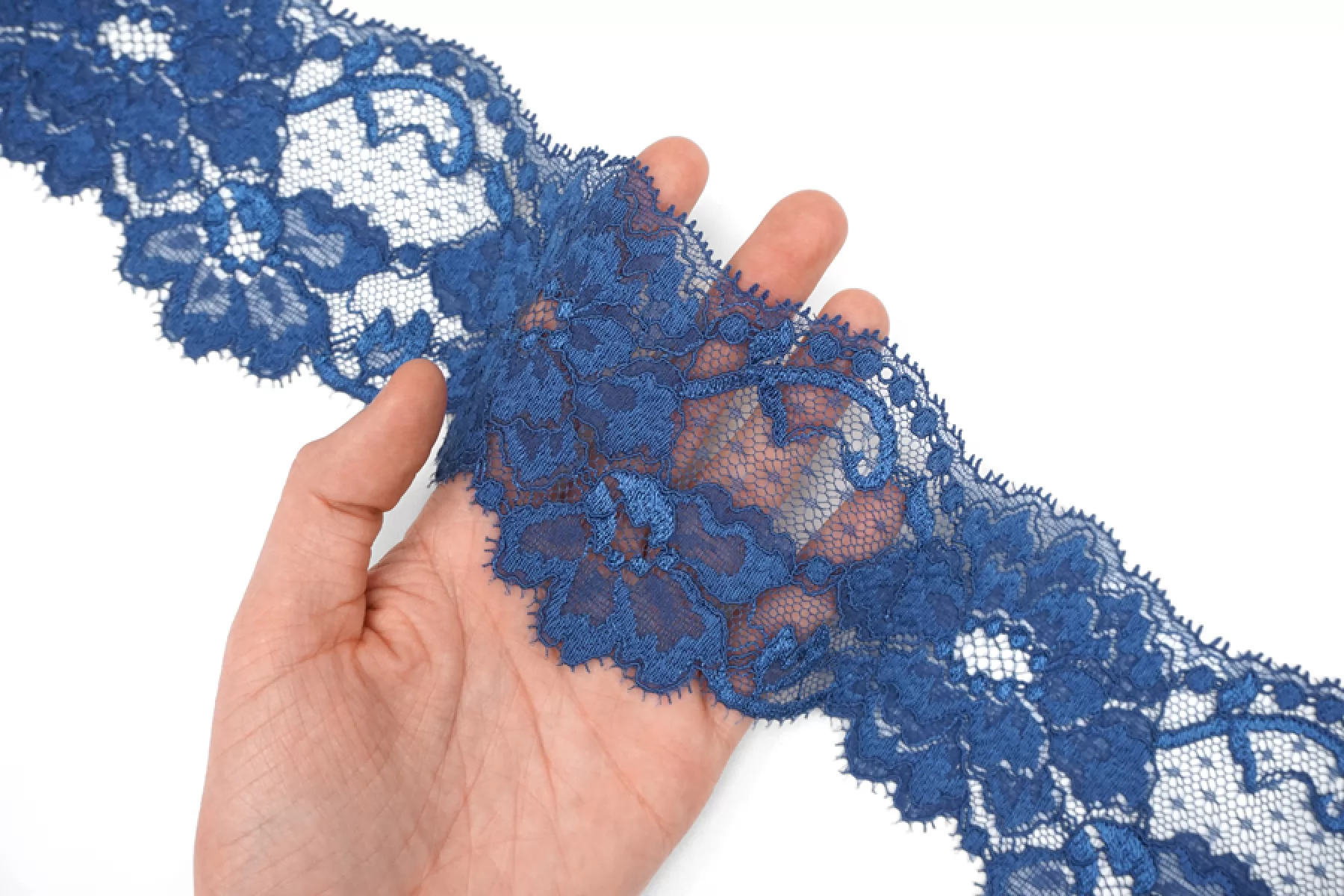 Итальянское эластичное кружево пыльно-синего цвета. Мягкое, пластичное. Отлично подойдет для пошива нижнего белья, отделки одежды и аксессуаров.