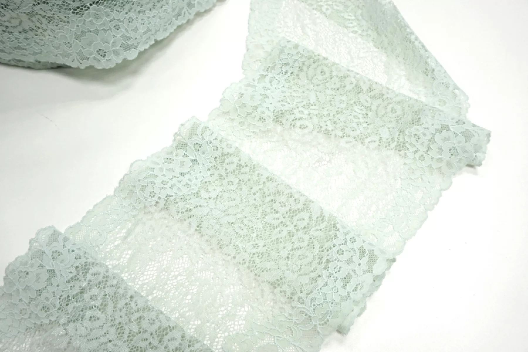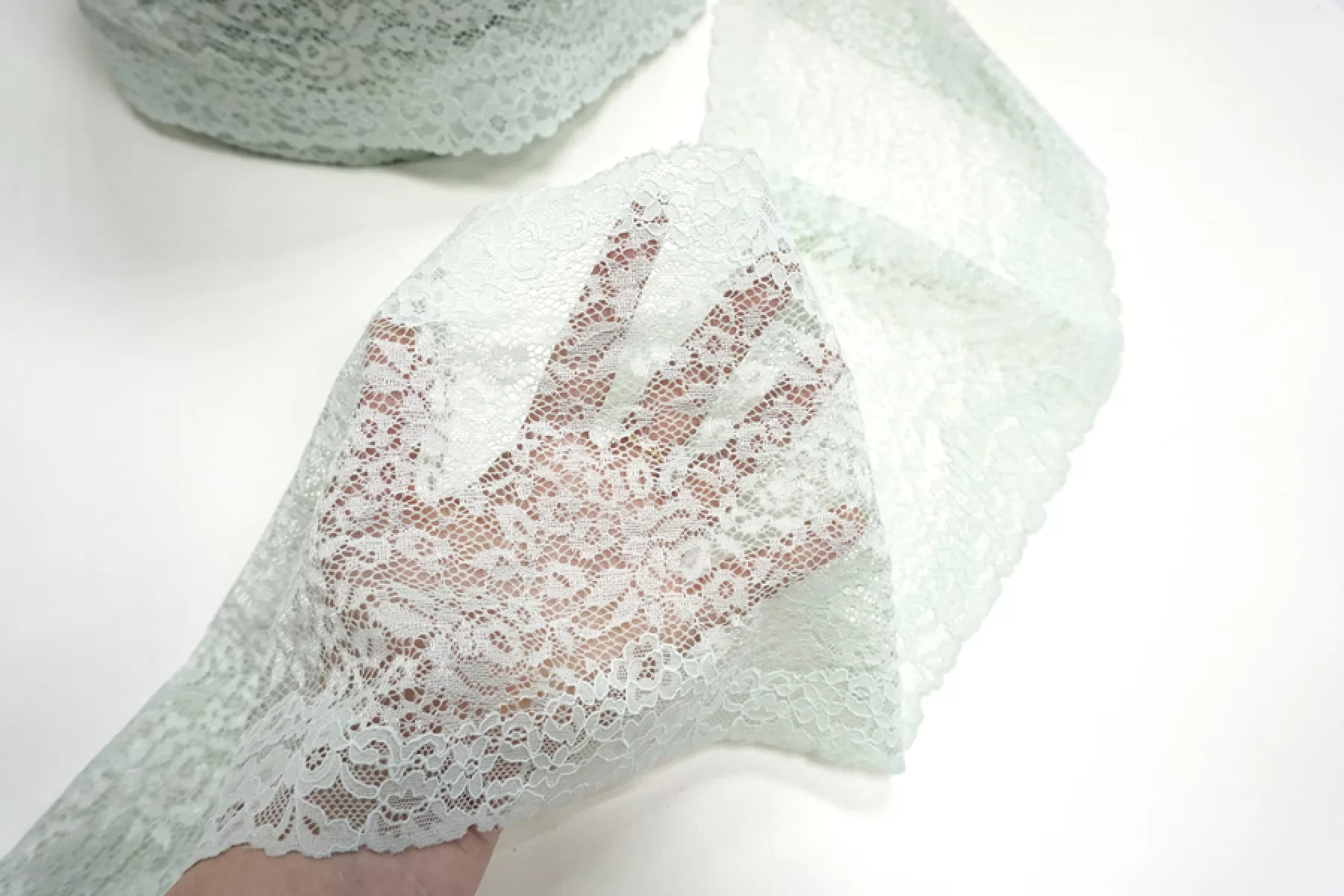 Итальянское кружево пыльно-зеленого цвета с блеском. Мягкое, пластичное. Отлично подойдет для пошива нижнего белья, отделки одежды и аксессуаров.