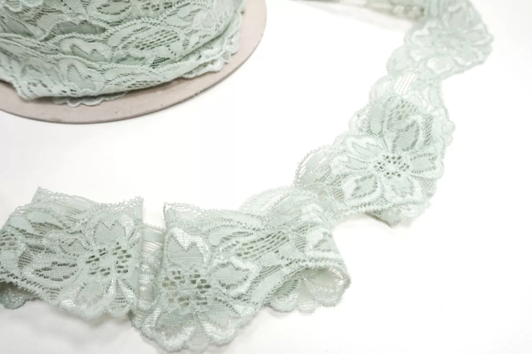 Итальянское кружево пыльно-зеленого цвета с блеском. Мягкое, пластичное. Отлично подойдет для пошива нижнего белья, отделки одежды и аксессуаров.