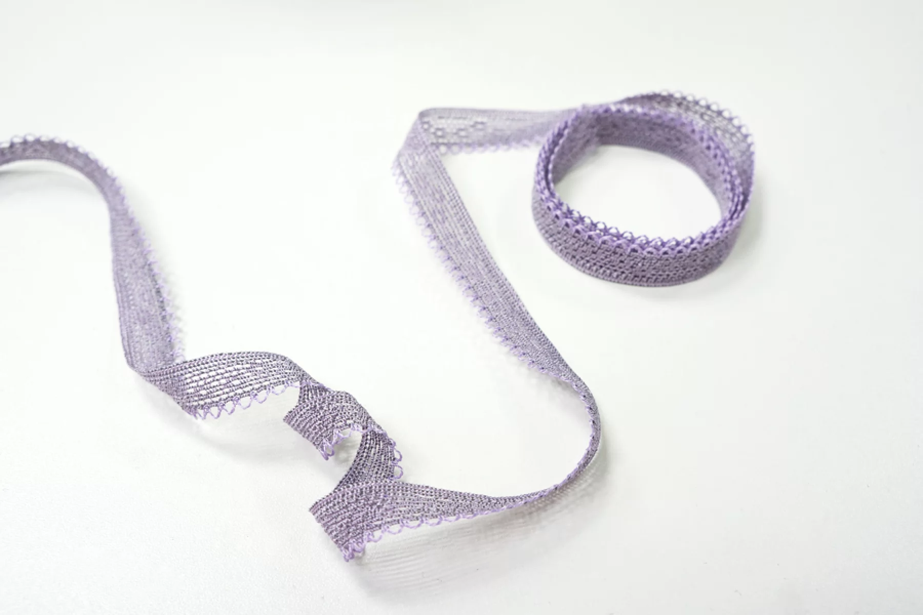 Итальянская кружевная резинка сиреневого цвета. Мягкая, пластичная, прекрасно растягивается. Отлично подойдет для пошива нижнего белья, отделки одежды и аксессуаров.