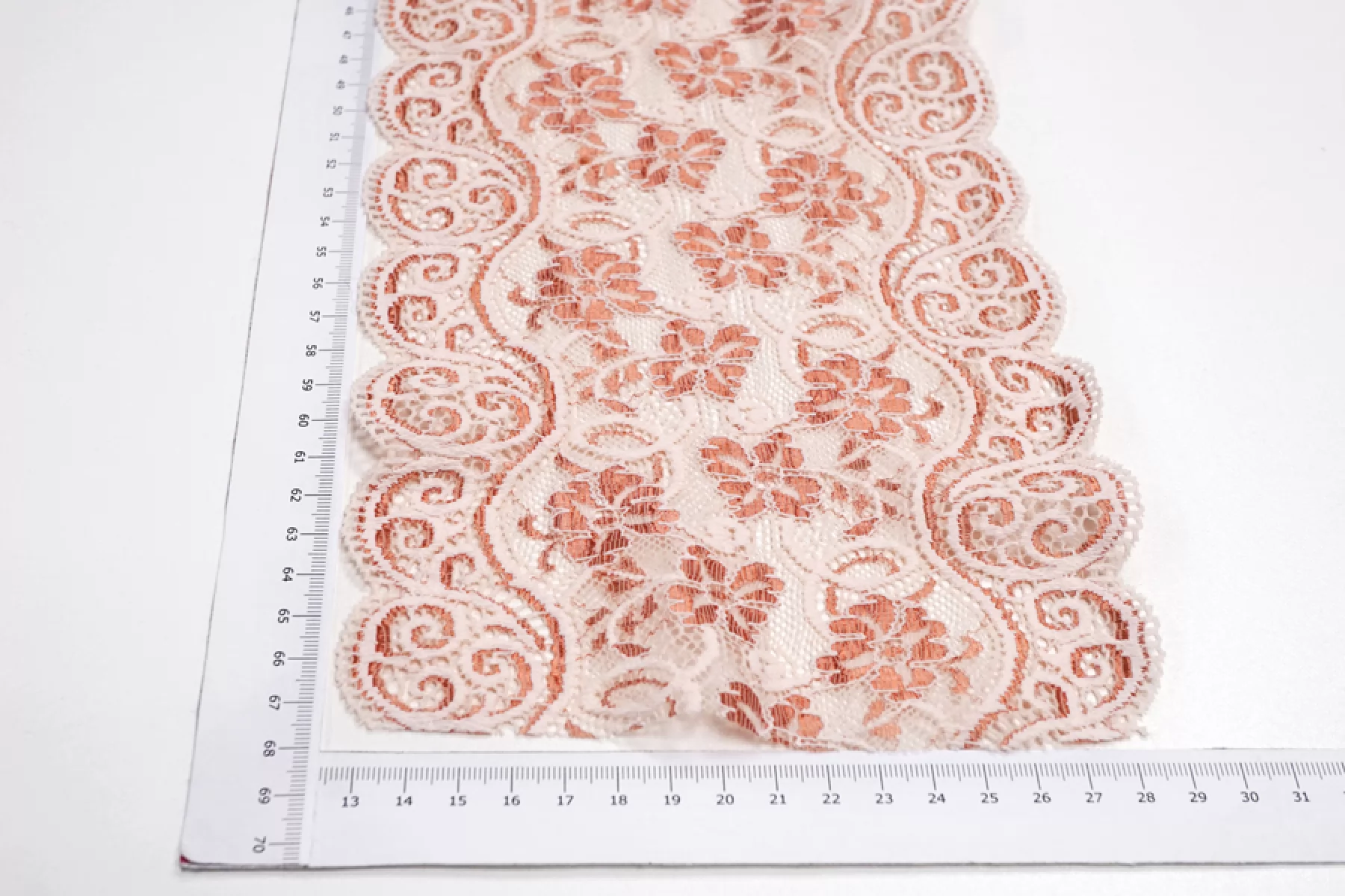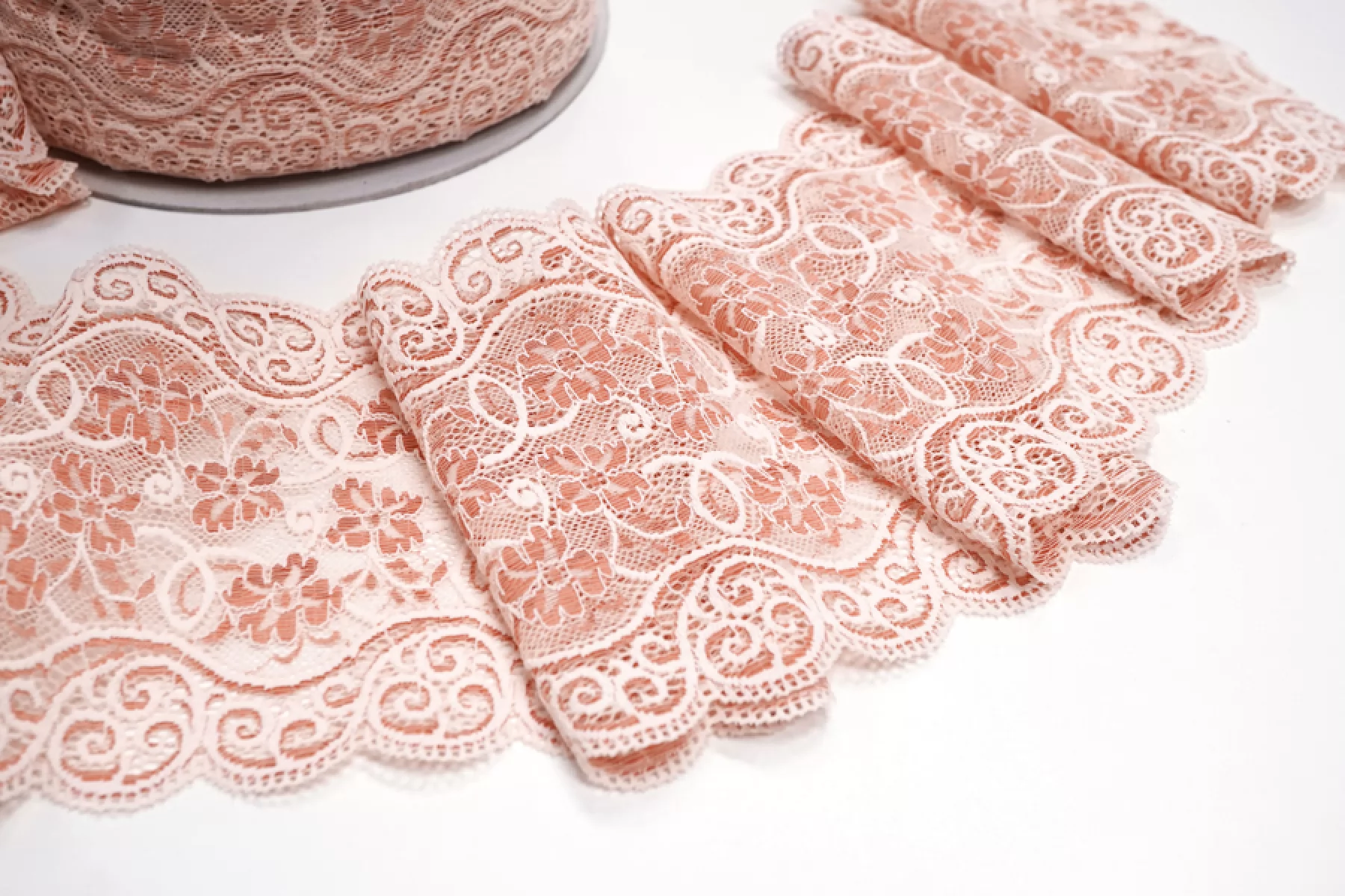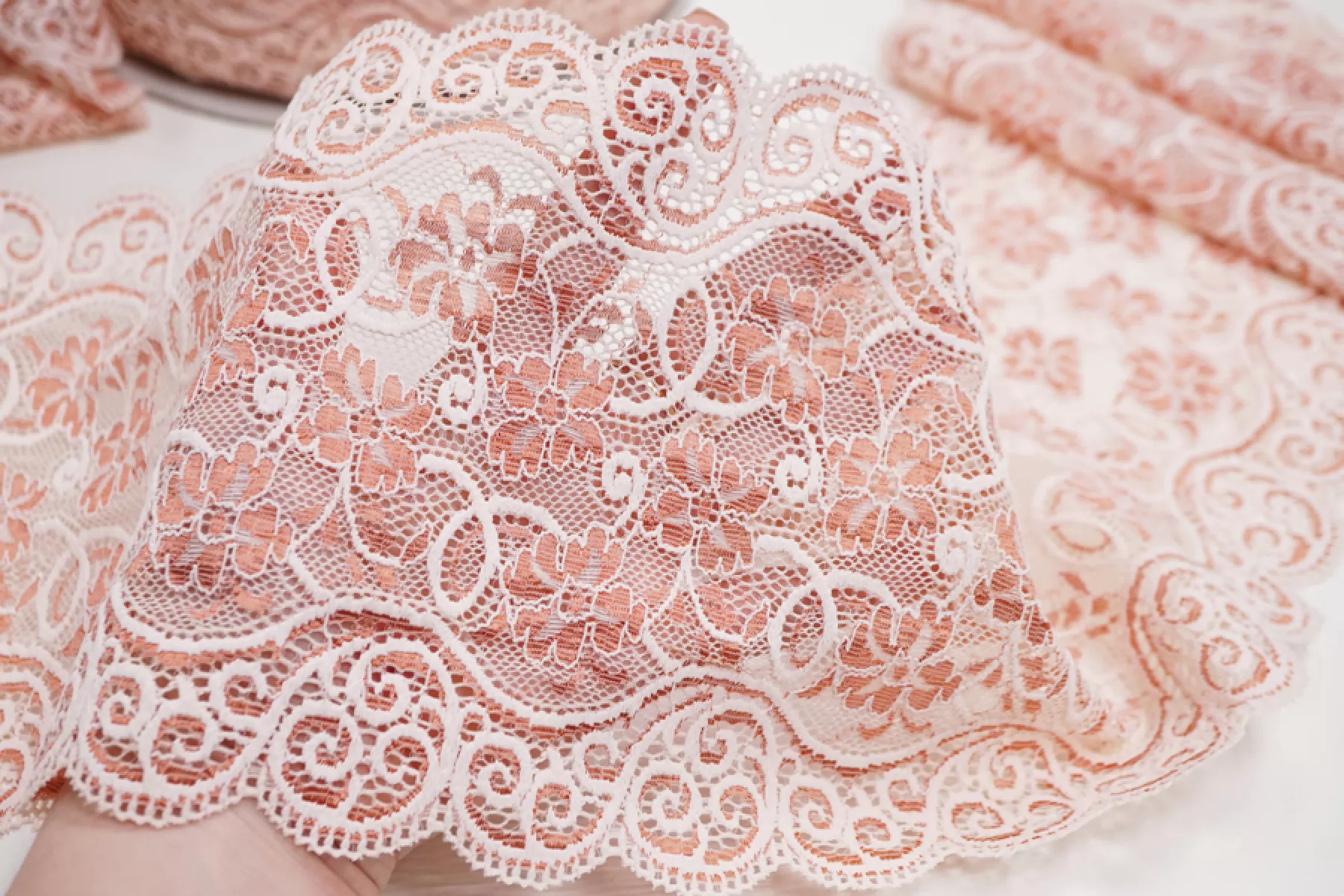 Итальянское кружево розовато-кирпичного цвета. Мягкое, пластичное. Отлично подойдет для пошива нижнего белья, отделки одежды и аксессуаров.