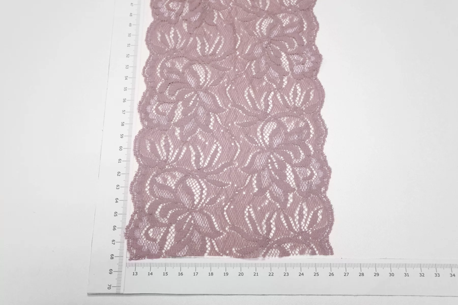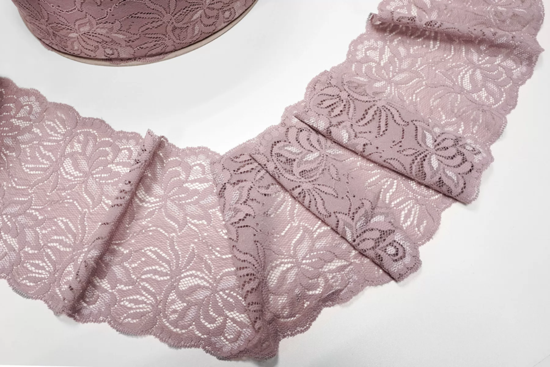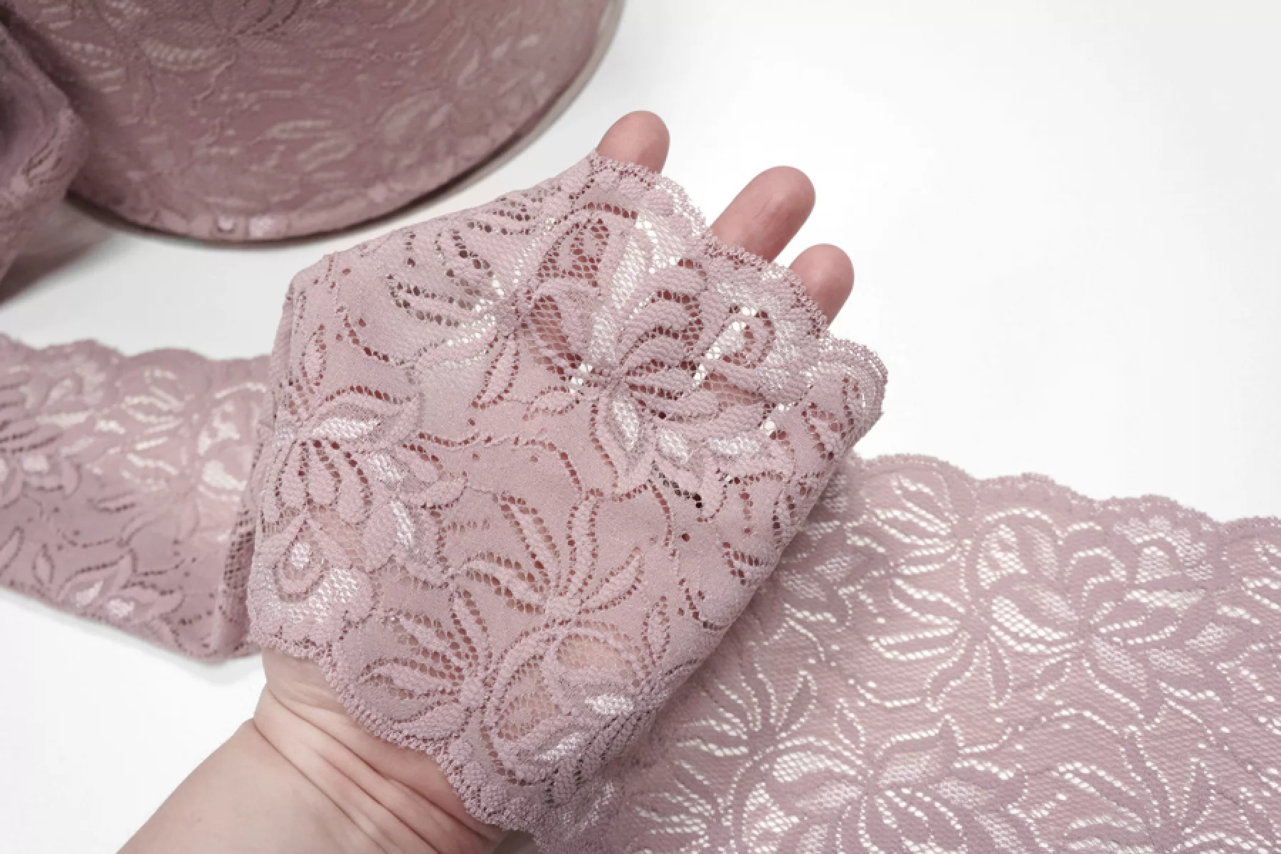 Итальянское кружево припыленно-лилового цвета с блеском. Мягкое, пластичное. Отлично подойдет для пошива нижнего белья, отделки одежды и аксессуаров.