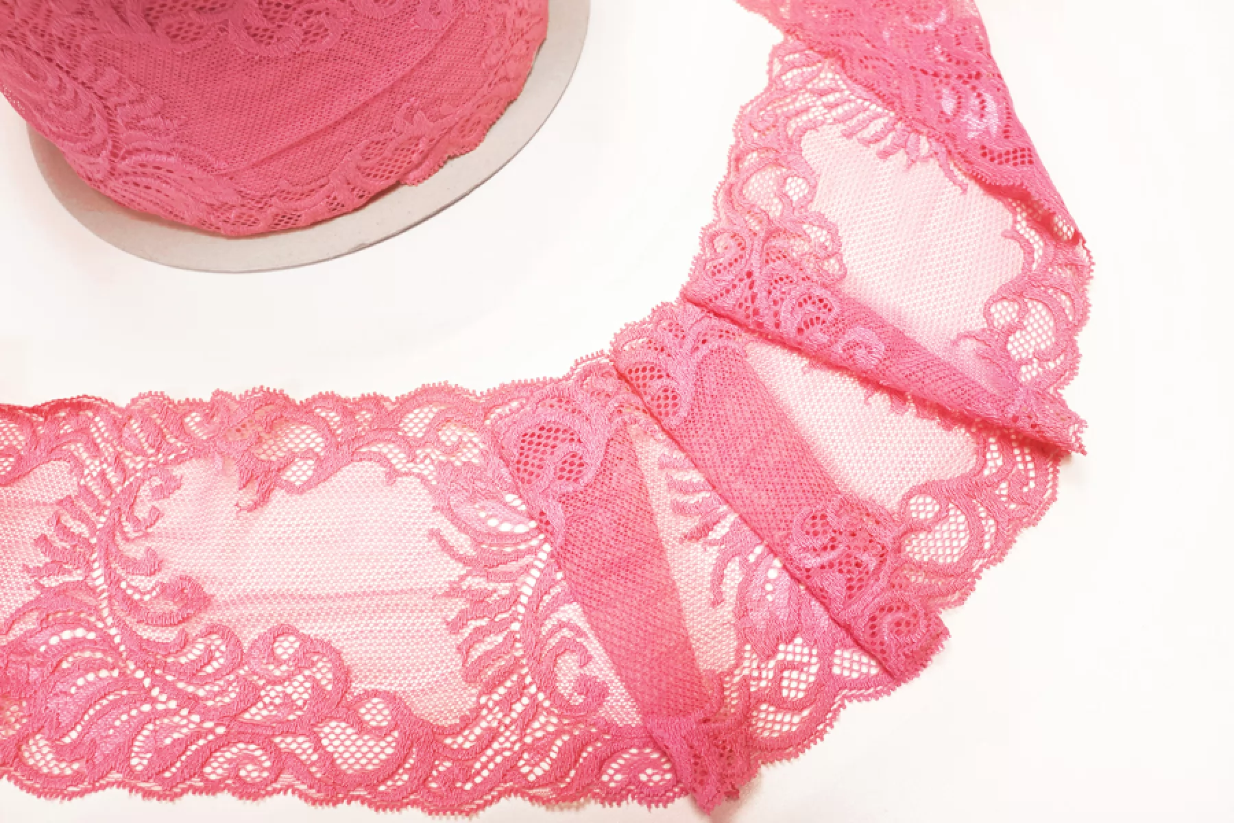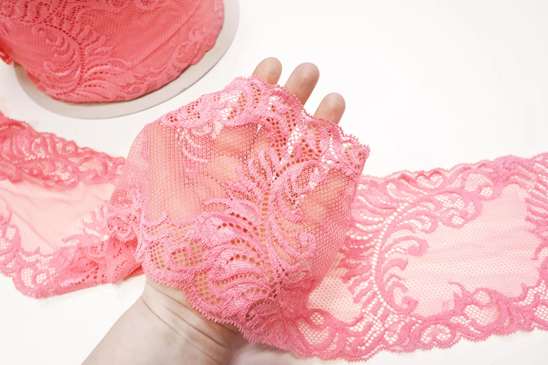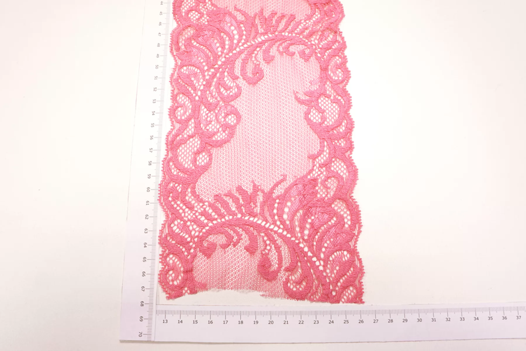 Итальянское кружево розового цвета с блеском. Мягкое, пластичное. Отлично подойдет для пошива нижнего белья, отделки одежды и аксессуаров.