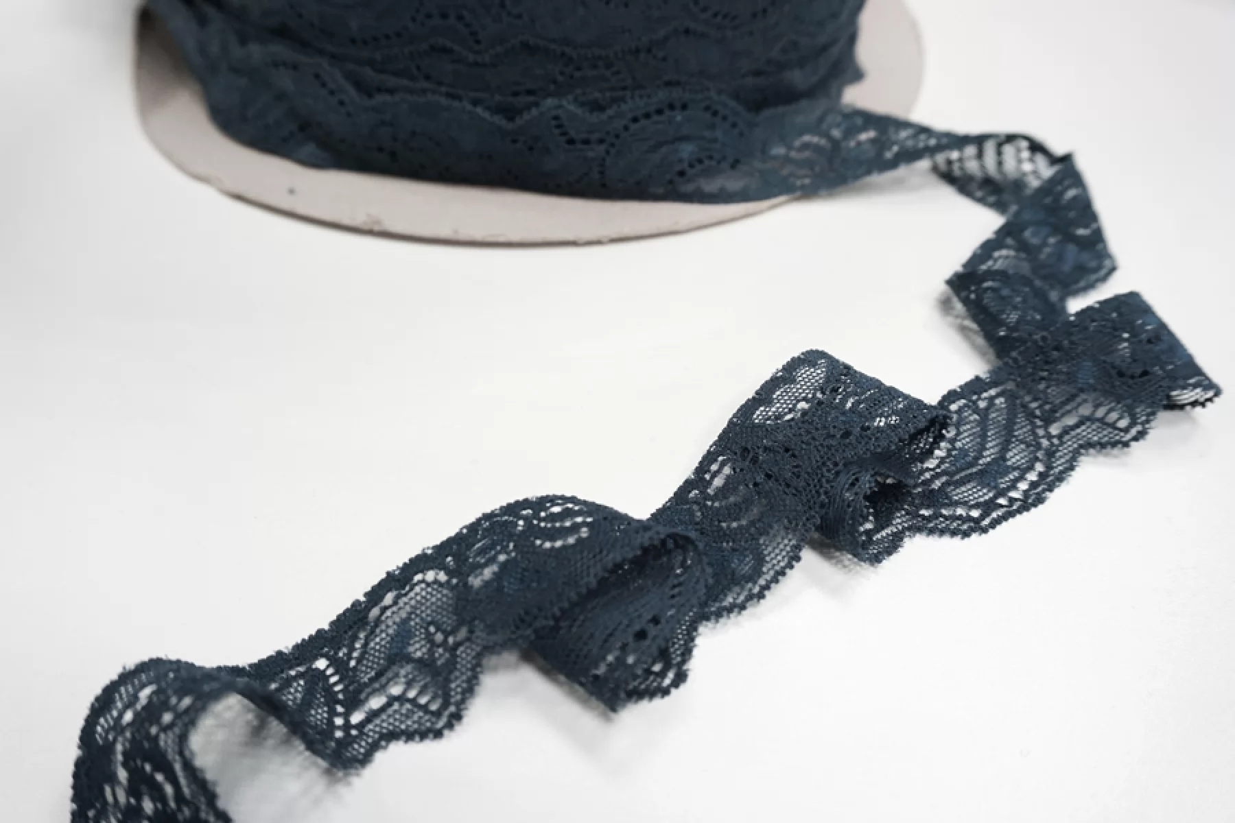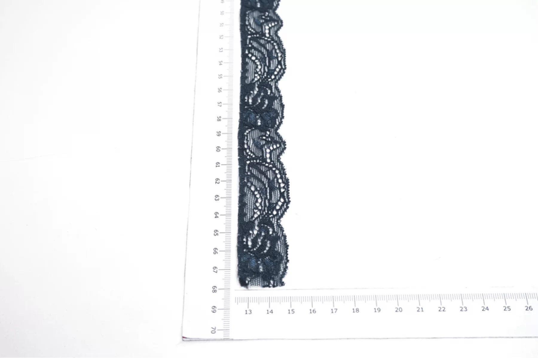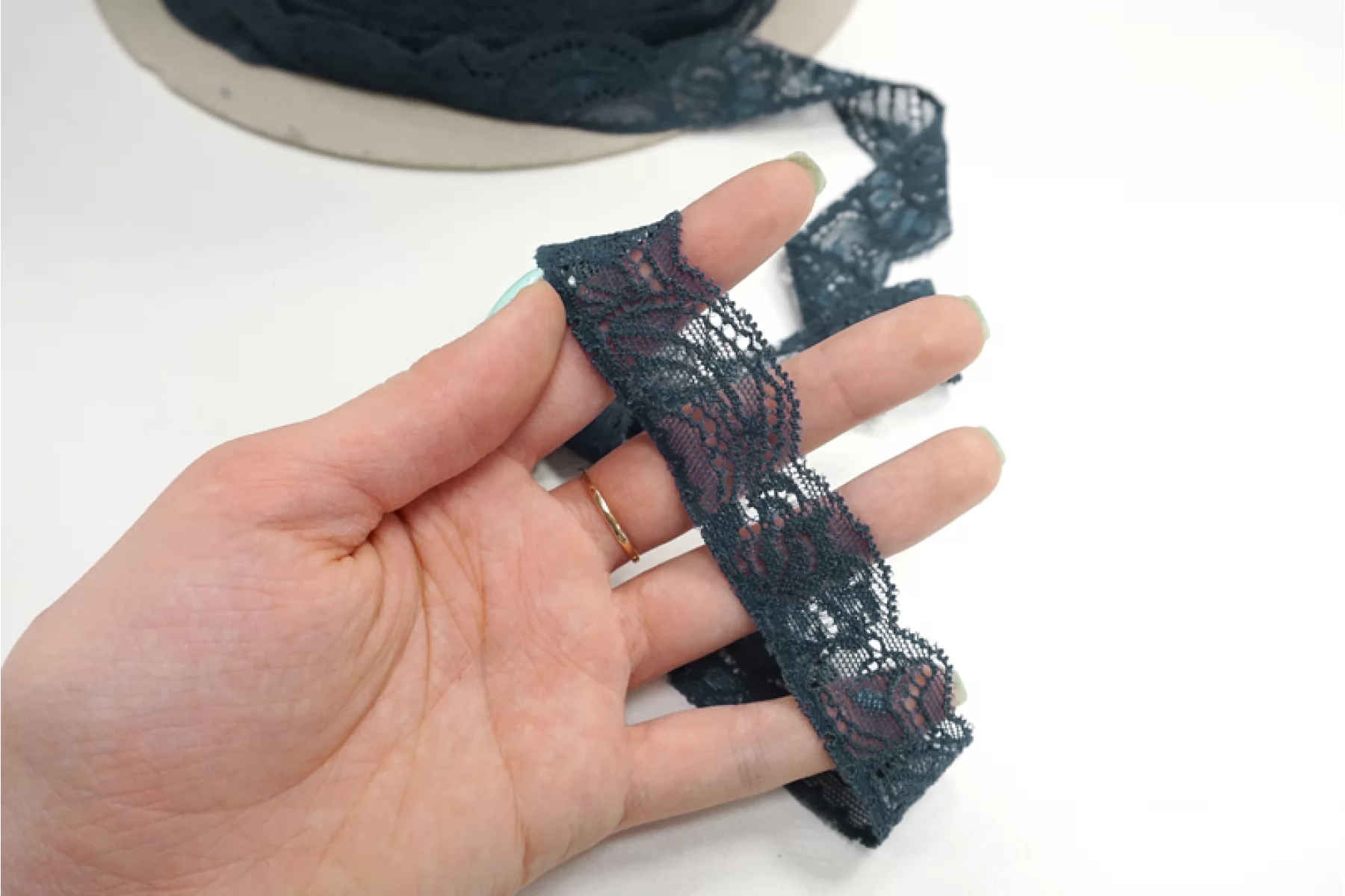 Итальянское кружево серого цвета с синим подтоном. Мягкое, пластичное. Отлично подойдет для пошива нижнего белья, отделки одежды и аксессуаров.