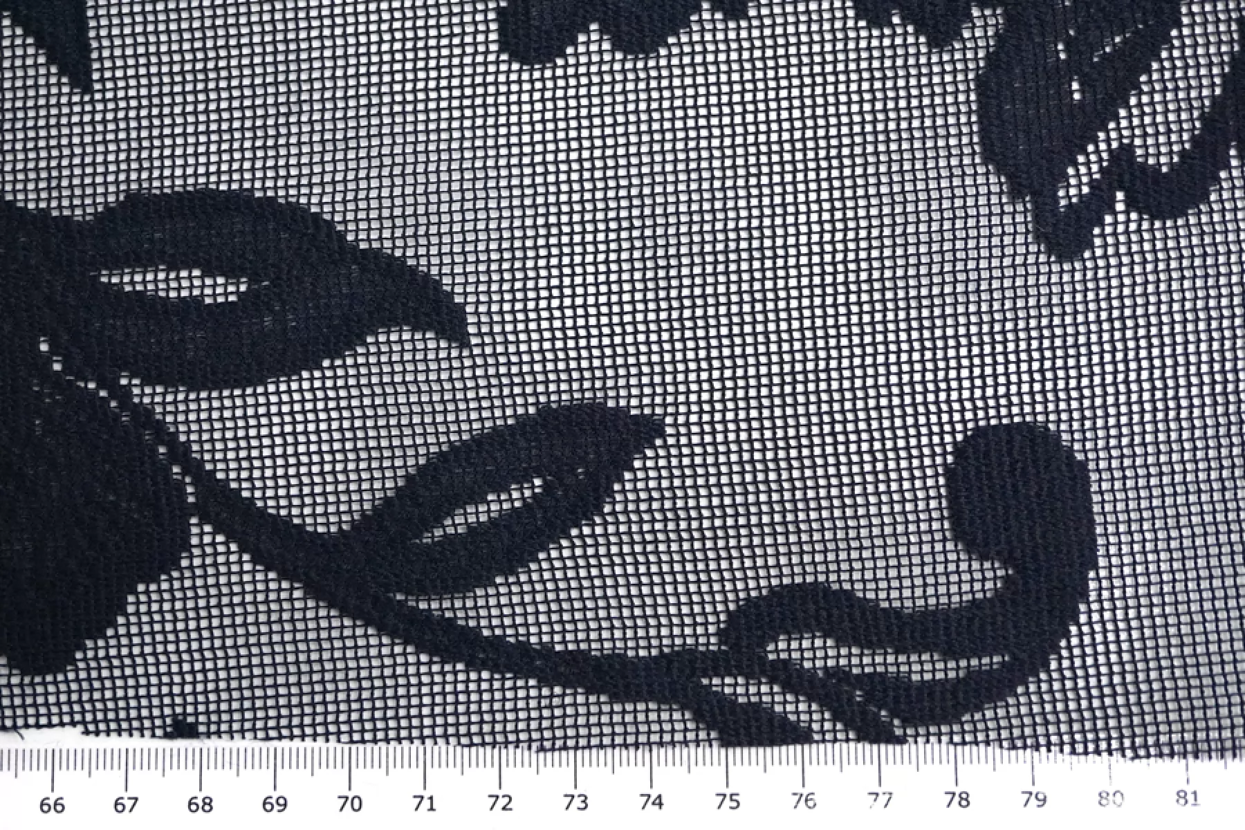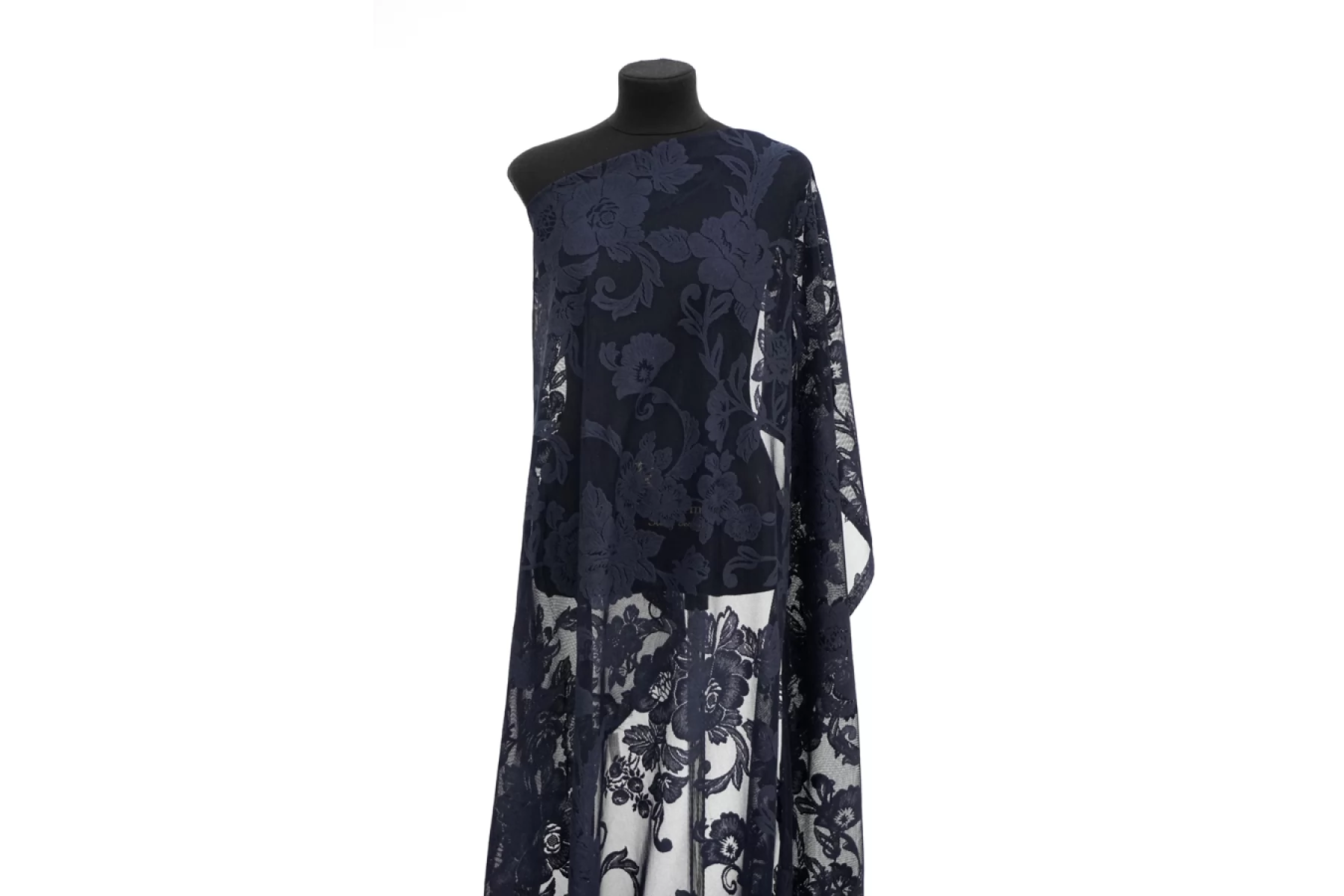 Интересная позиция - кружево темно-синего оттенка с основой в виде сетки из нейлона и выработкой достаточно крупных цветов из хлопка . Тактильно материал приятный и мягкий. Отлично подойдет для пошива самостоятельного изделия (на подкладе) или отделки отдельных элементов одежды.