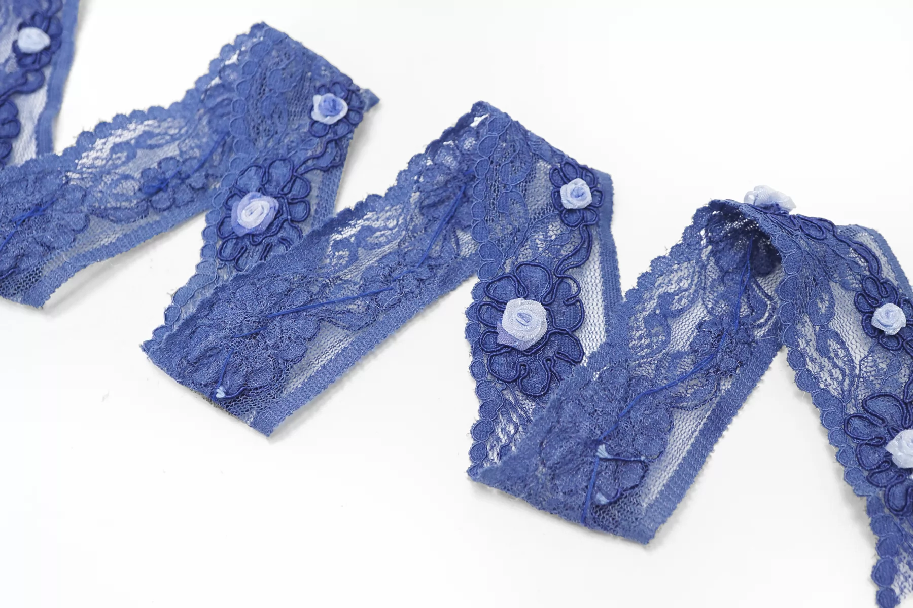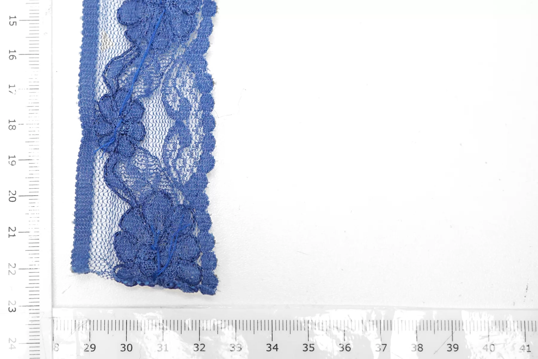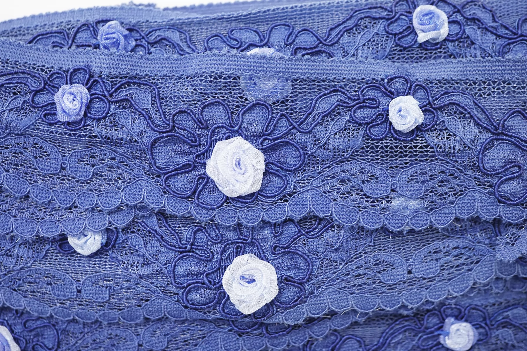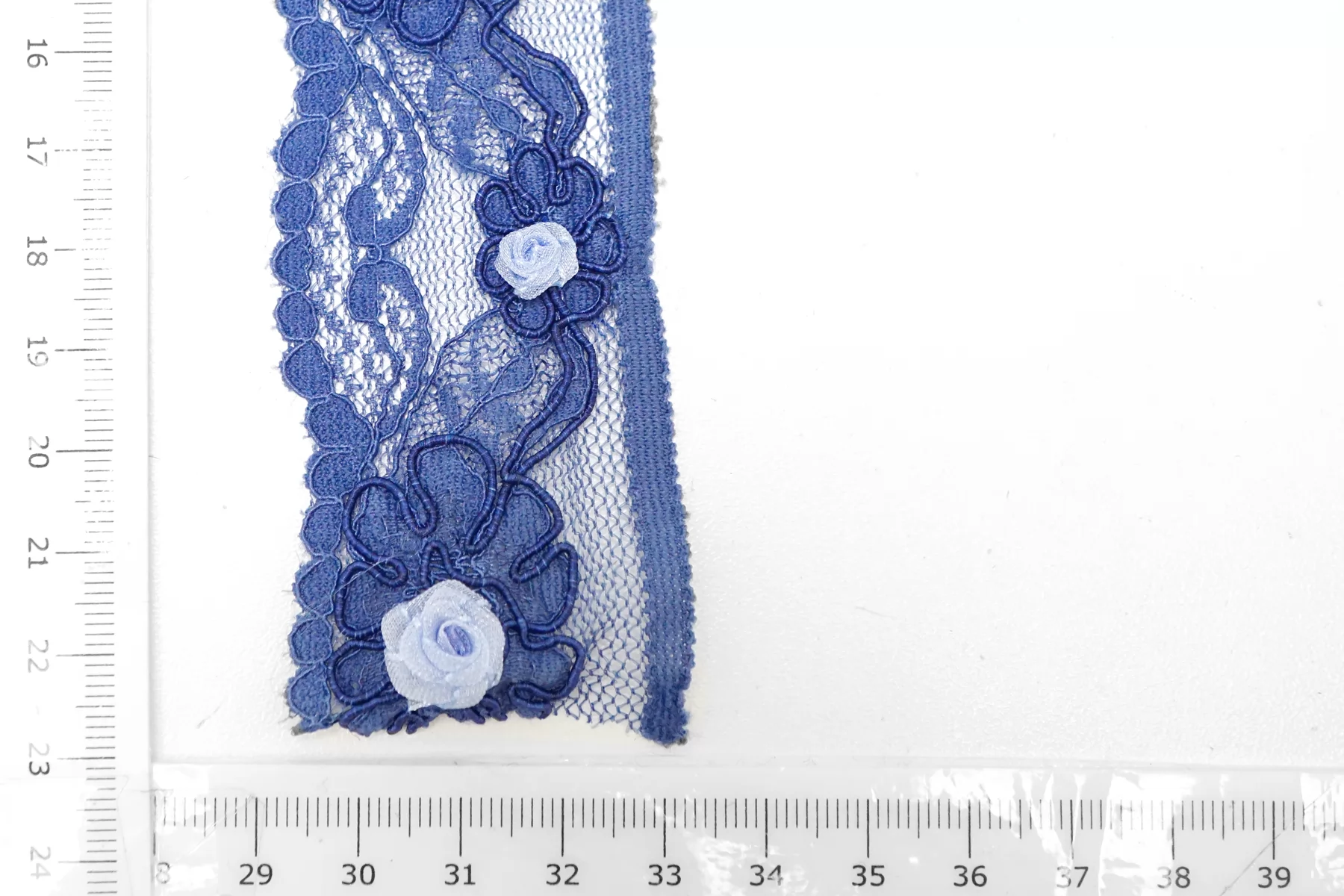 Итальянское кружево синего цвета с декоративными голубыми розочками и кордовым шнуром. Мягкое, пластичное. Не тянется. Отлично подойдет для пошива нижнего белья, отделки одежды и аксессуаров.