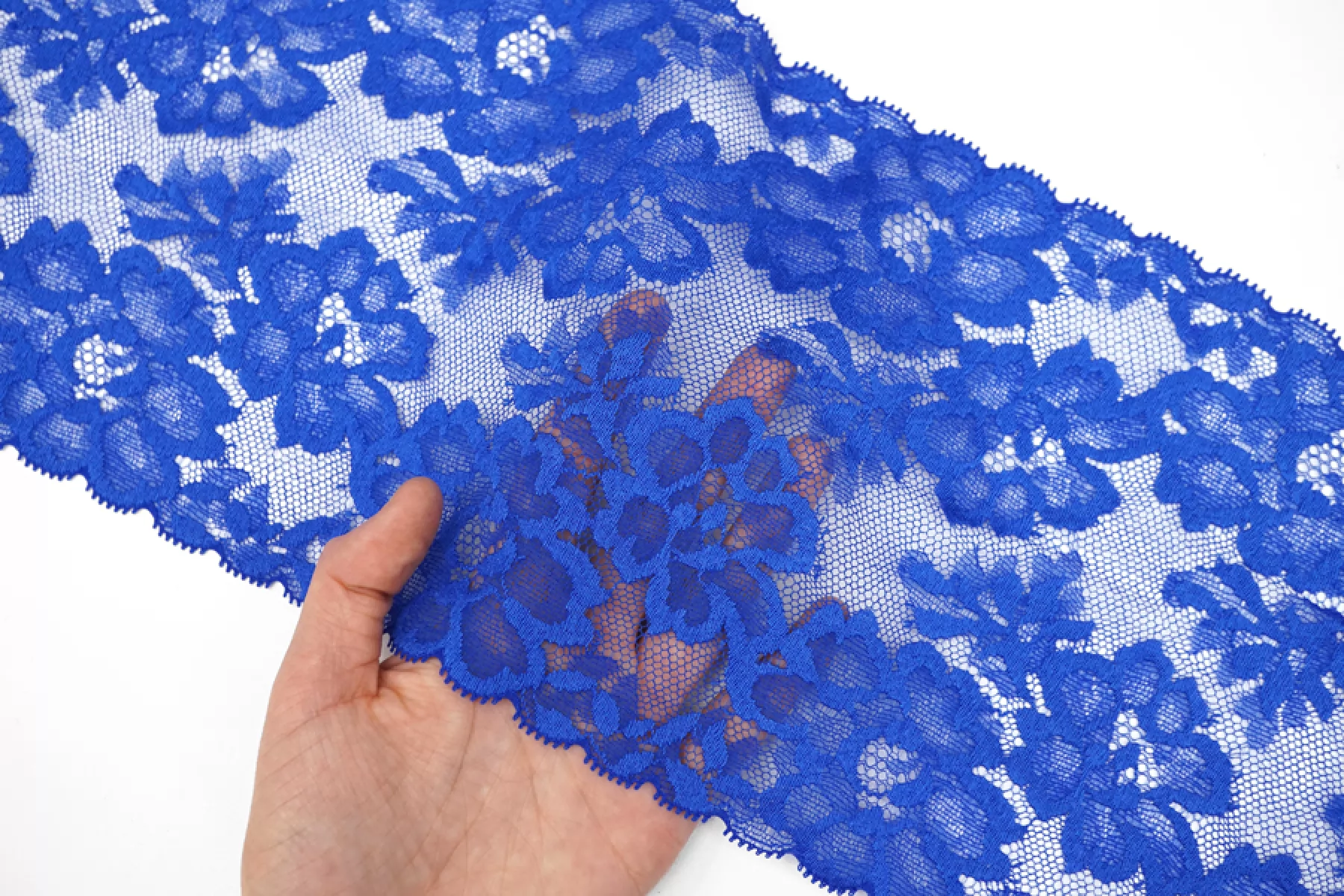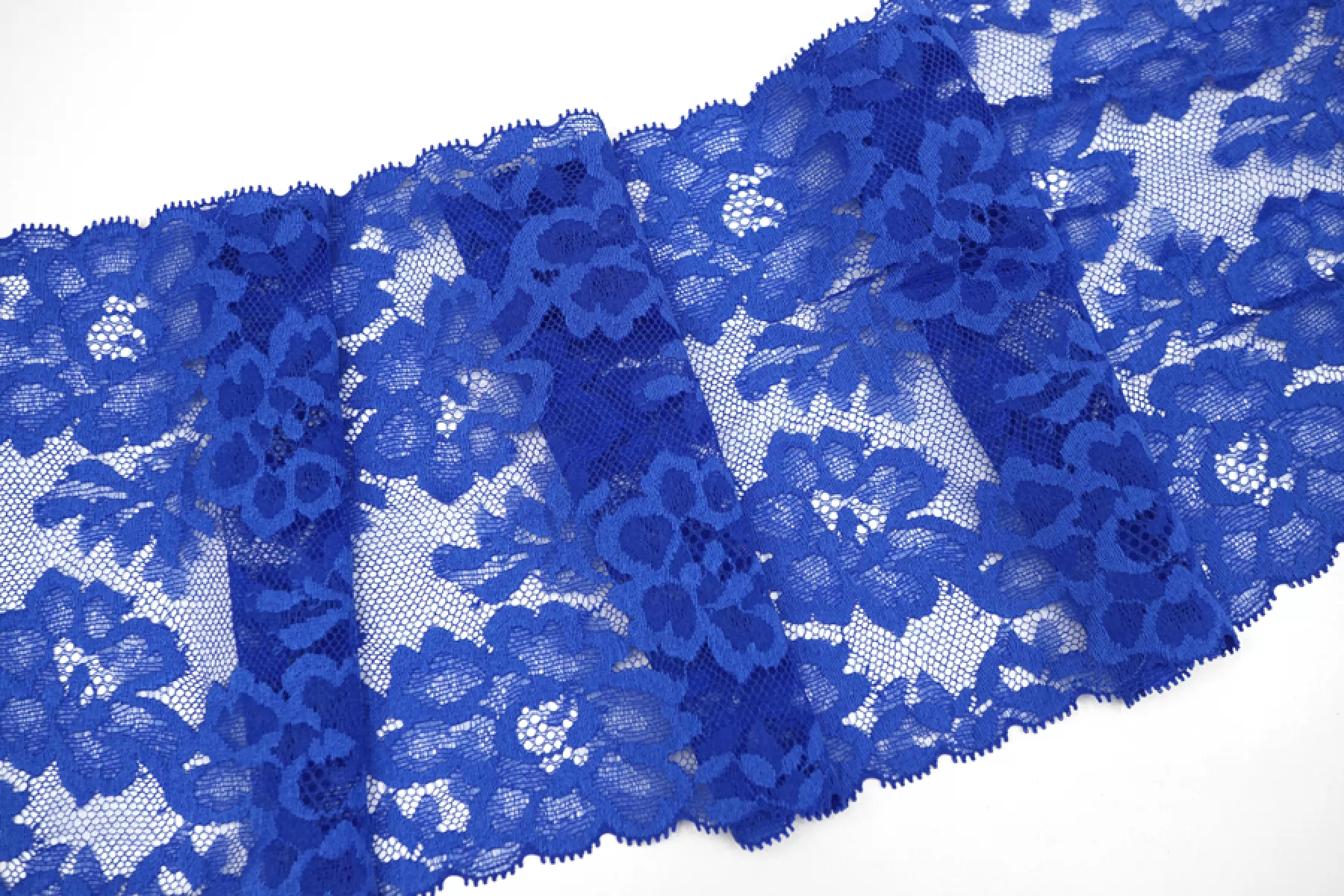 Итальянское эластичное кружево синего цвета. Мягкое, пластичное. Отлично подойдет для пошива нижнего белья, отделки одежды и аксессуаров.
