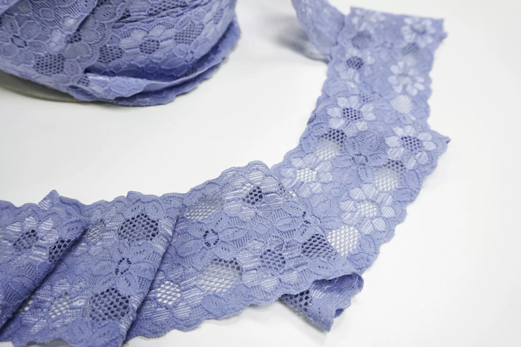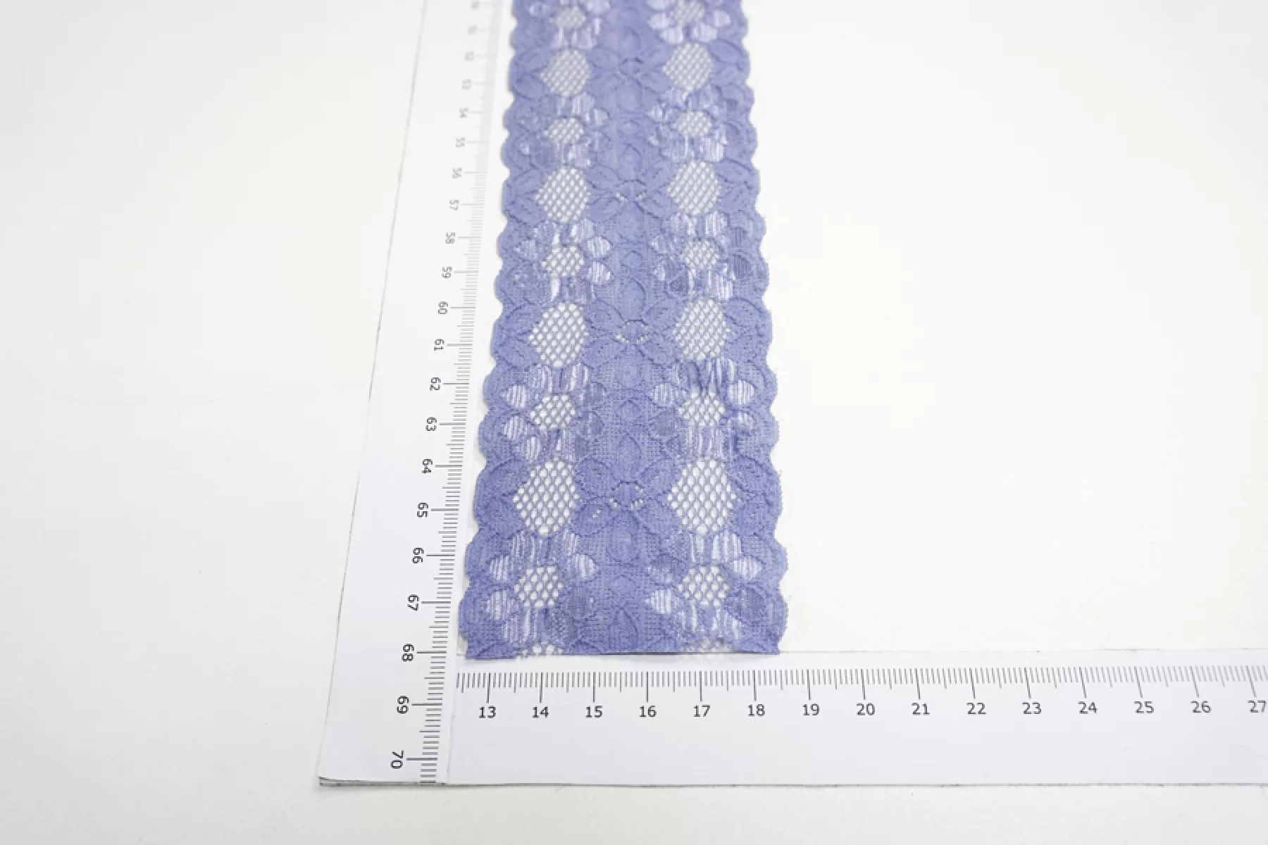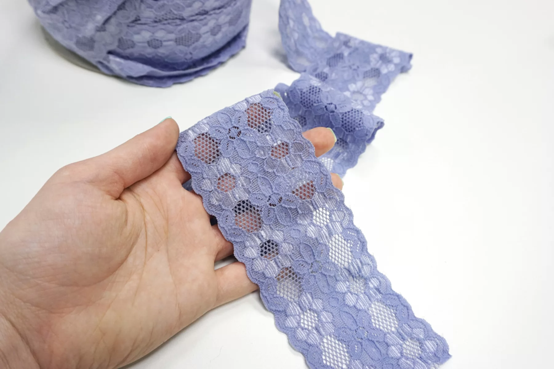 Итальянское кружево нежно-голубого цвета. Мягкое, пластичное. Отлично подойдет для пошива нижнего белья, отделки одежды и аксессуаров.