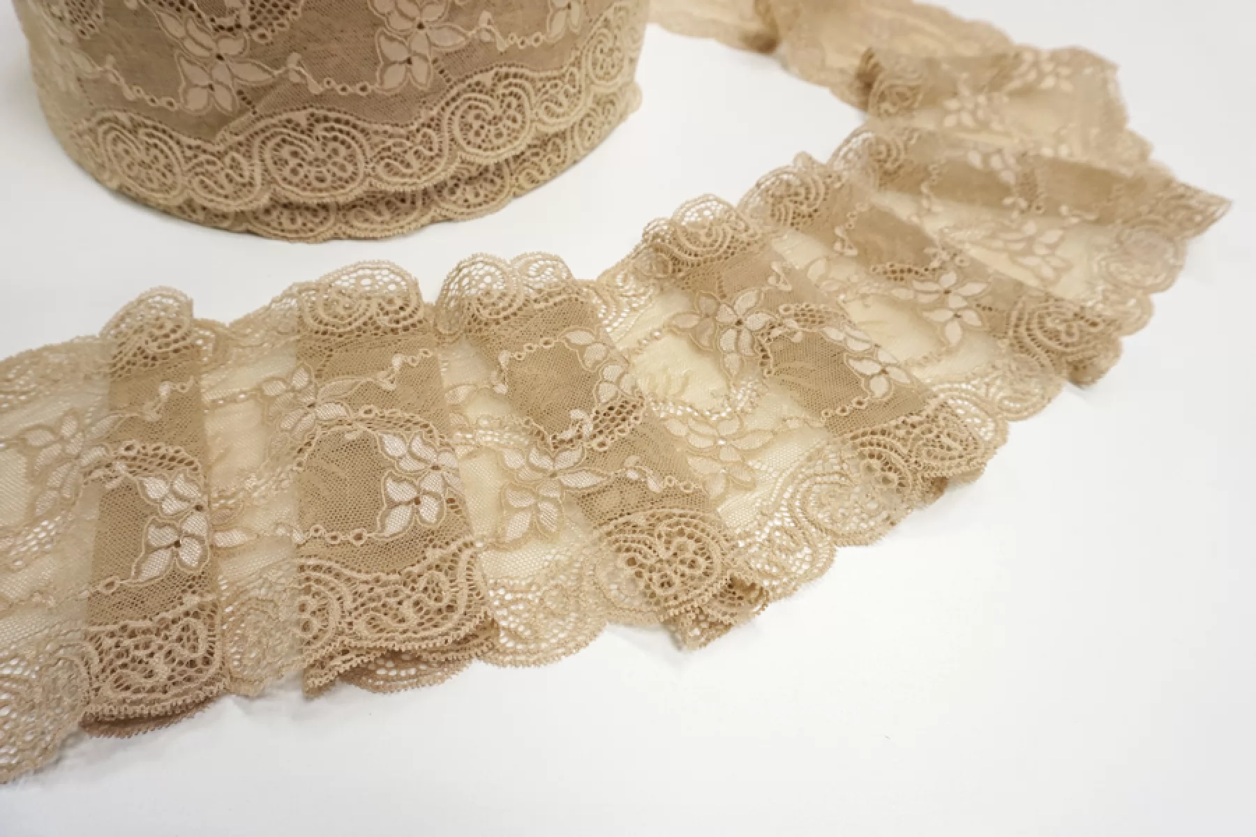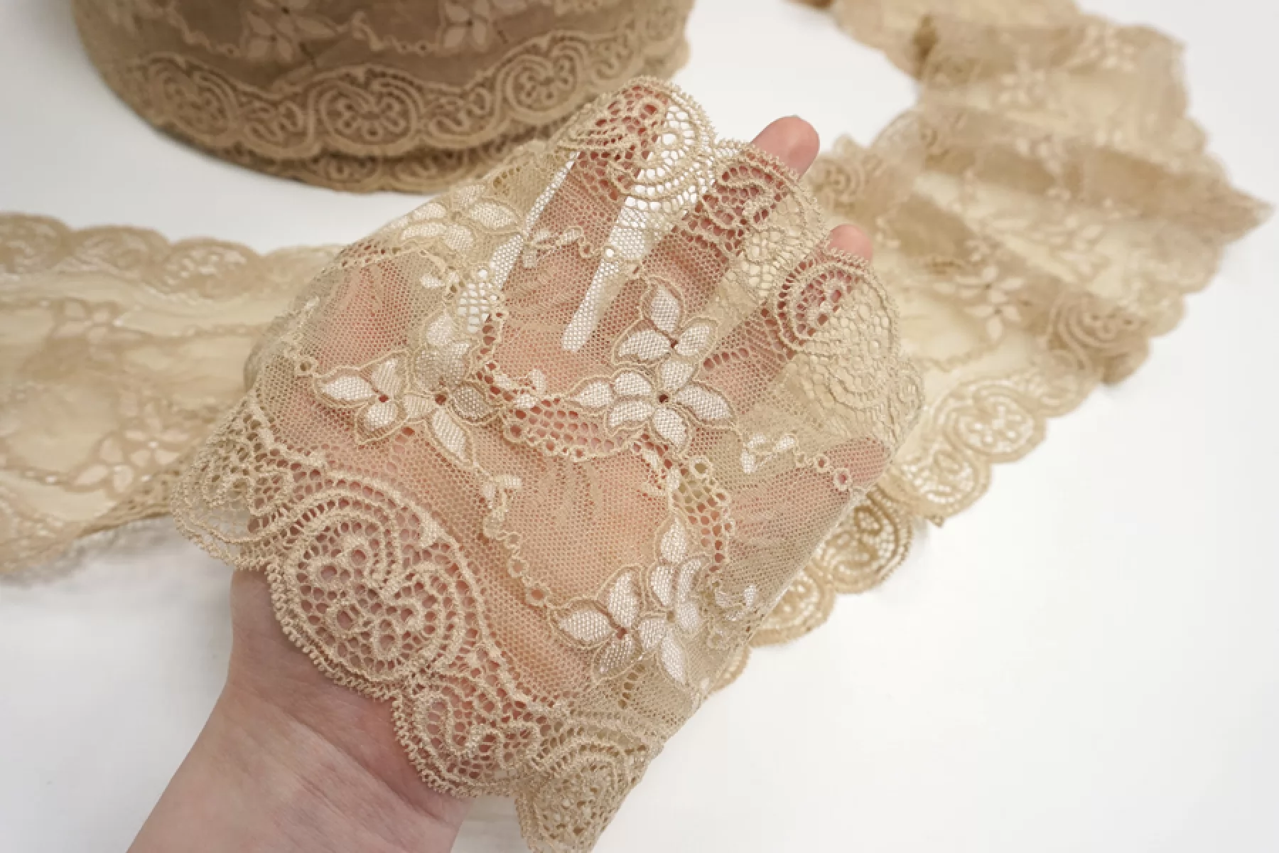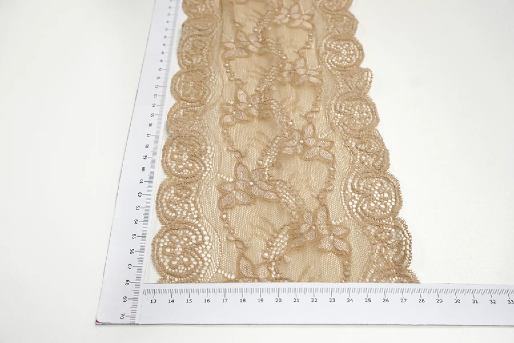 Итальянское кружево светло-кофейного цвета. Мягкое, пластичное. Отлично подойдет для пошива нижнего белья, отделки одежды и аксессуаров.