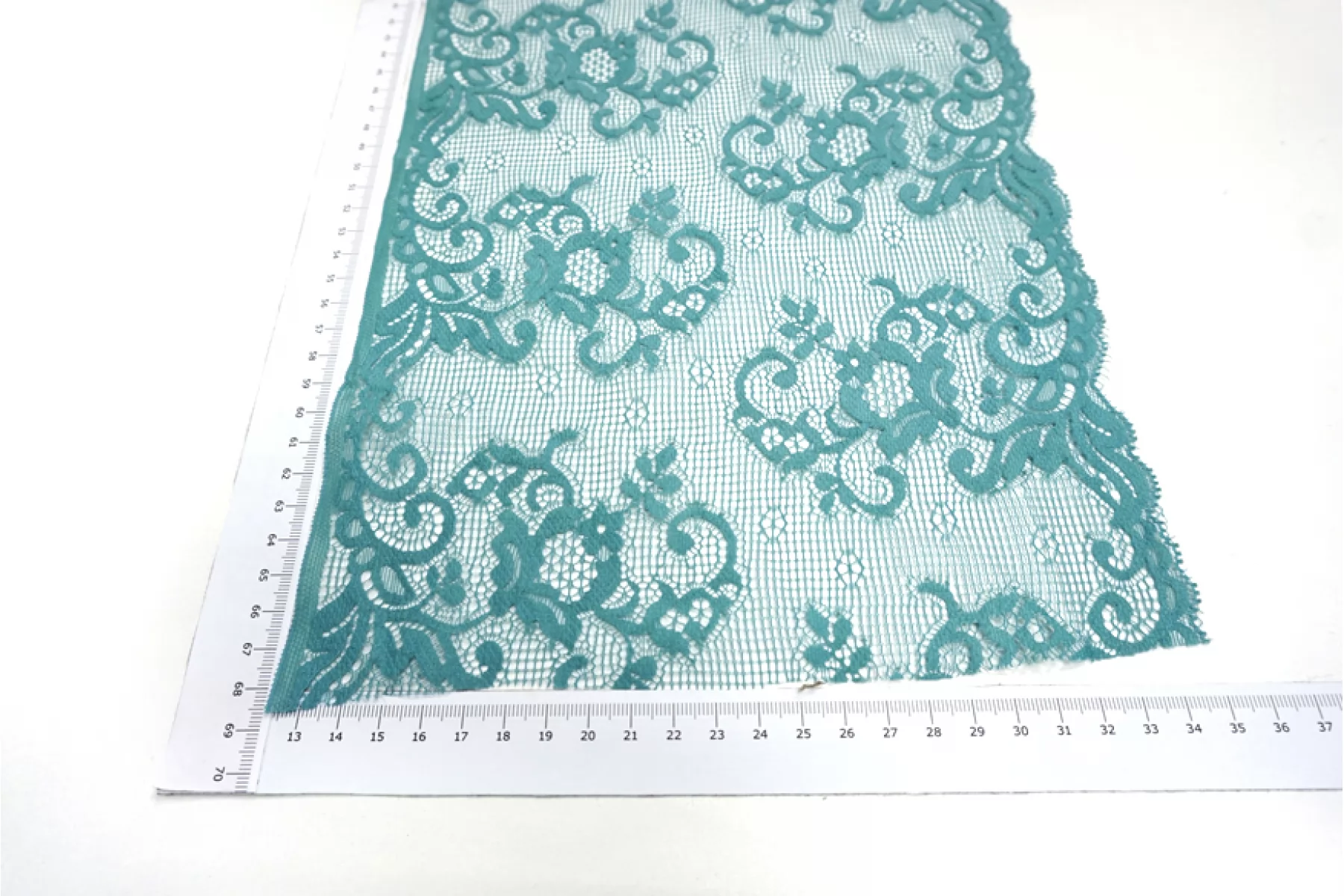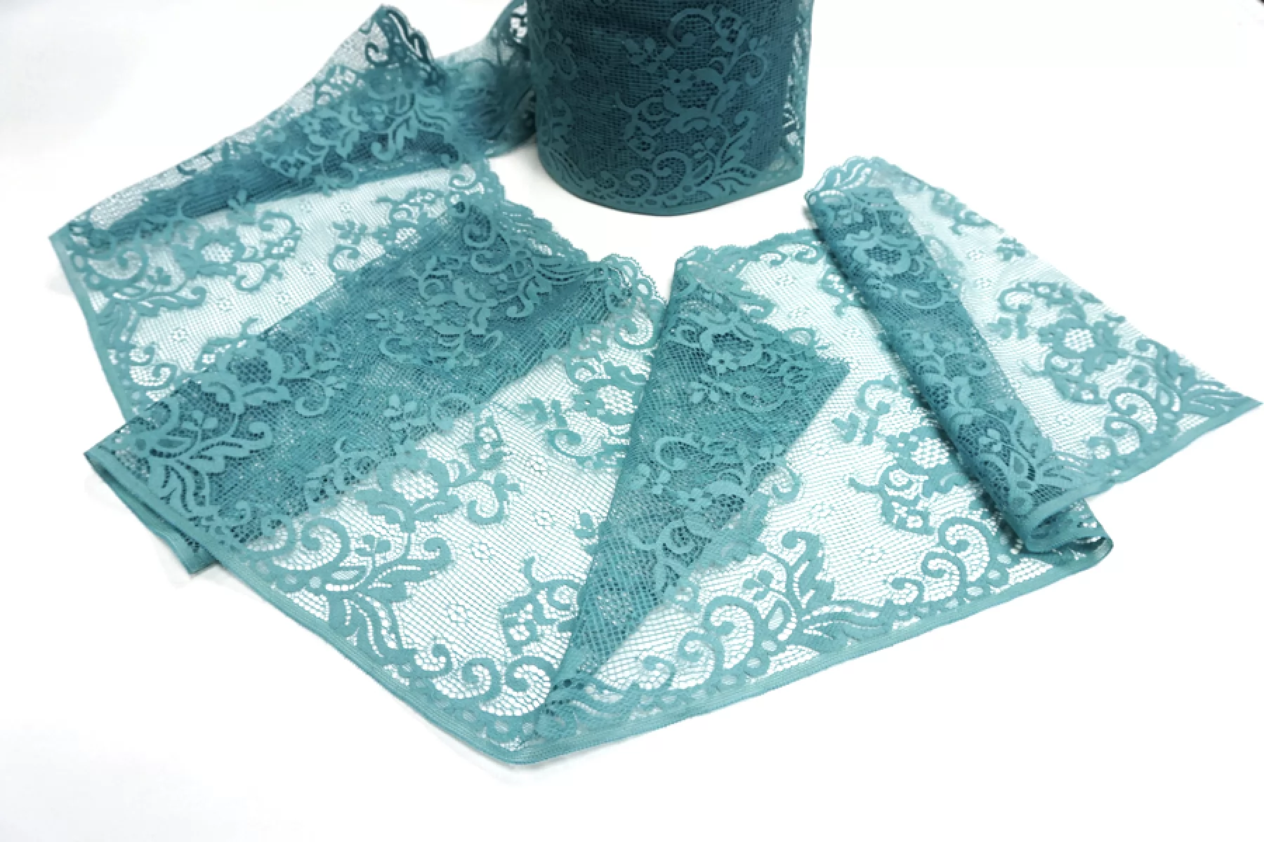 Итальянское кружево цвета пыльной бирюзы. Мягкое, пластичное. Отлично подойдет для пошива нижнего белья, отделки одежды и аксессуаров.
