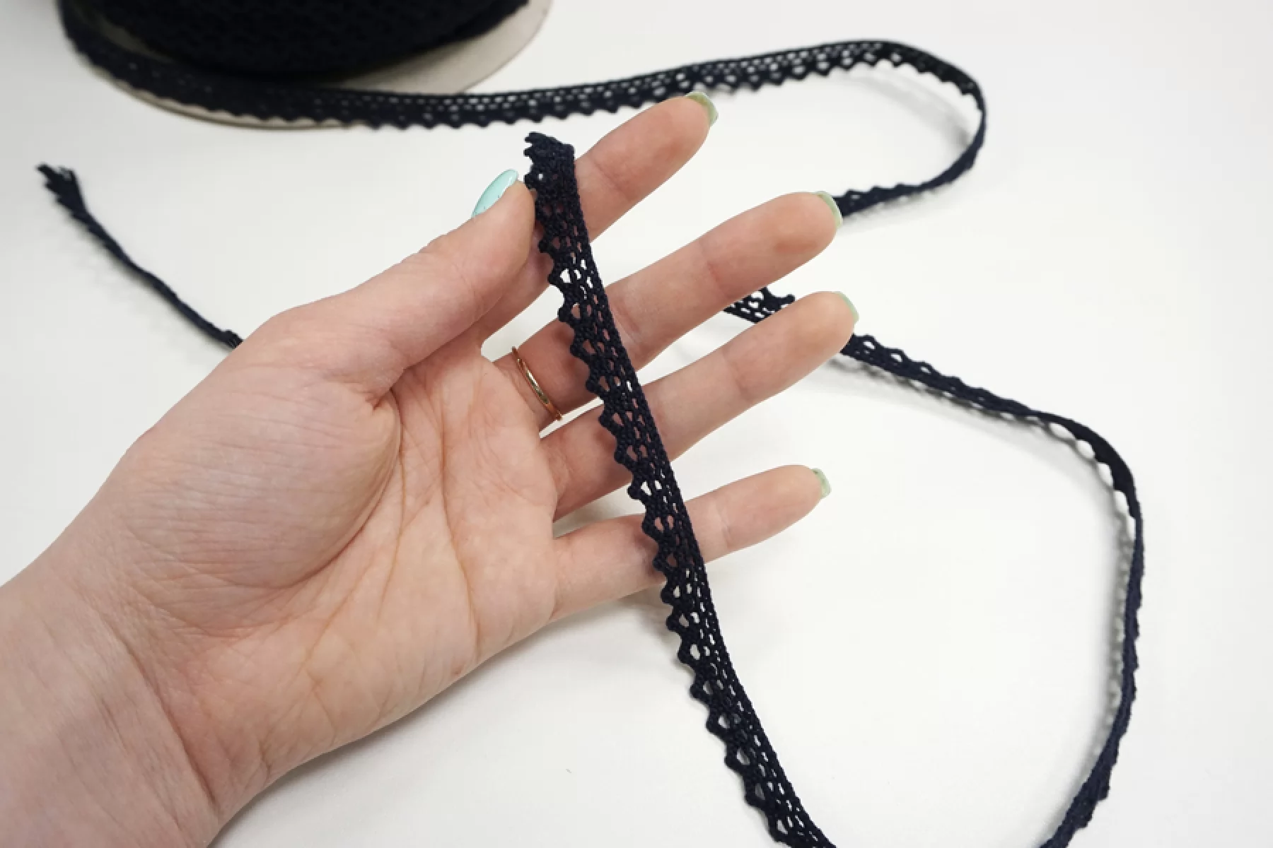 Итальянское кружево черного цвета. Плотное, тактильно жестковатое, хорошо держит форму.