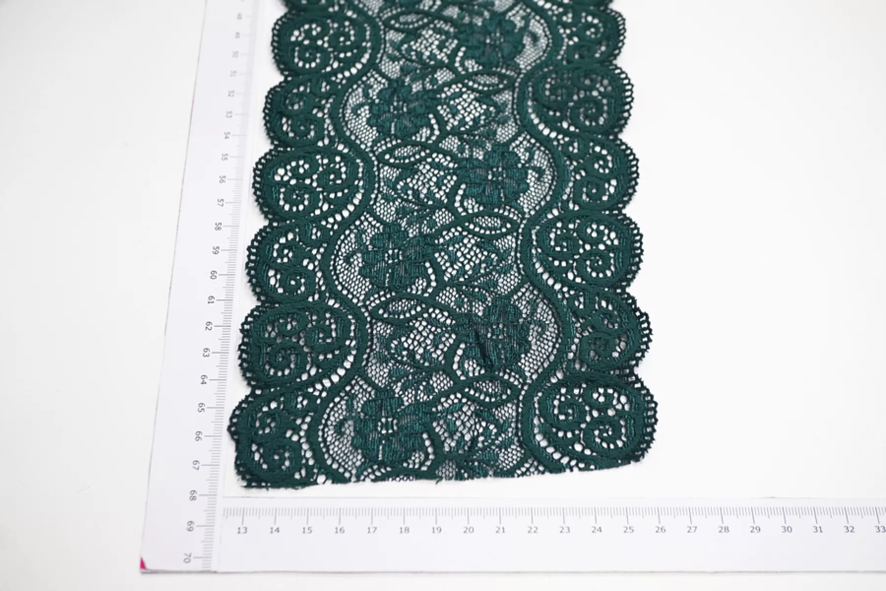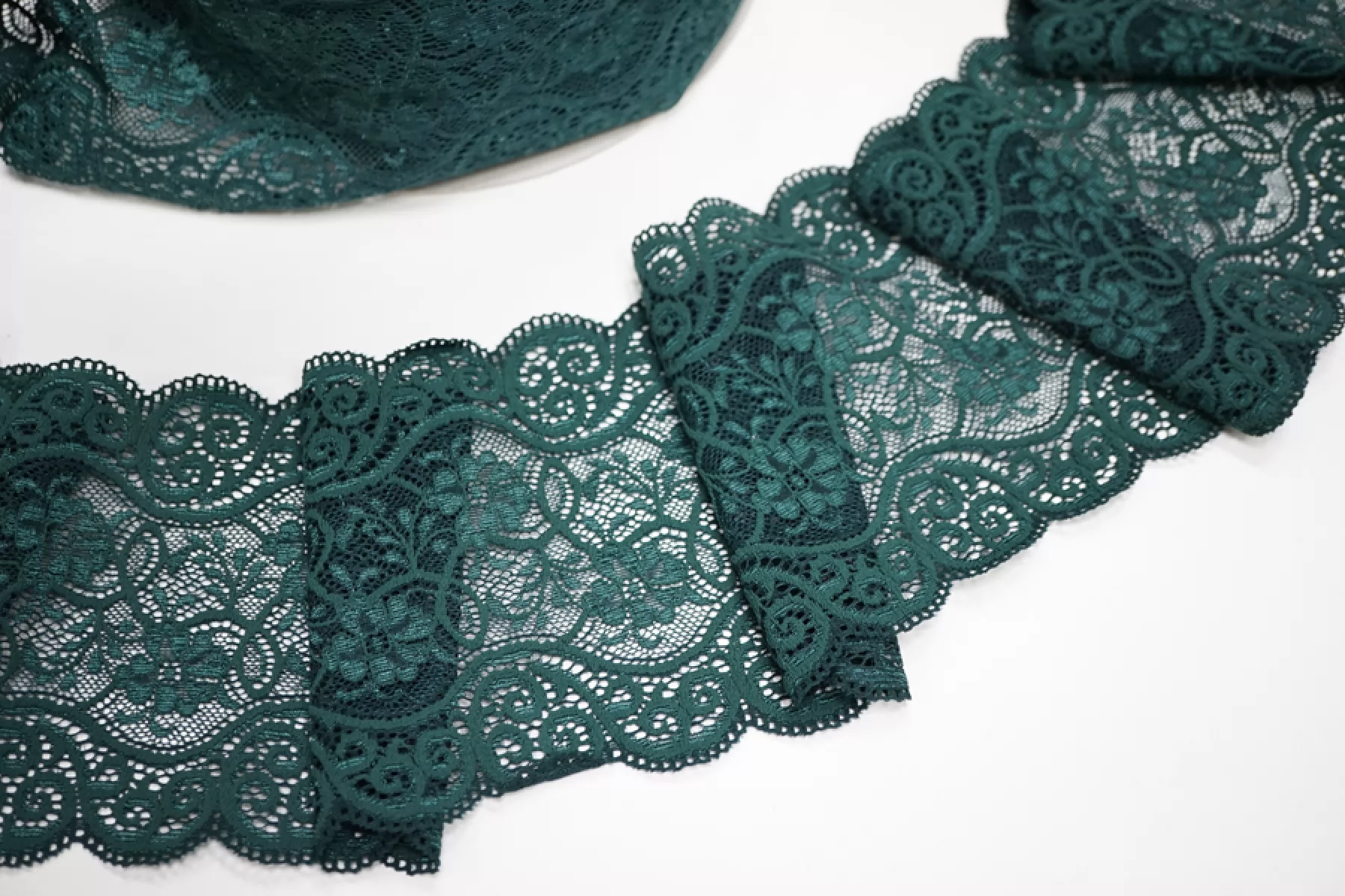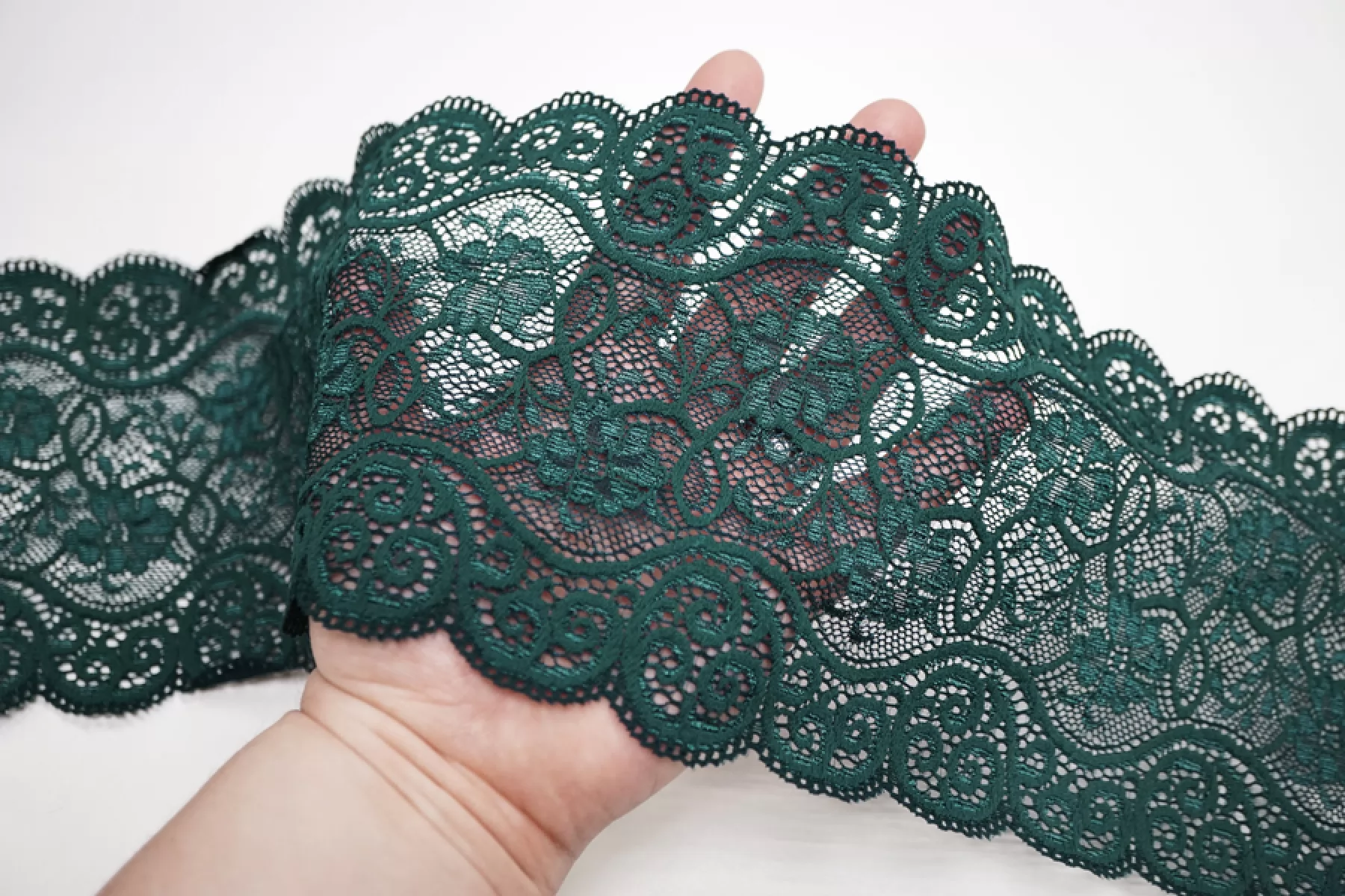 Итальянское кружево темно-зеленого цвета с блеском. Мягкое, пластичное. Отлично подойдет для пошива нижнего белья, отделки одежды и аксессуаров.