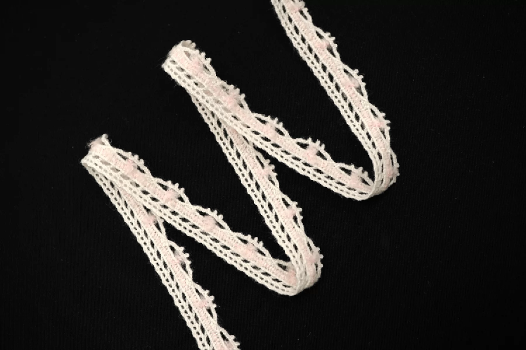 Итальянское кружево-тесьма молочного цвета с нежно-розовой вставкой. Мягкое, пластичное. Отлично подойдет для декорирования нижнего белья, одежды и аксессуаров.