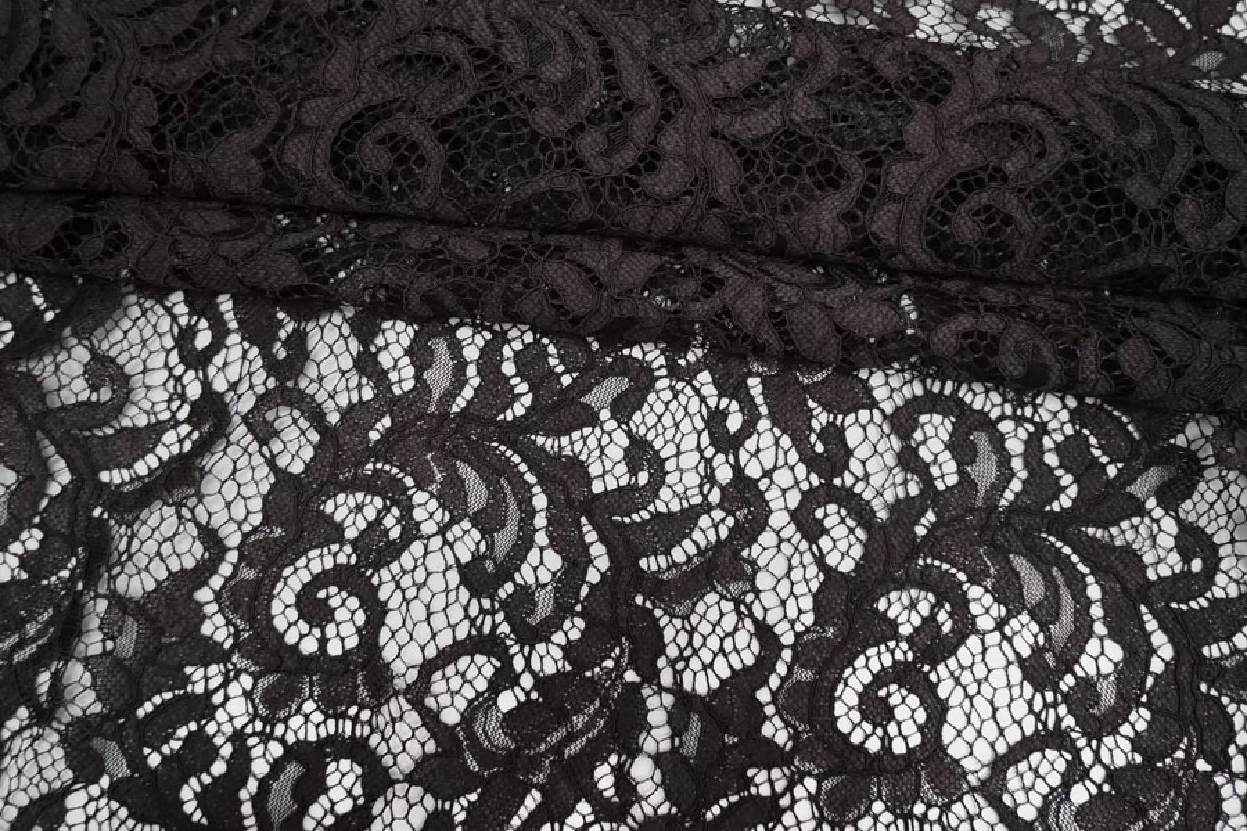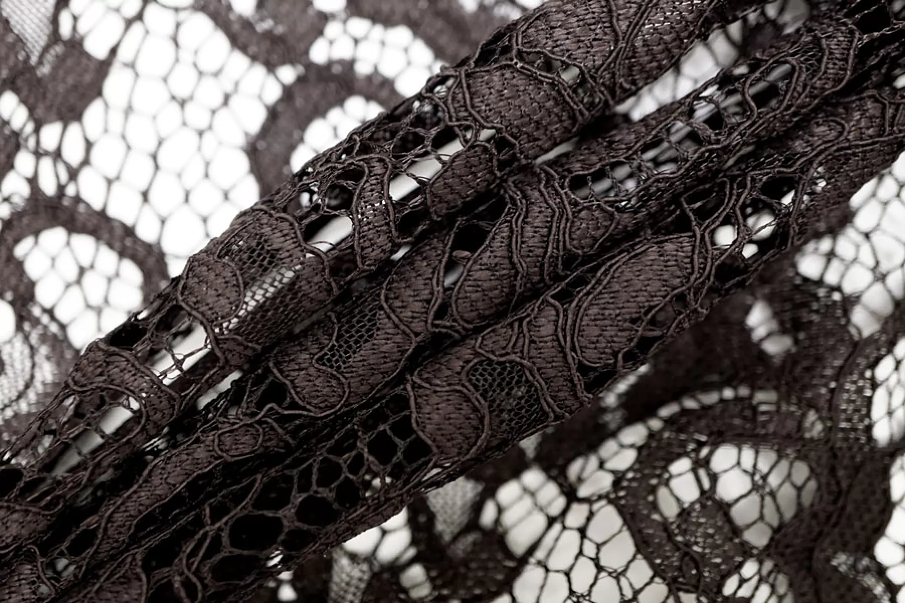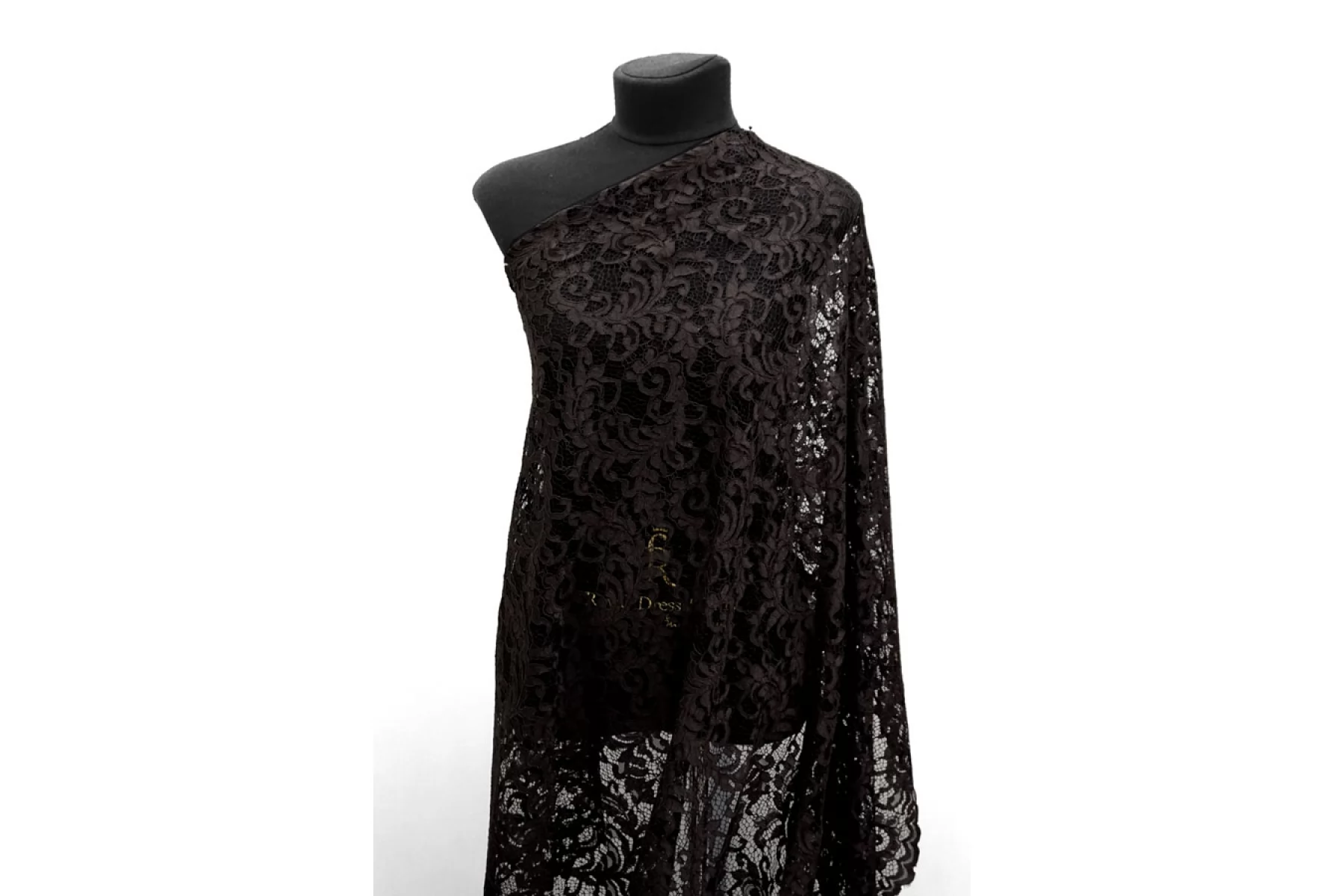 Итальянское кружево в тёмно-коричневом цвете (оттенок как у горького шоколада) с узором в виде цветов. Мягкое, фактурное. Практически не тянется. Не мнется, форму не держит, хорошо драпируется. Отлично подойдет для пошива самостоятельного изделия (на подкладе), или отделки отдельных элементов одежды и аксессуаров. Край фестонный.
