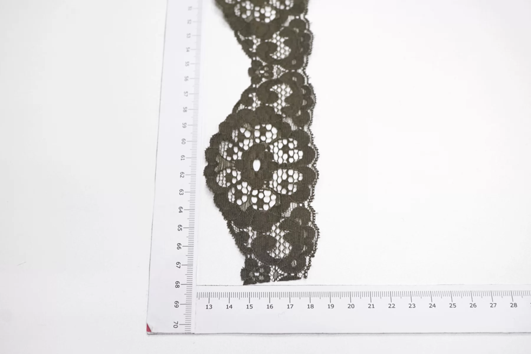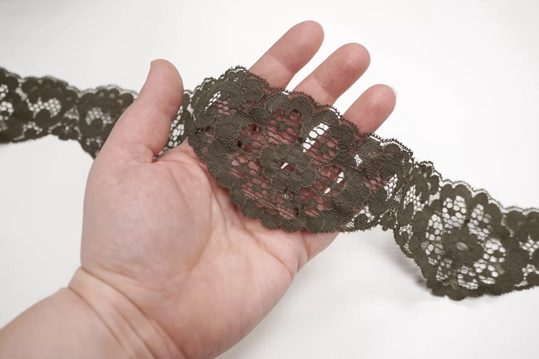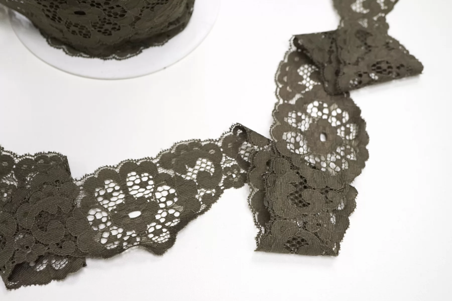 Итальянское кружево зеленовато-коричневого цвета. Мягкое, пластичное. Отлично подойдет для пошива нижнего белья, отделки одежды и аксессуаров.