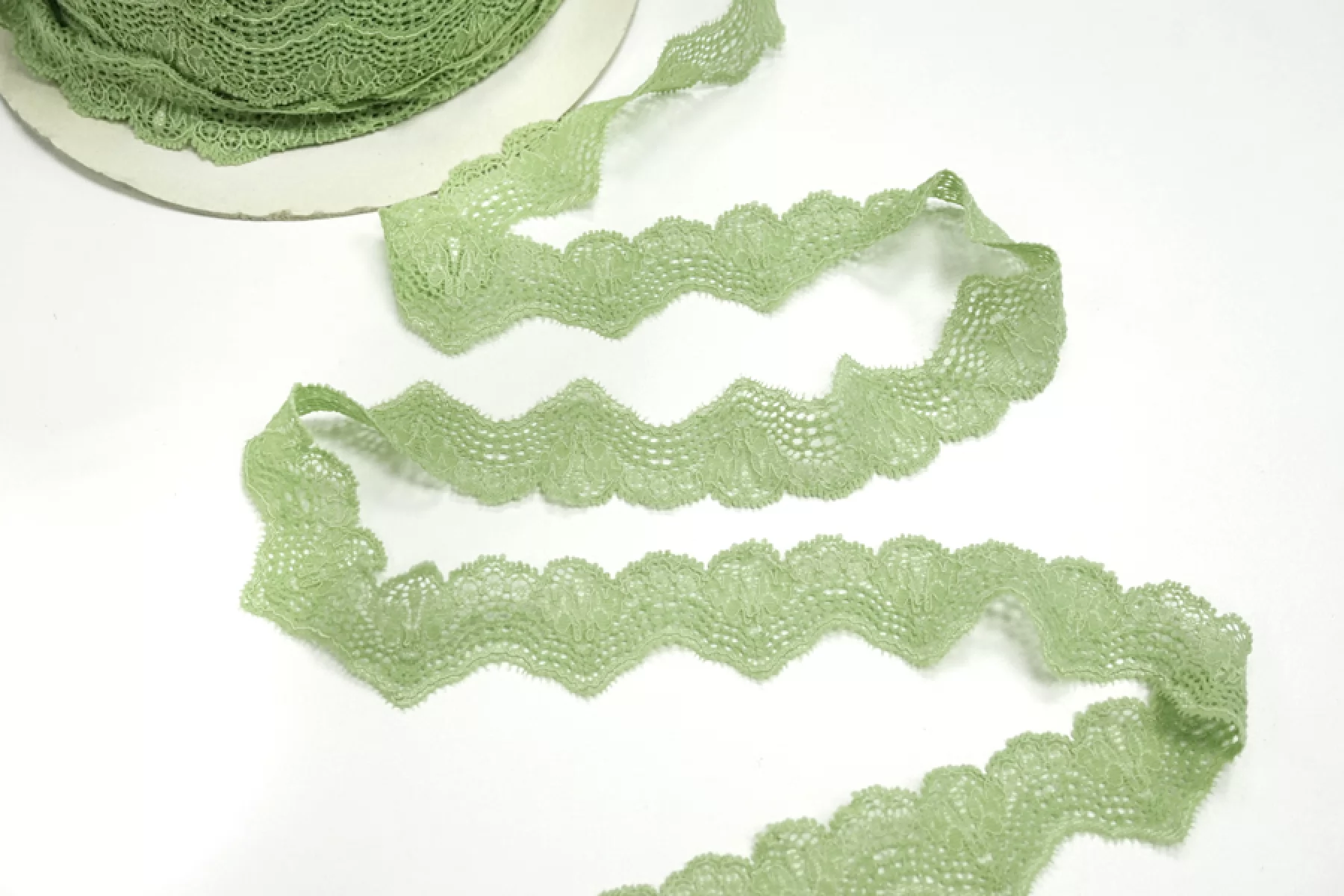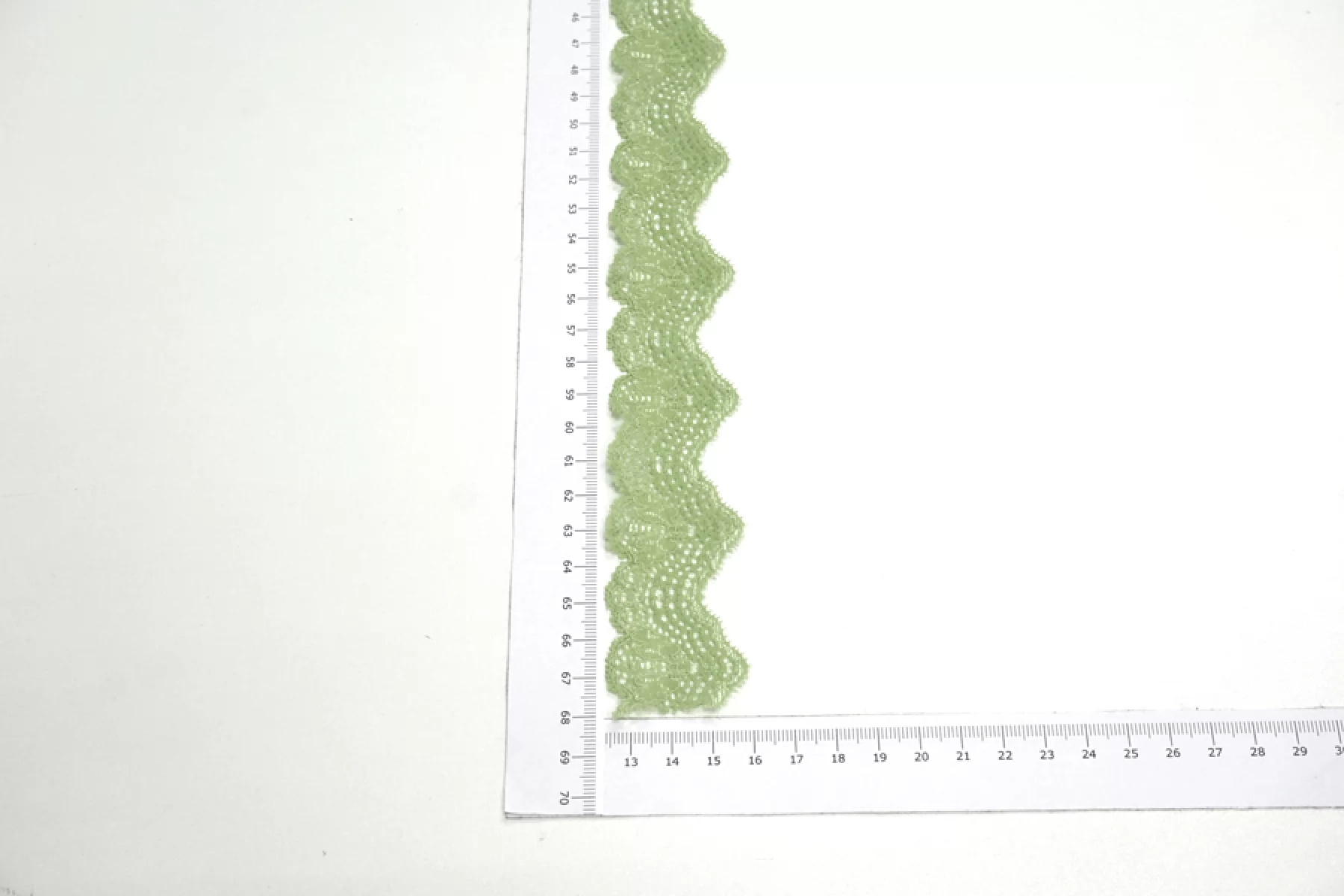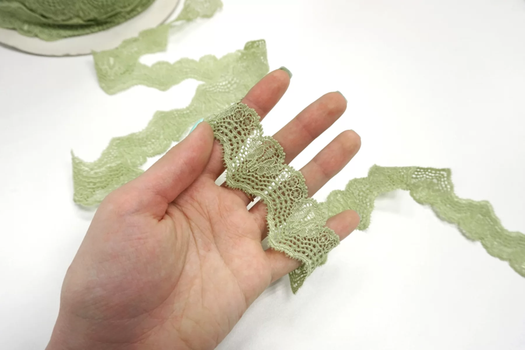 Итальянское кружево желто-зеленого цвета с блеском. Немного жесткое за счет объёмного рисунка нити, хорошо держит форму. Отлично подойдет для пошива нижнего белья, отделки одежды и аксессуаров.