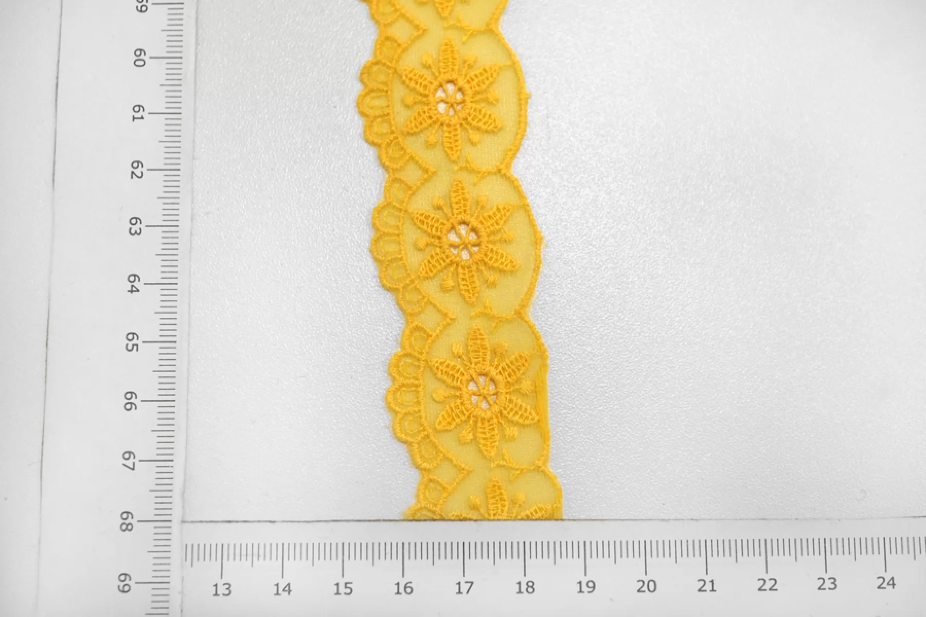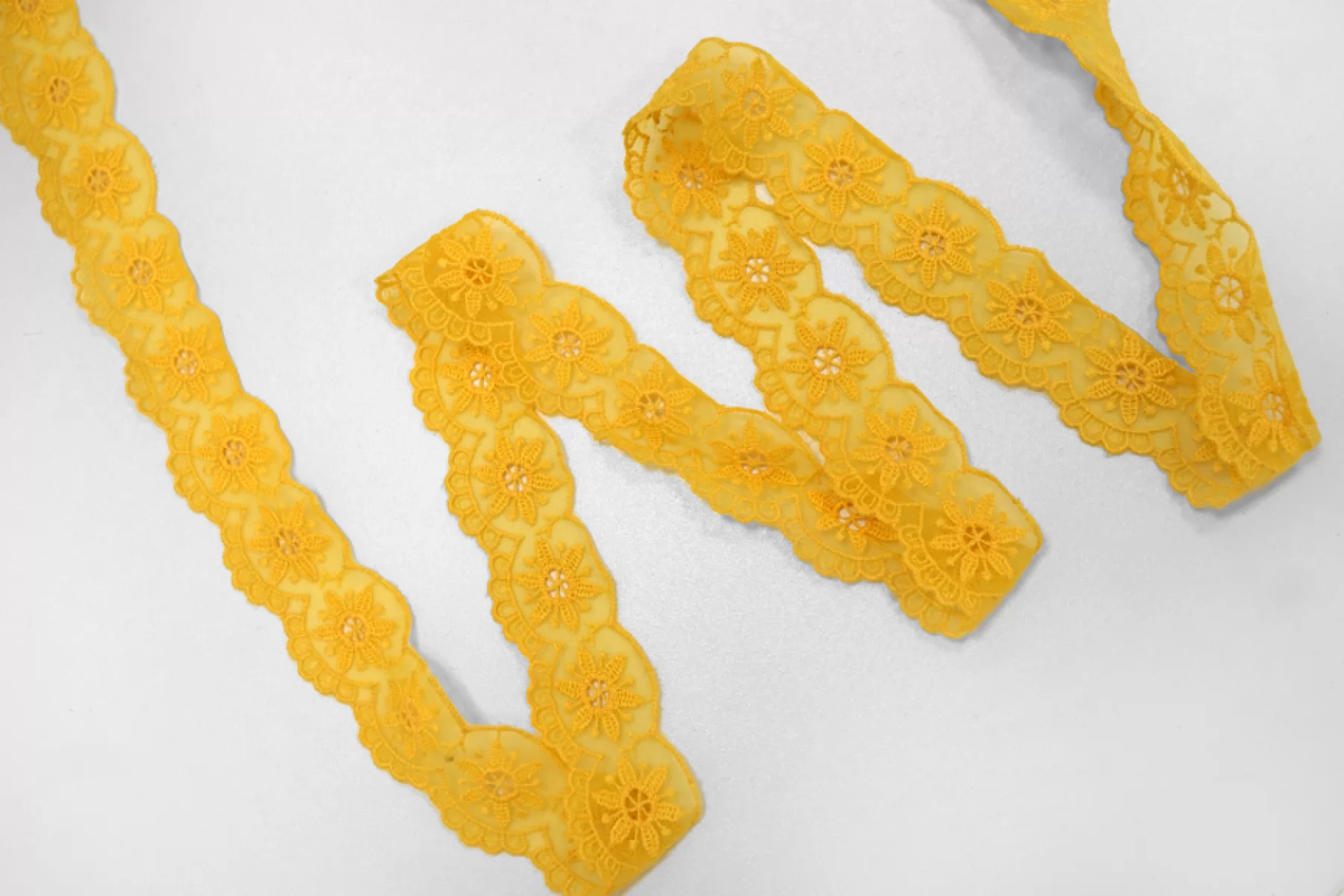 Итальянское кружево желтого цвета. Мягкое, пластичное. Отлично подойдет для пошива нижнего белья, отделки одежды и аксессуаров.