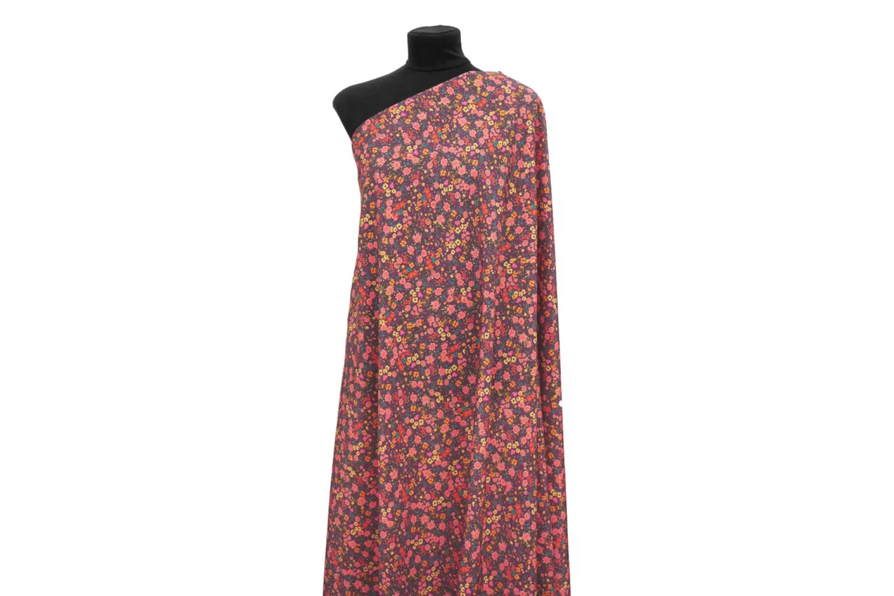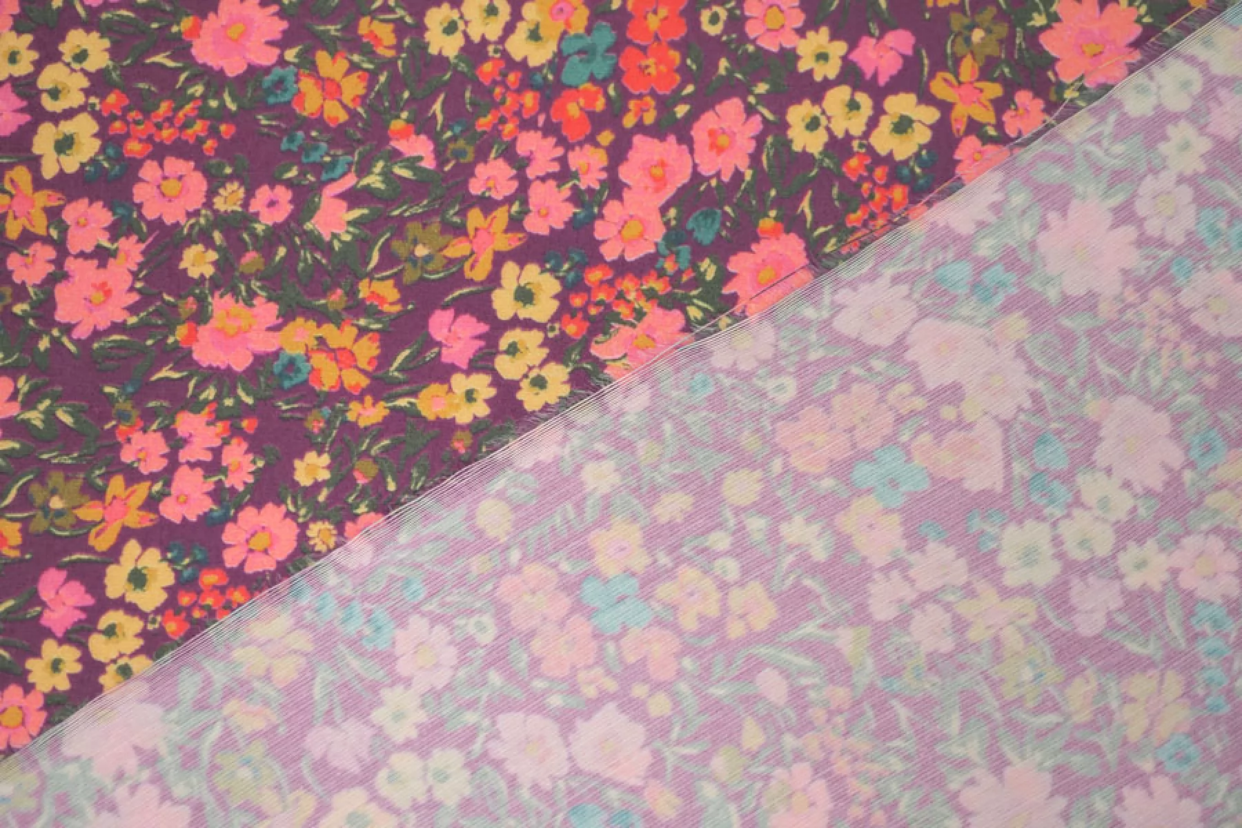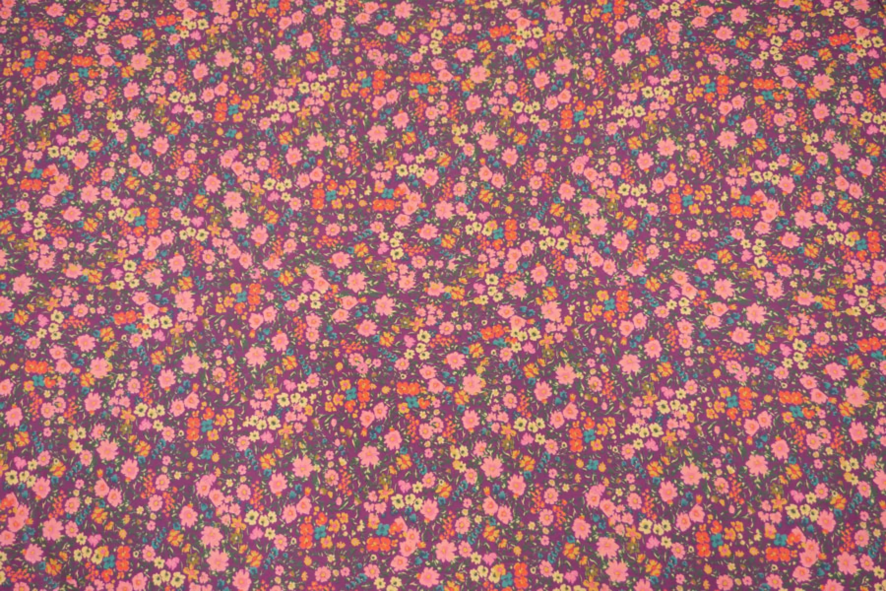 Плательно-рубашечная купра на нейлоне от GIAMBATTISTA VALLI в мелкие желто-розовые цветы на сливовом фоне. Материал невероятно нежный наощупь, слегка бархатисты, с красивым матовым лоском. Пластикой похож на органзу. Форму не держит. Не просвечивает. Практически не мнется. Отличный вариант на летние рубашки, платья, юбки.