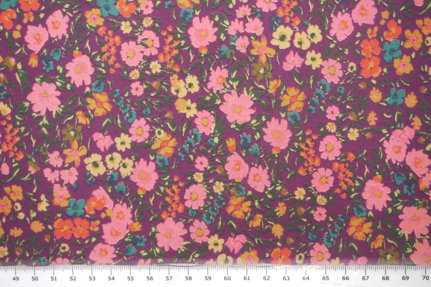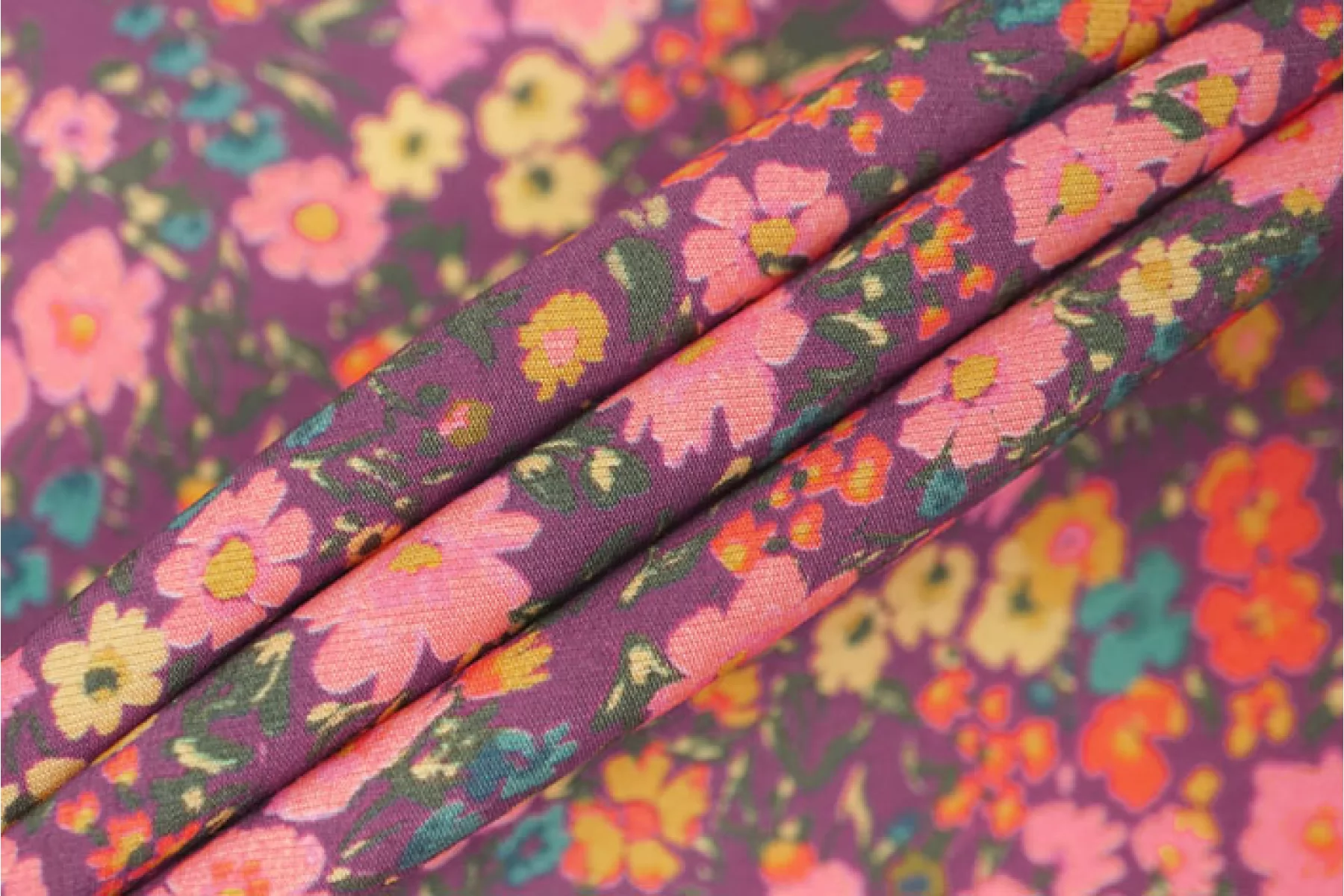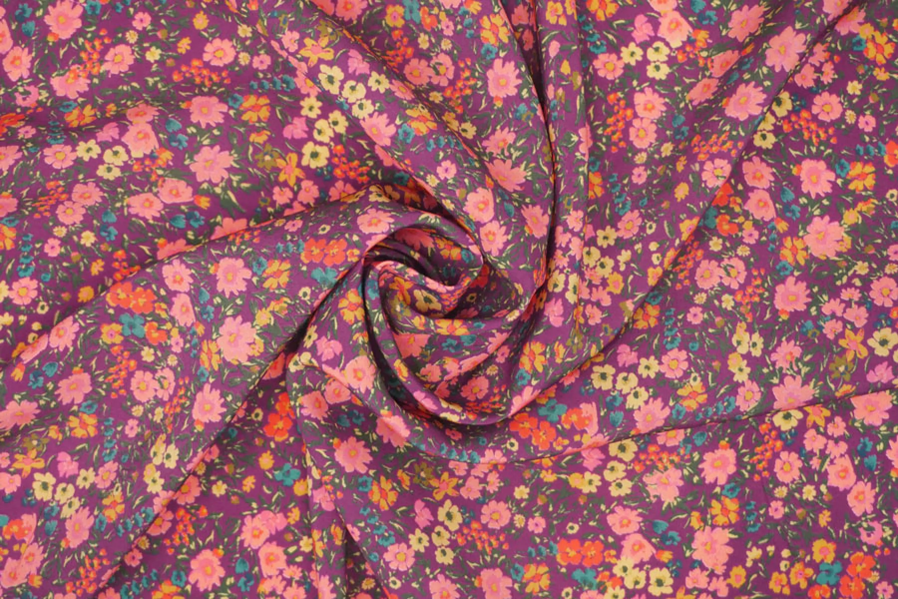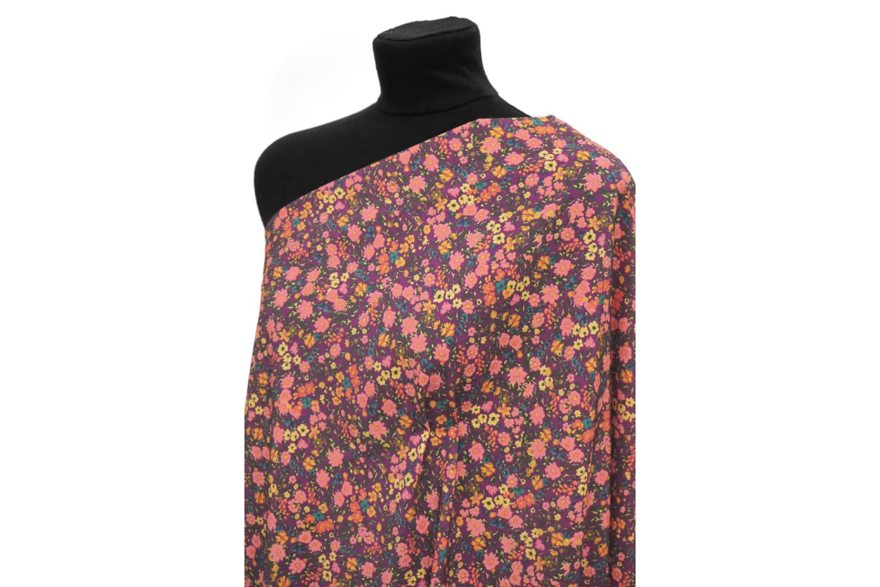 Плательно-рубашечная купра на нейлоне от GIAMBATTISTA VALLI в мелкие желто-розовые цветы на сливовом фоне. Материал невероятно нежный наощупь, слегка бархатисты, с красивым матовым лоском. Пластикой похож на органзу. Форму не держит. Не просвечивает. Практически не мнется. Отличный вариант на летние рубашки, платья, юбки.