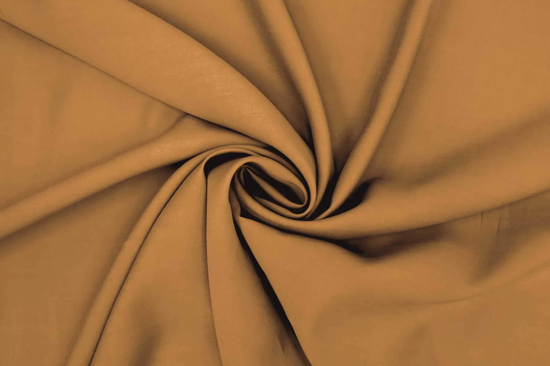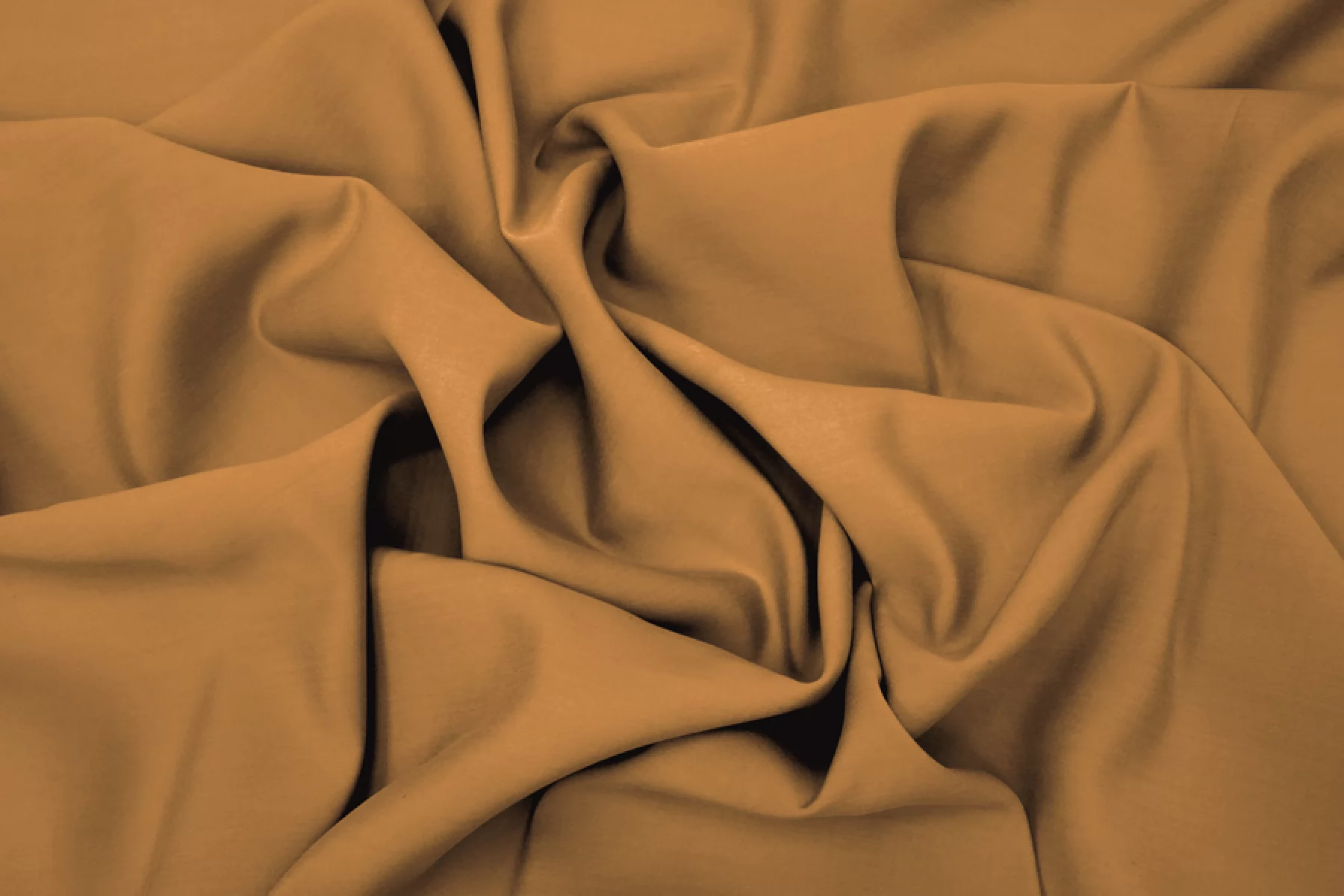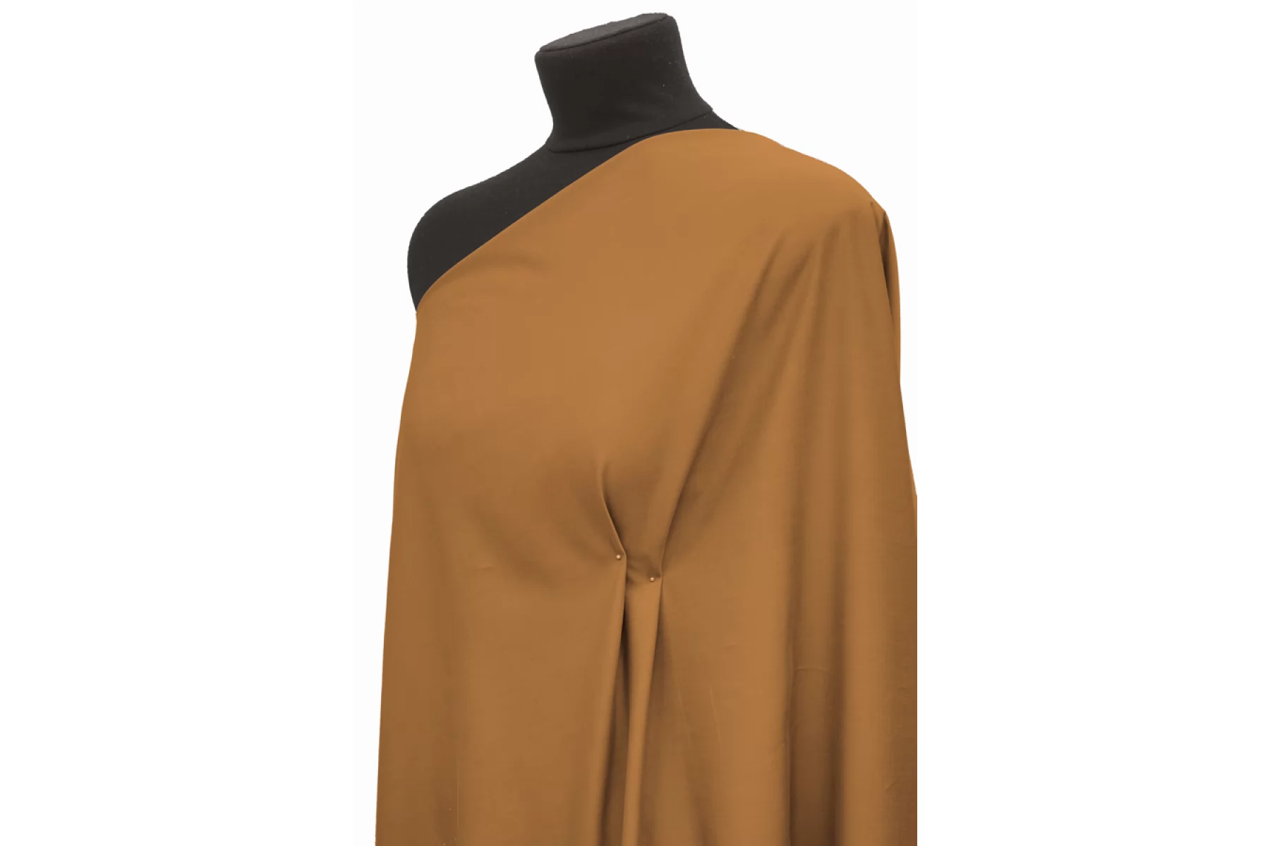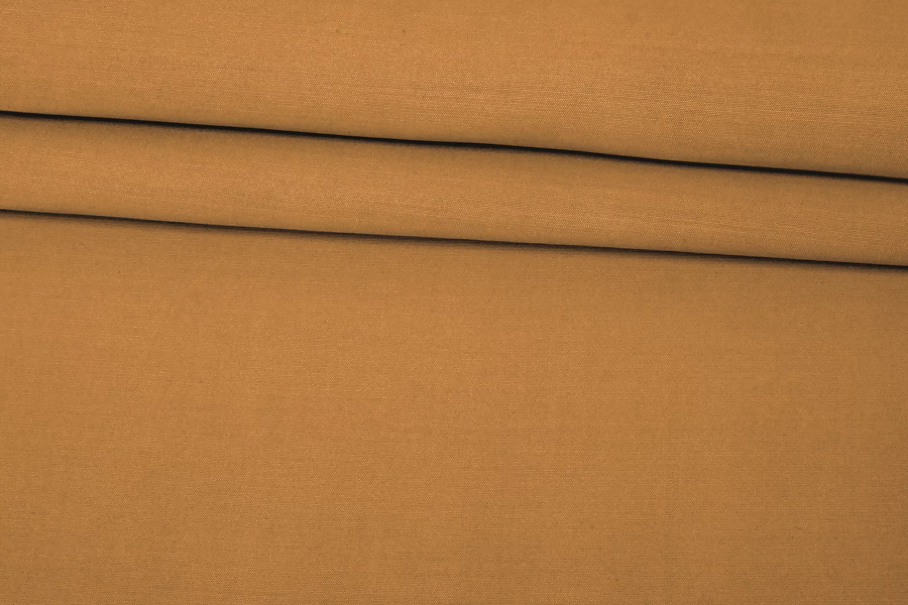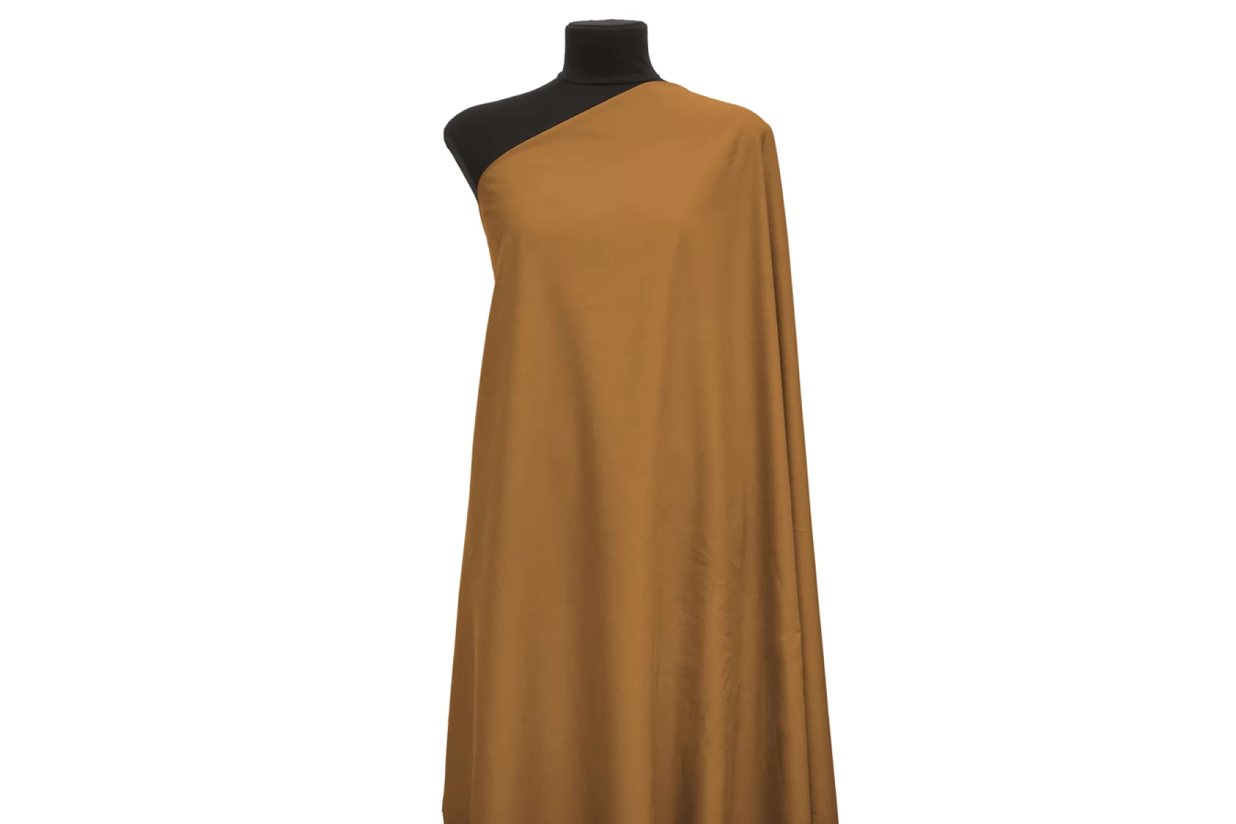 Плательная купра красивого оттенка кэмел с легким матовым лоском. Материал тактильно очень приятный, мягкий, слегка напоминает замшу на ощупь. В основу материала вплетены нити нейлона, что позволяет лучше держать складки и форму. Не тянется. Сминается. Прекрасно смотрится в своей пластике и движении. Не просвечивает, но заметен контур силуэта, если смотреть прямо на просвет. Вариант на платья, рубашки, брюки, юбки и не только. При необходимости используйте подкладочный материал.