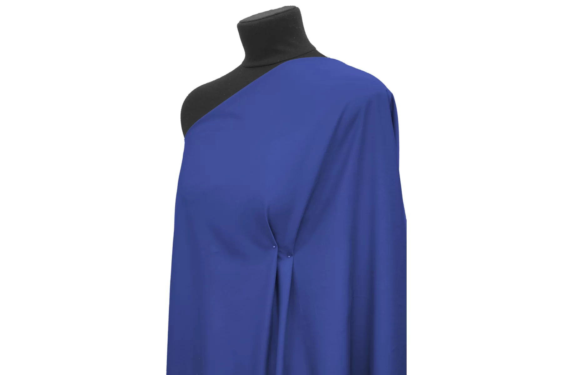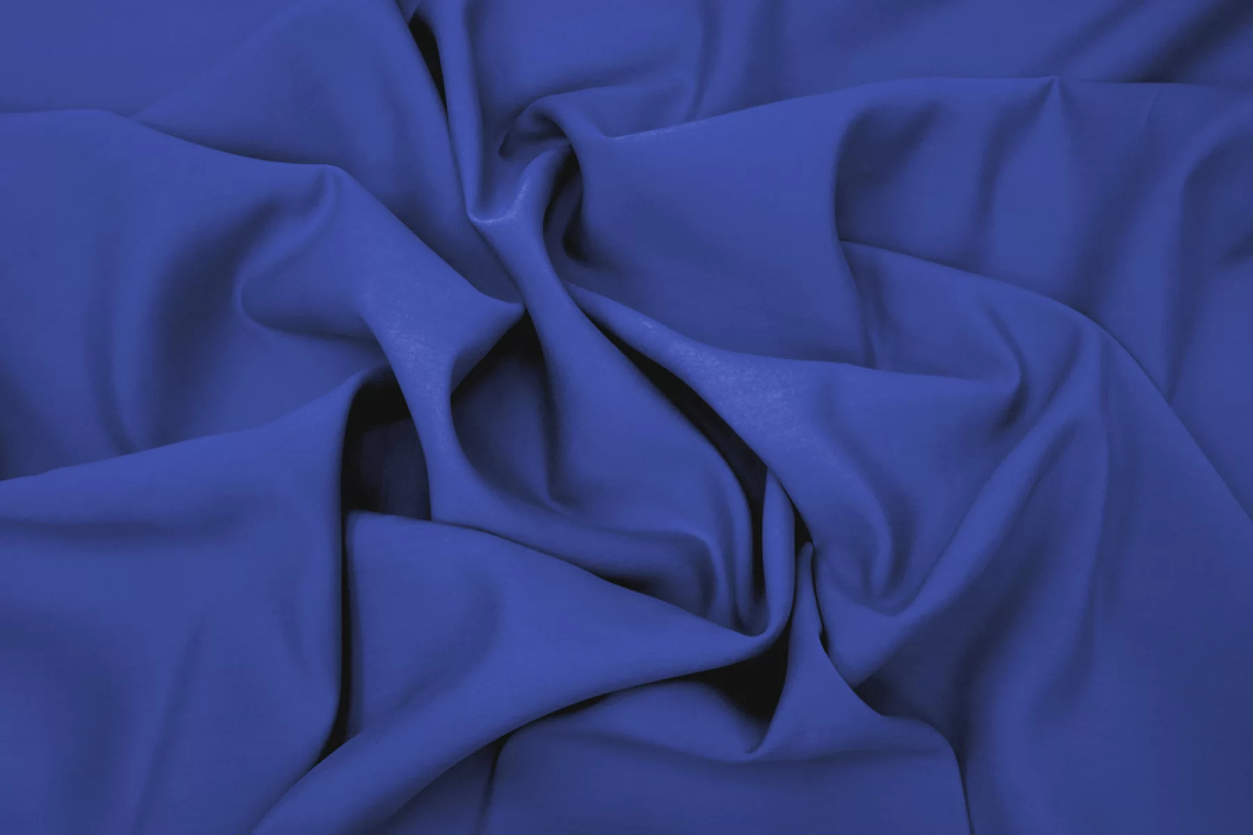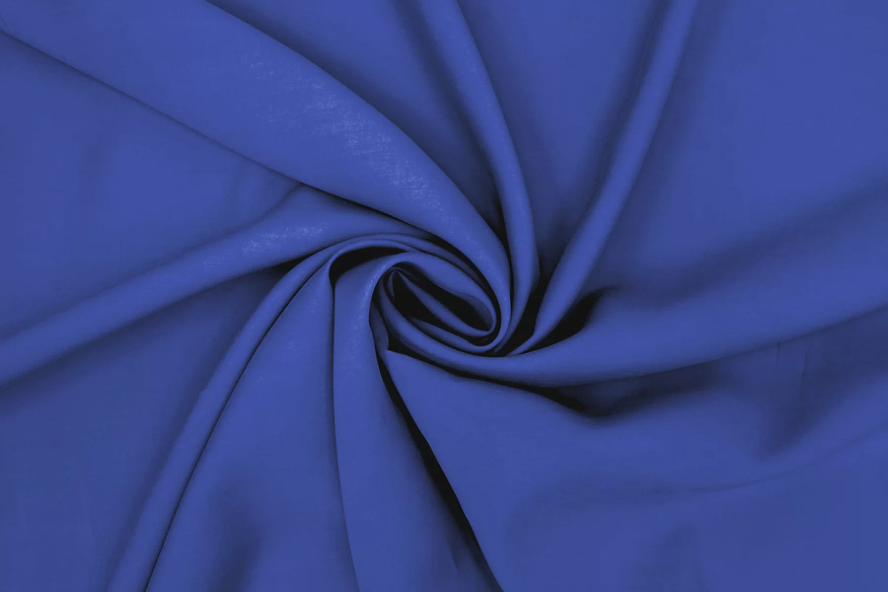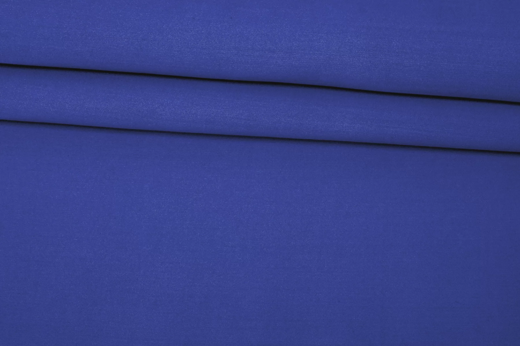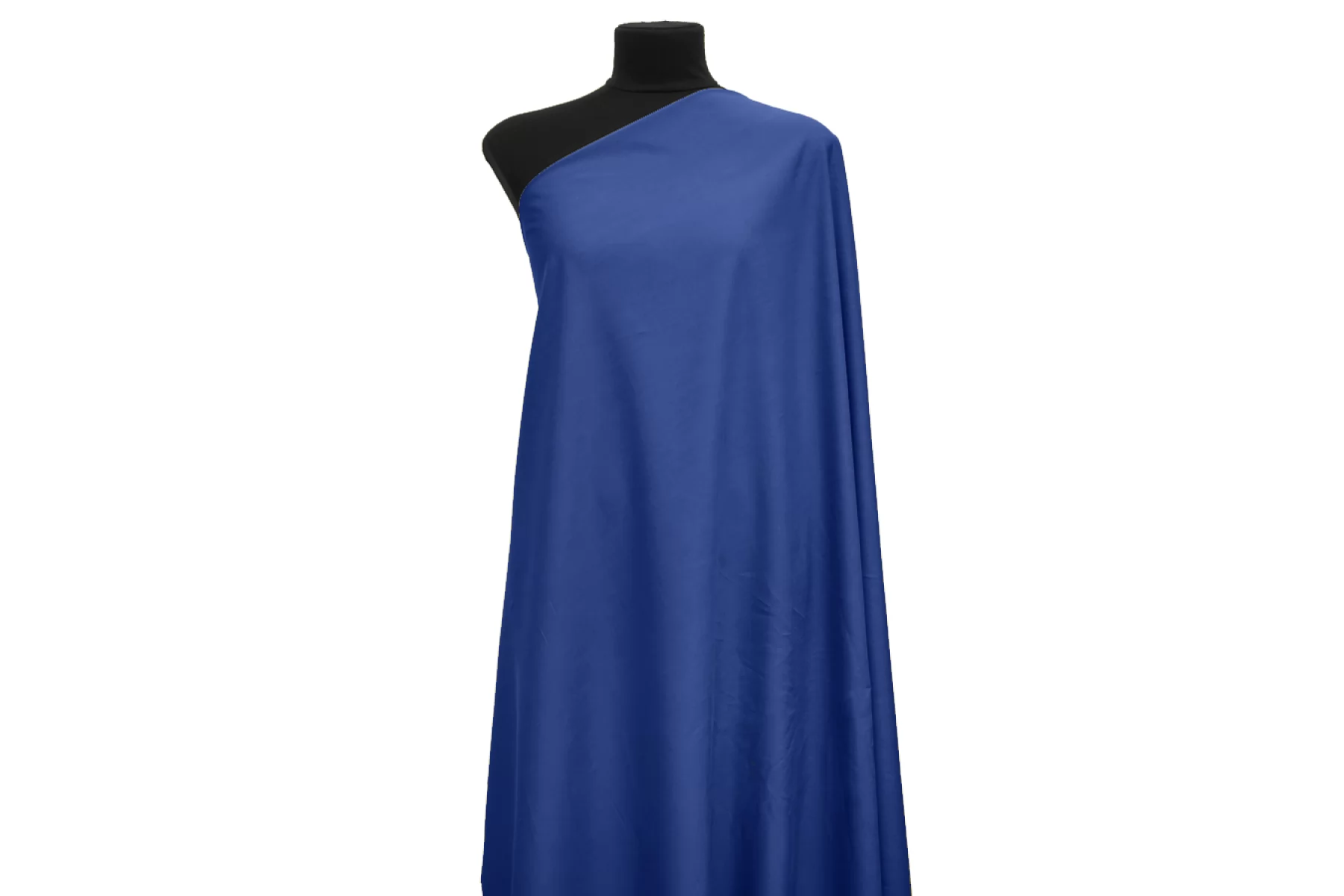 Плательная купра приятного синего оттенка с легким матовым лоском и с легкой белесостью, свойственной для купры. Материал тактильно очень приятный, мягкий, слегка напоминает замшу на ощупь. В основу материала вплетены нити нейлона, что позволяет лучше держать складки и форму. Не тянется. Сминается. Прекрасно смотрится в своей пластике и движении. Не просвечивает, но заметен контур силуэта, если смотреть прямо на просвет. Вариант на платья, рубашки, брюки, юбки и не только. При необходимости используйте подкладочный материал.
