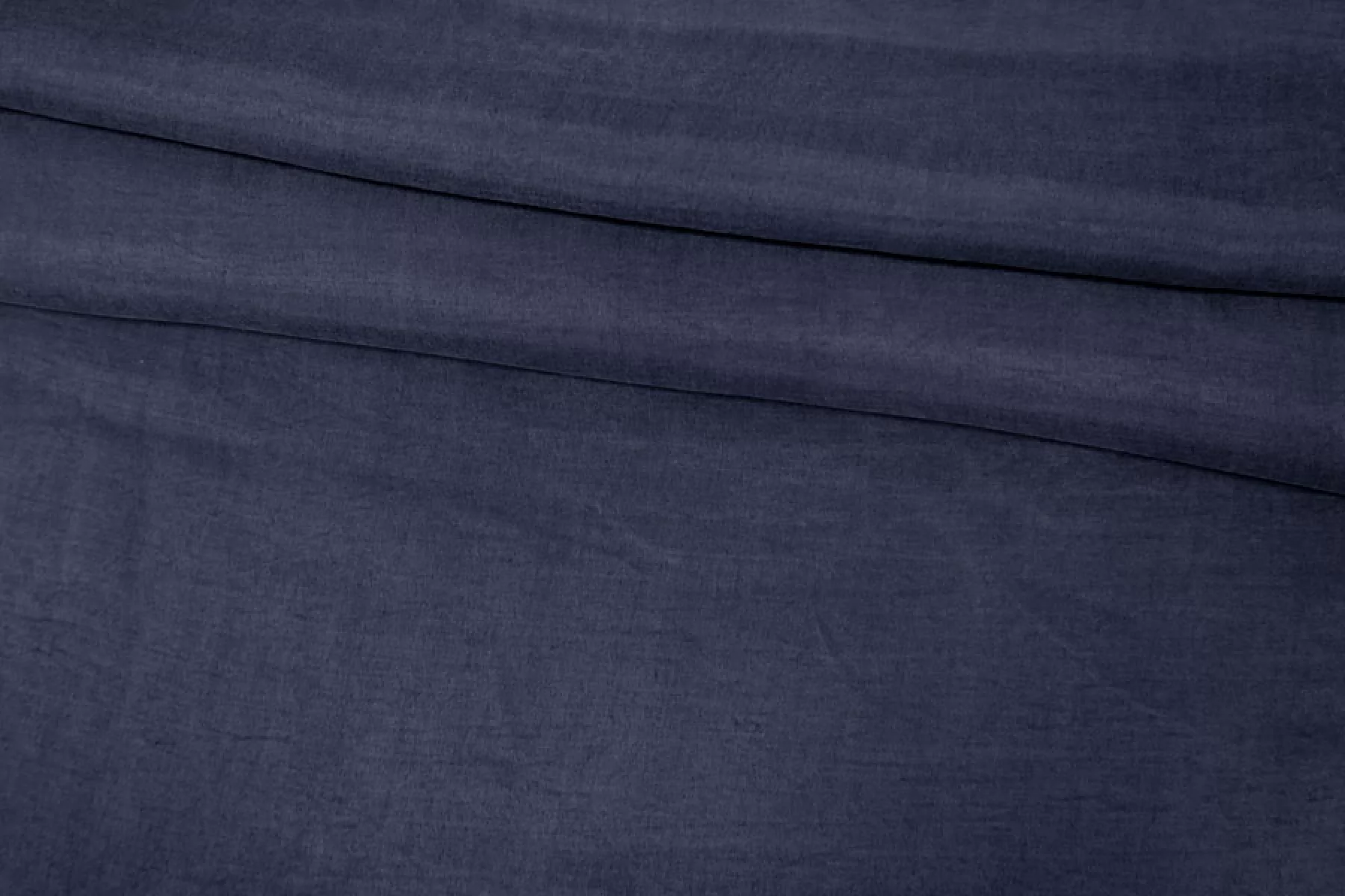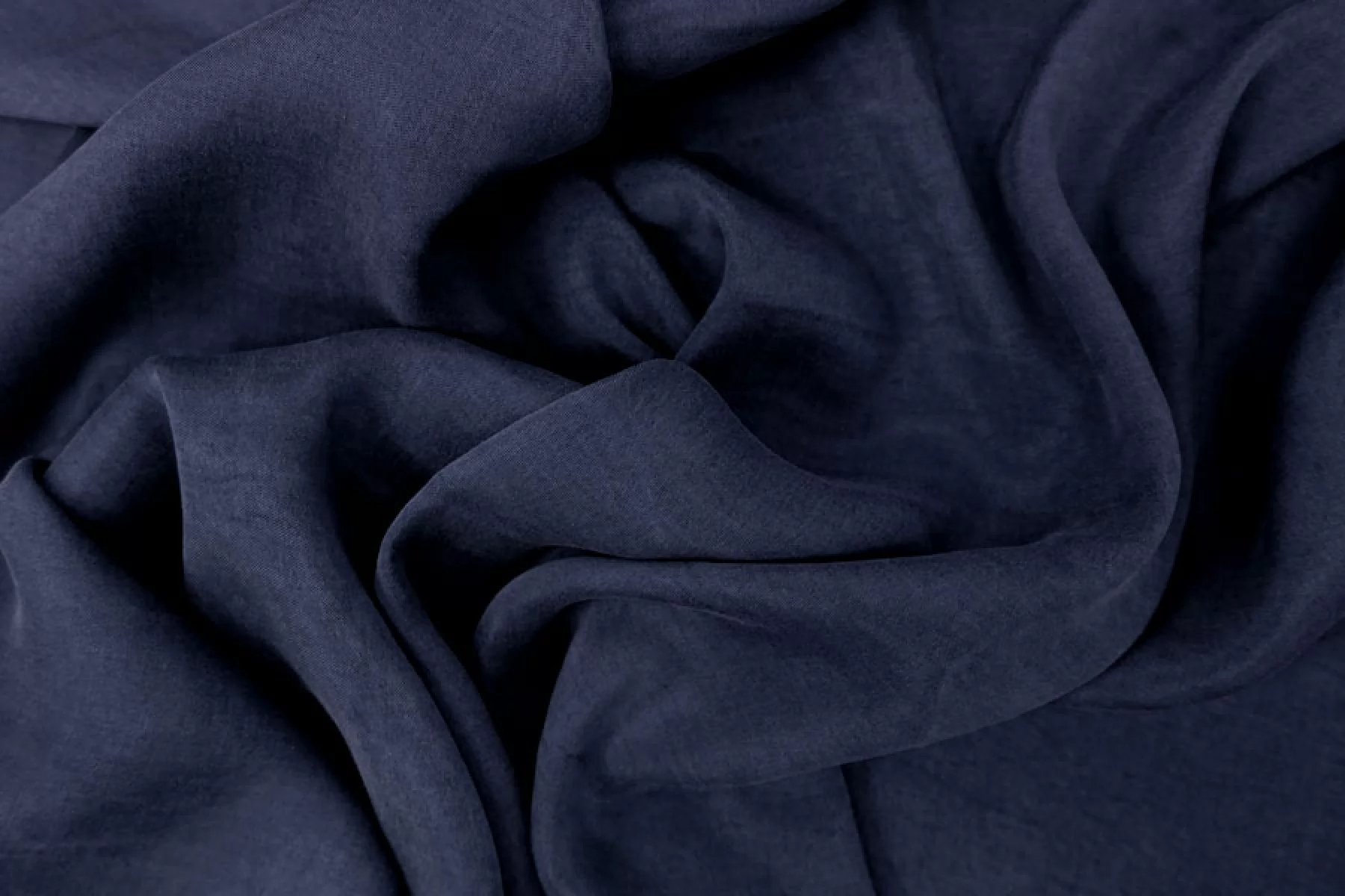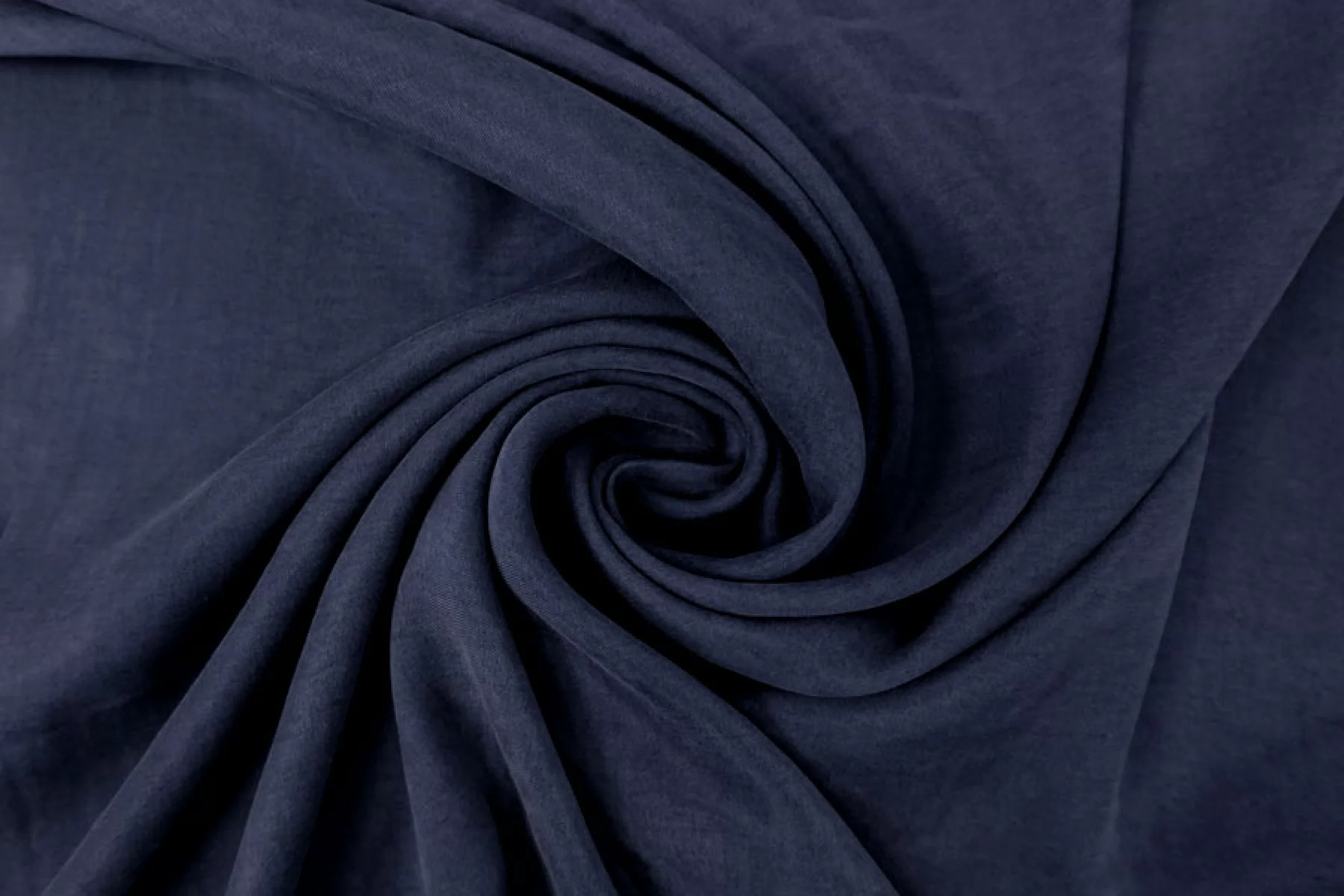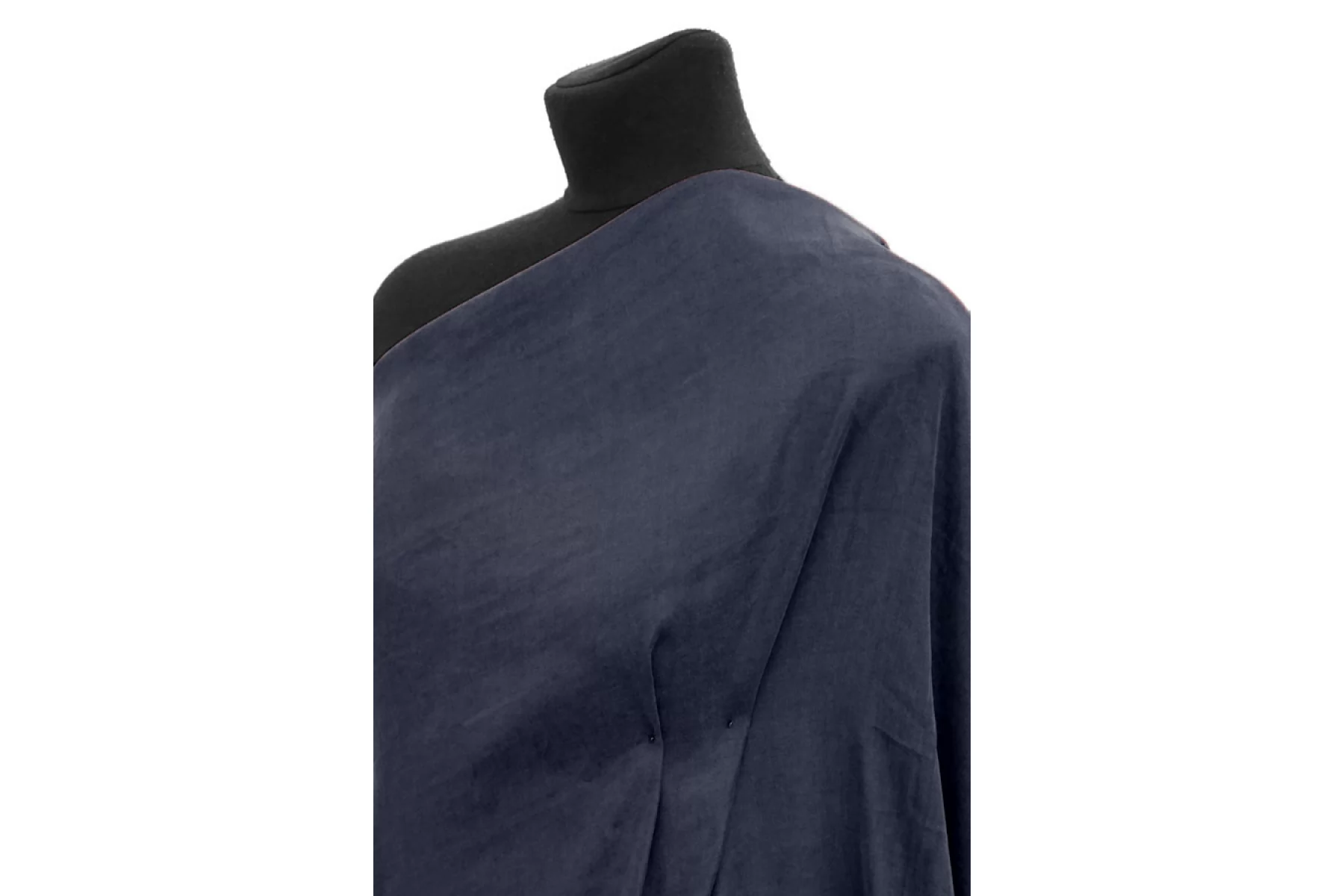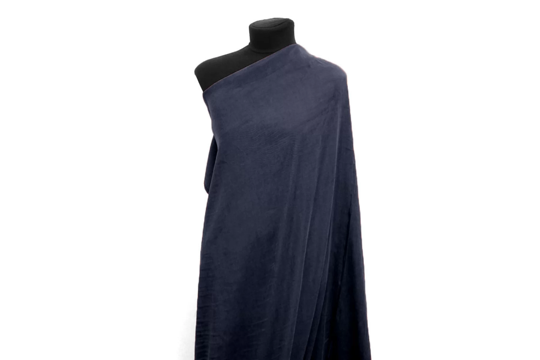 Плательная купра в глубоком темно-синем цвете. Материал тактильно очень приятный, мягкий, очень близок тактильно и визуально к вареному шелку. Плетение немного тянется. Сминается. Прекрасно смотрится в своей пластике и движении. Не просвечивает. Вариант на платья, рубашки, плотные блузки, струящиеся брюки, юбки и не только.