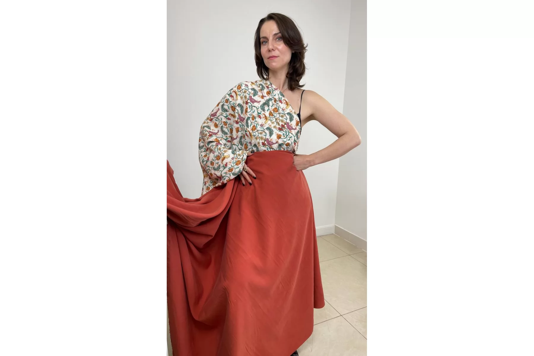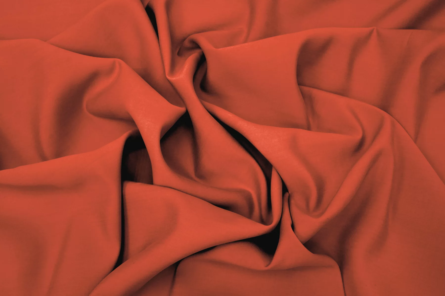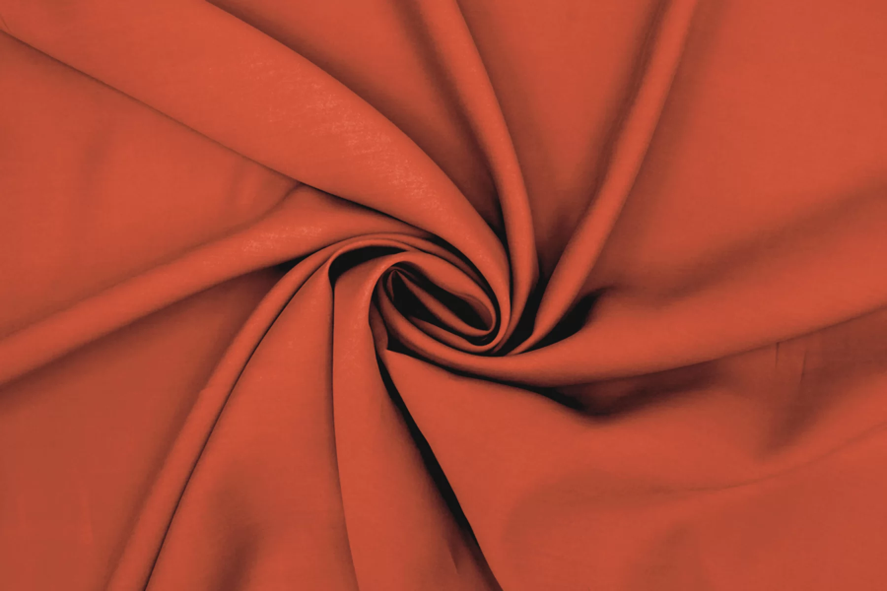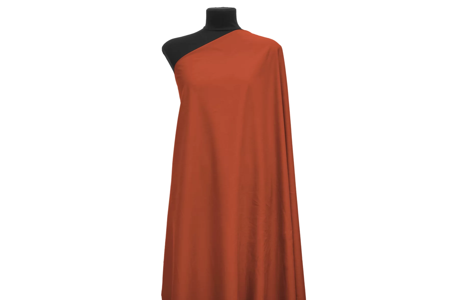 Плательная купра терракотового оттенка с красивым и легким матовым лоском. Материал тактильно очень приятный, мягкий, напоминает замшу на ощупь. В основу материала добавлены нити нейлона, что позволяет лучше держать складки и форму. Не тянется. Сминается. Прекрасно смотрится в своей пластике и движении. Не просвечивает, но заметен контур силуэта, если смотреть на просвет. Шьем платья, рубашки, брюки, юбки и не только. При необходимости используйте подкладочный материал.